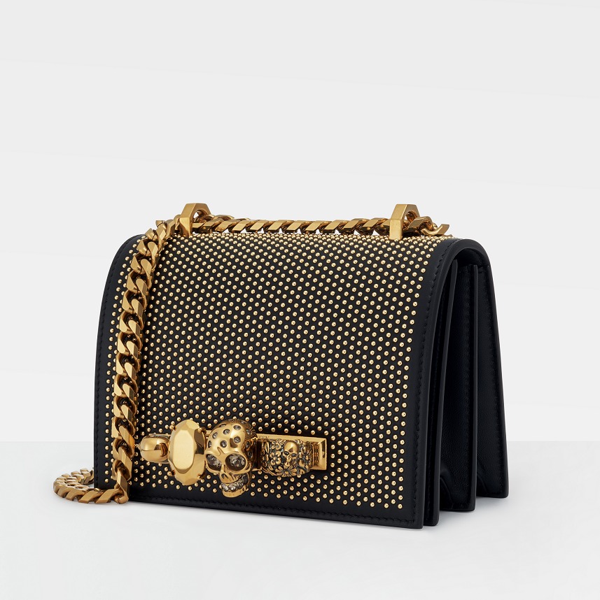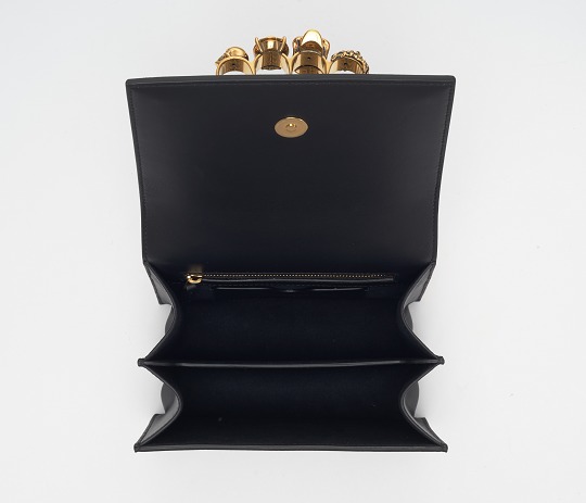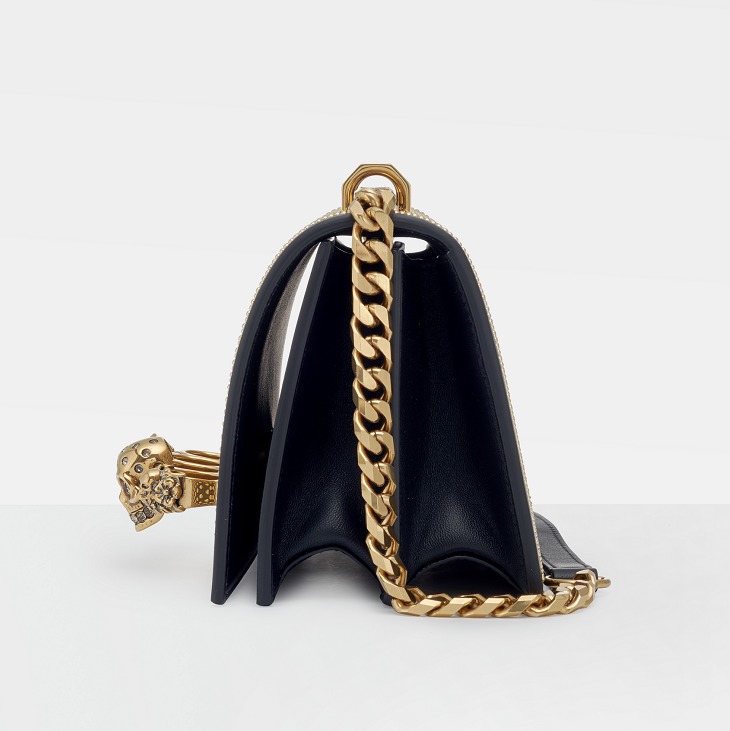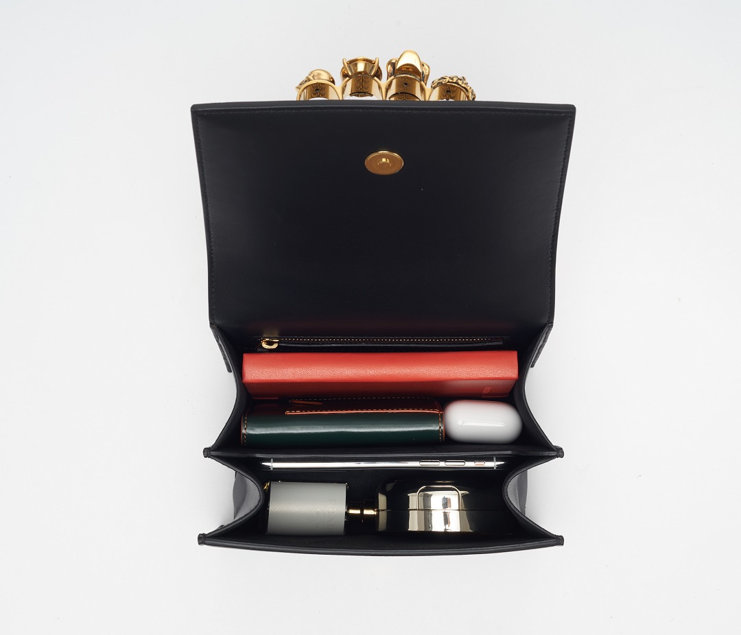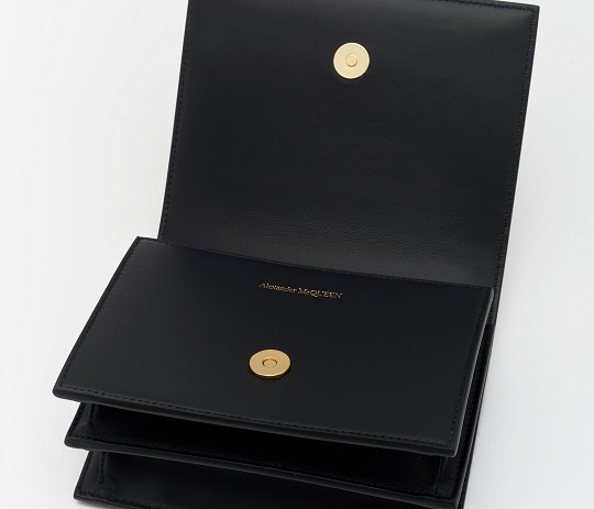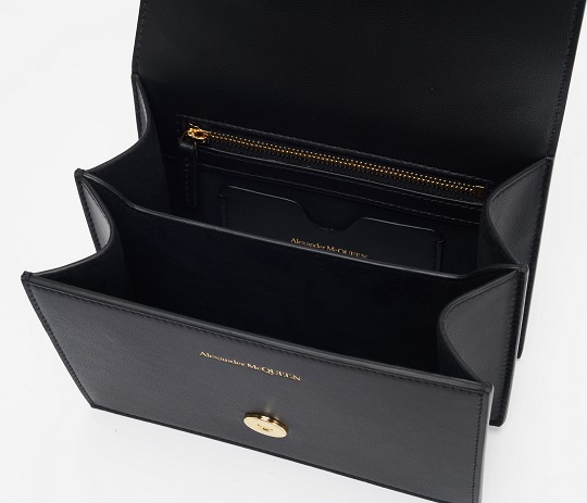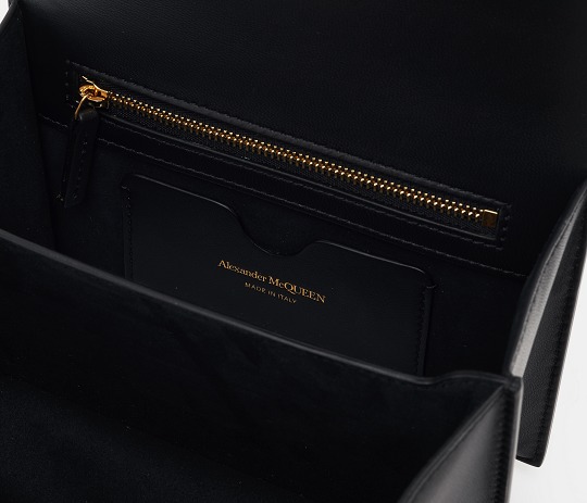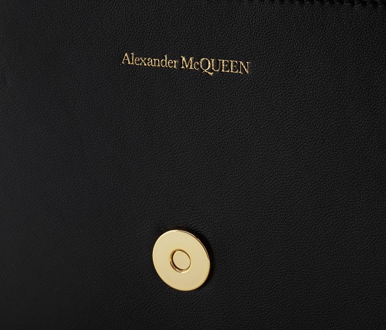 The bag has an accordion structure, and the interior space has a certain degree of ductility. It has a magnetic buckle closure, and the Alexander McQueen logo is printed in gold on the inside; the lining is fine suede .