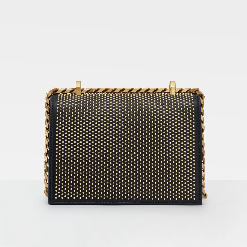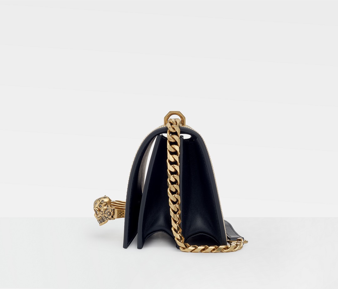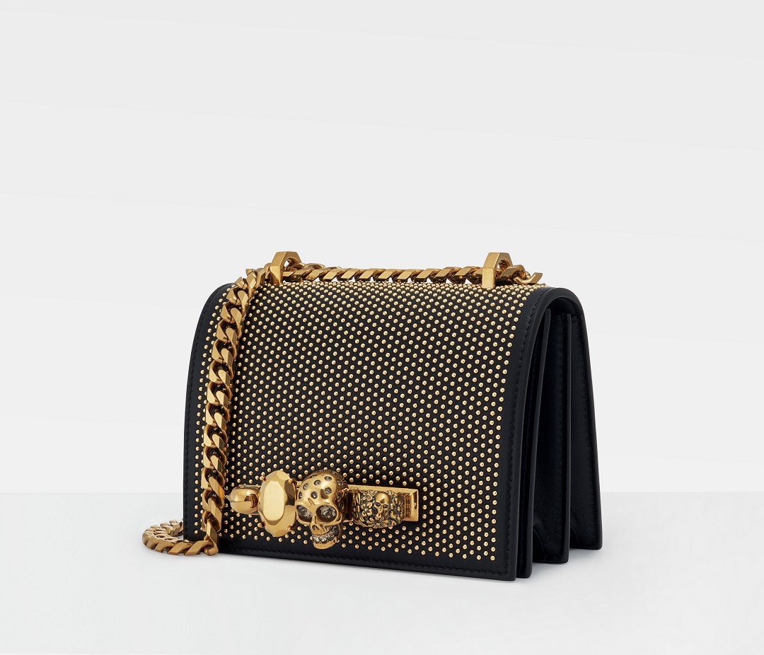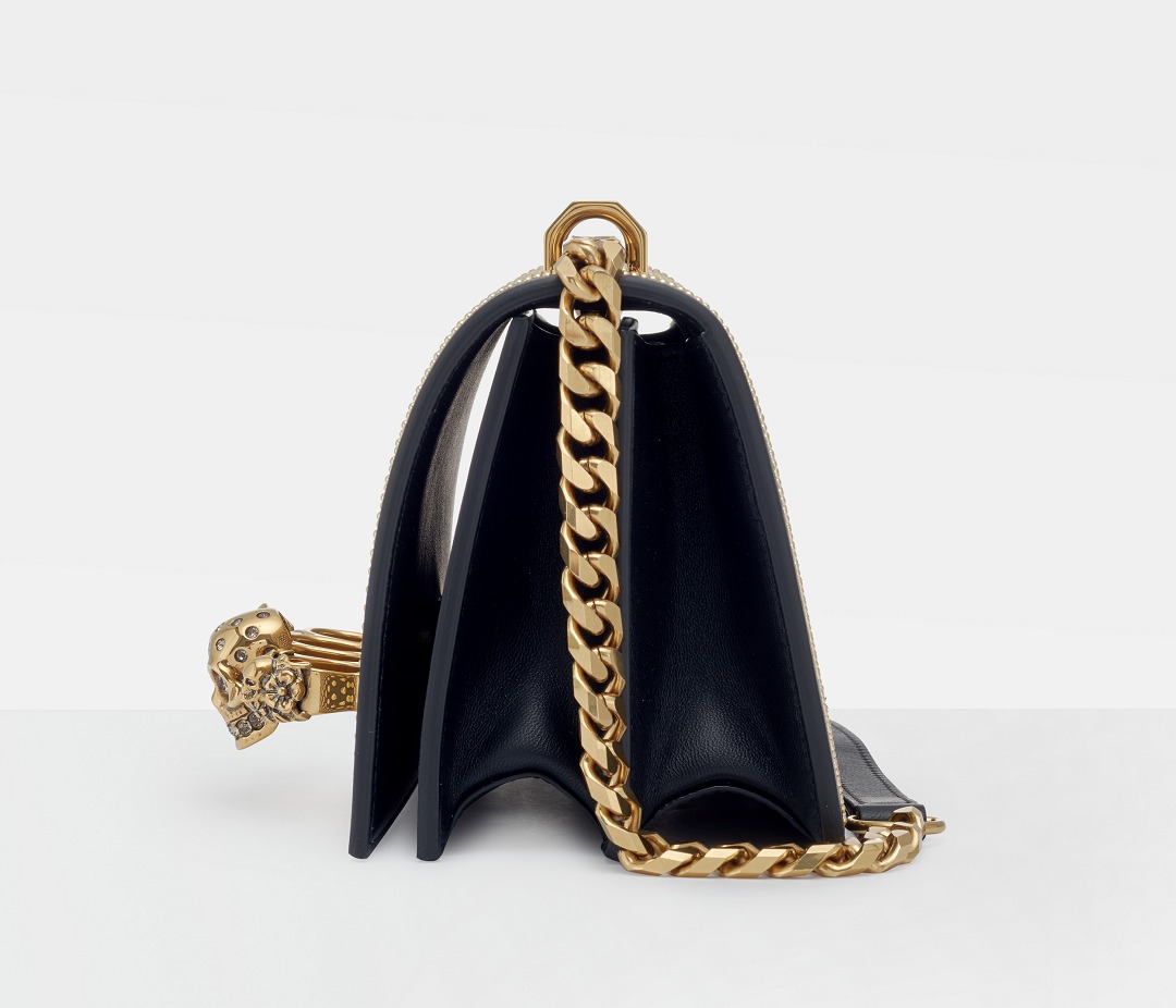 The bag has an accordion structure, and the interior space has a certain degree of ductility. It has a magnetic buckle closure, and the Alexander McQueen logo is printed in gold on the inside; the lining is fine suede .