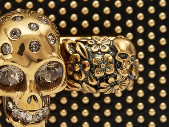 The ring is embellished with three skulls of different shapes, the most eye-catching one being the one on the middle ring, with Swarovski crystals inlaid on the skull, eye sockets and teeth .