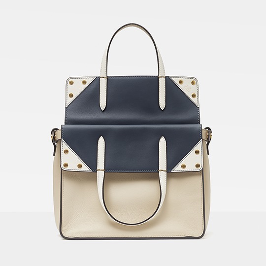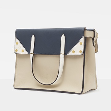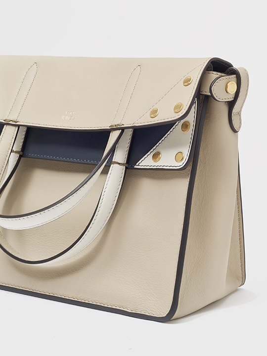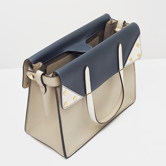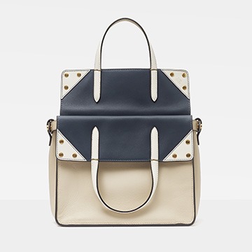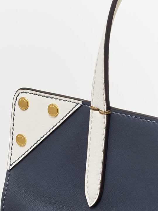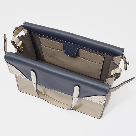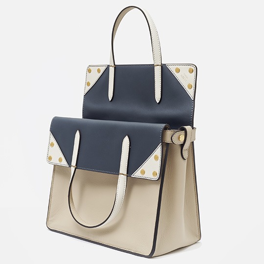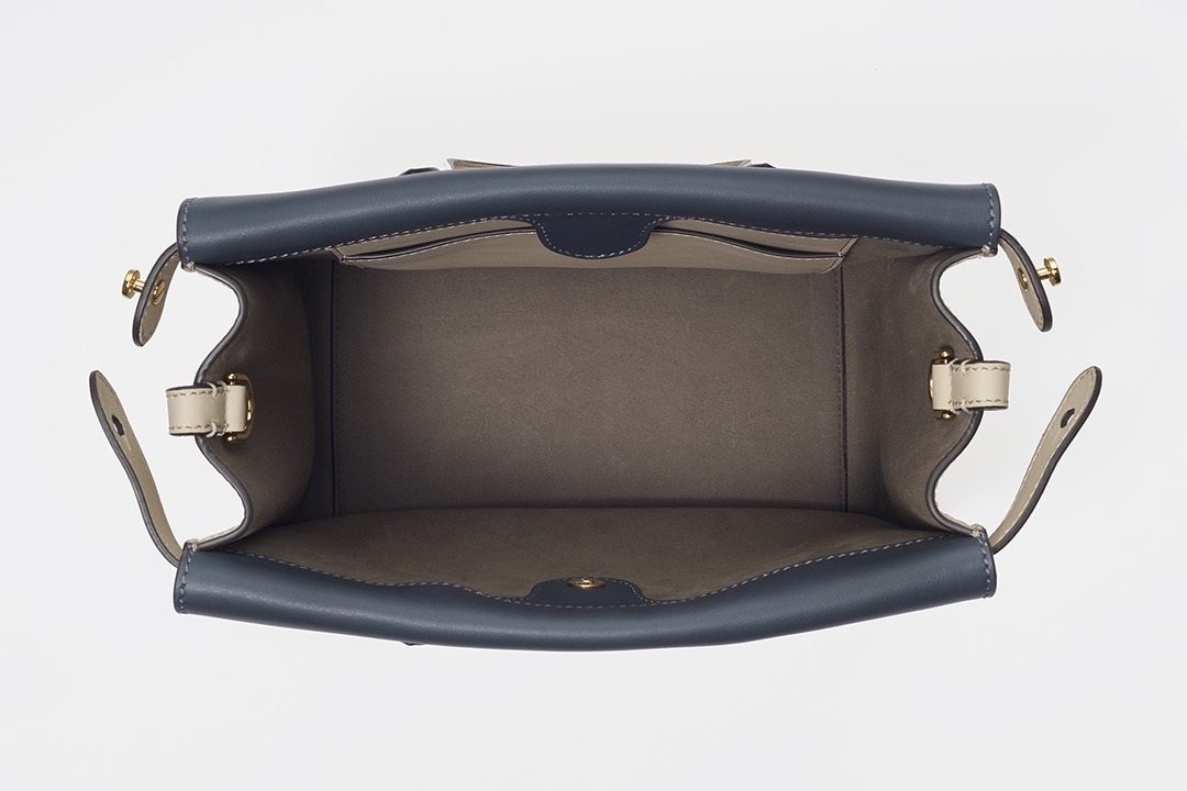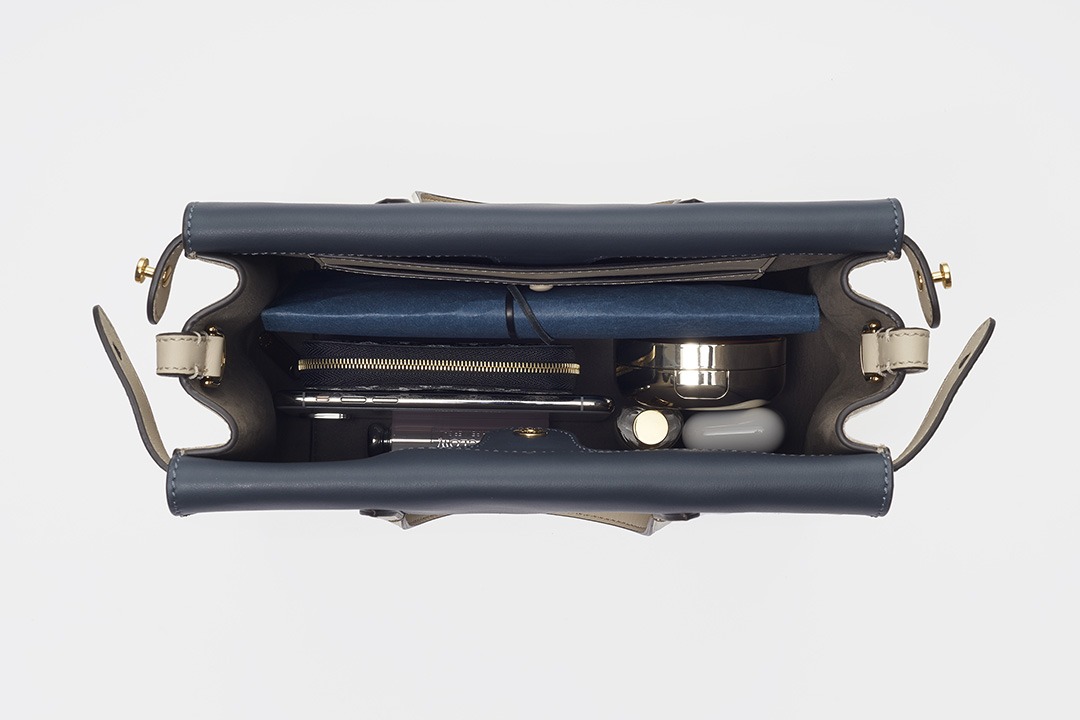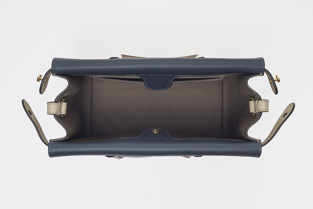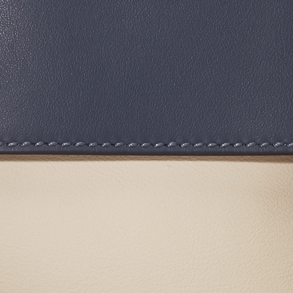 The biggest highlight of the Flip handbag is that it can be switched into multiple styles . The prototype of the bag is a streamlined tote bag , and the contrasting flap and double handle structure on the side give it instant transformation properties. The flaps and handles on both sides fold and hang naturally, and can be held in the hand as a clutch . The beige body of the bag contrasts with the navy blue flap, and the white handles and triangular stitching have a brightening effect. This is the most casual way to carry it, suitable for when there is no heavy object in the bag.