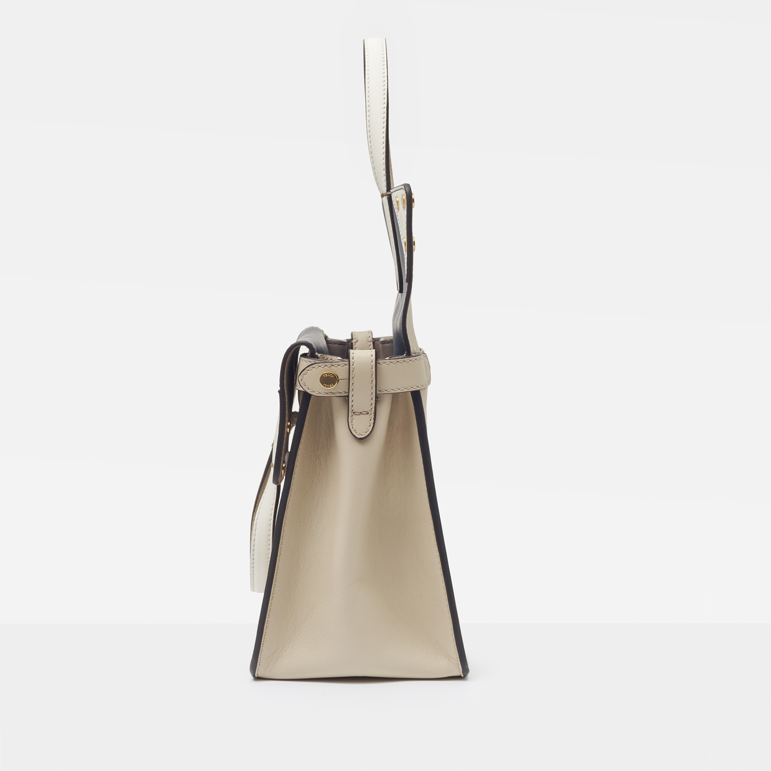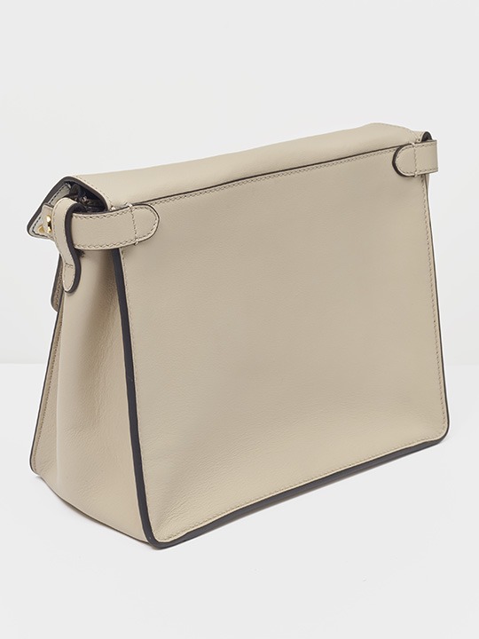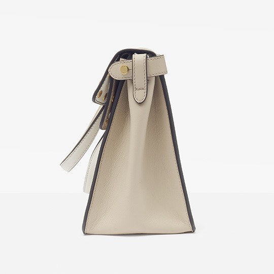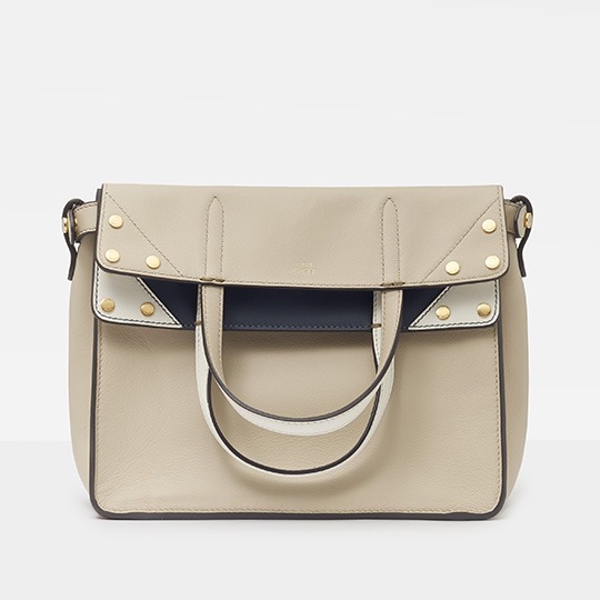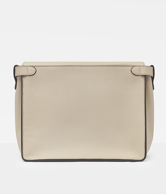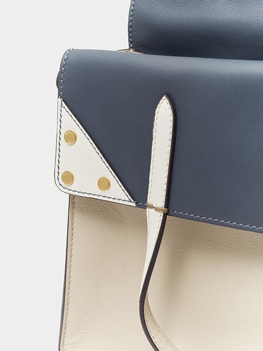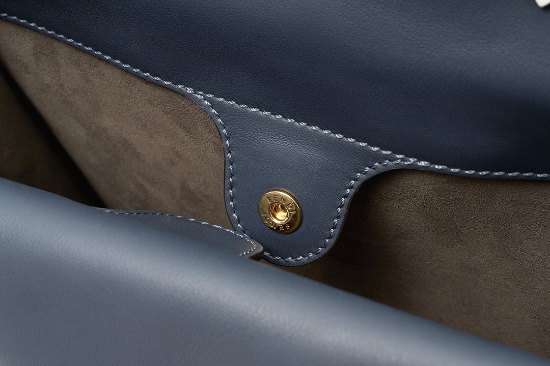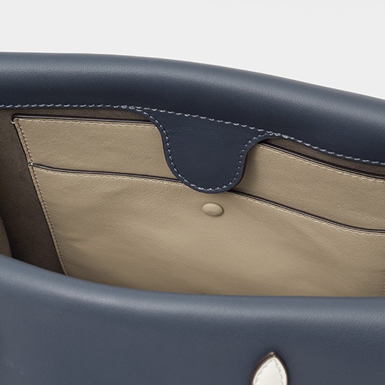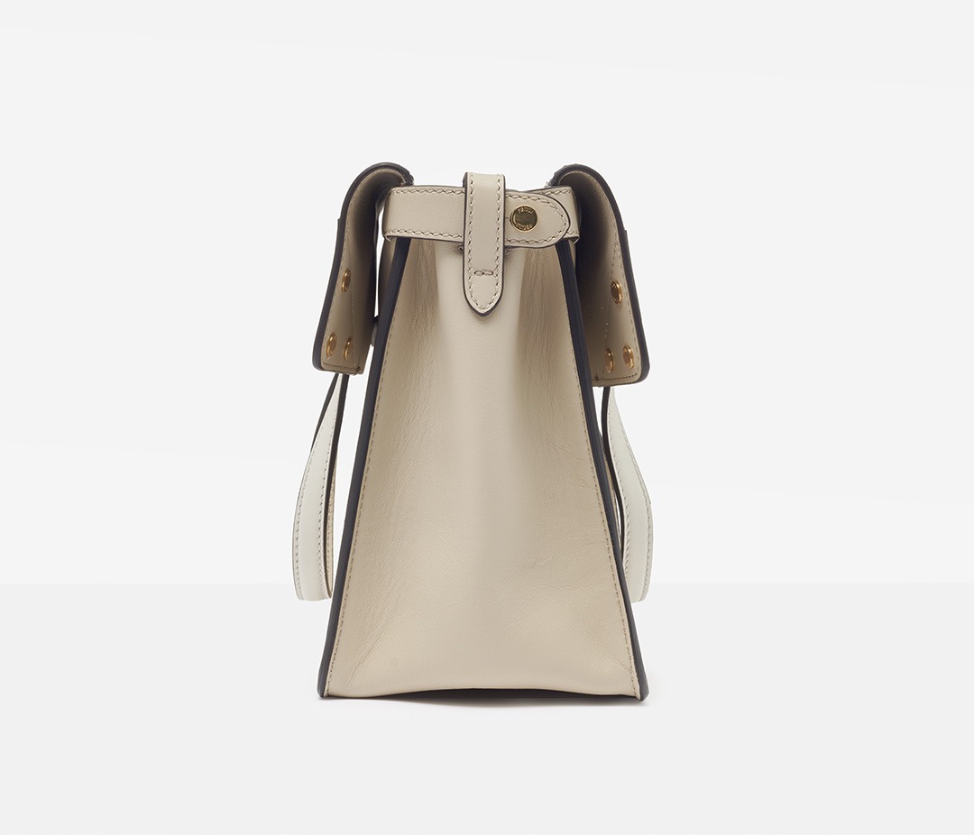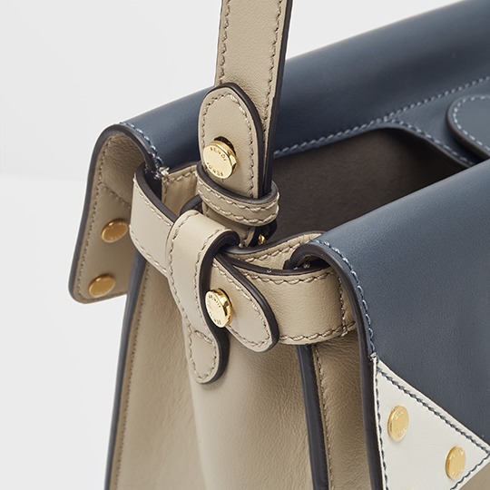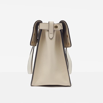 The biggest highlight of the Flip handbag is that it can be switched into multiple styles . The prototype of the bag is a streamlined tote bag , and the contrasting flap and double handle structure on the side give it instant transformation properties. The flaps and handles on both sides fold and hang naturally, and can be held in the hand as a clutch . The beige body of the bag contrasts with the navy blue flap, and the white handles and triangular stitching have a brightening effect. This is the most casual way to carry it, suitable for when there is no heavy object in the bag.