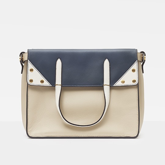 You can also flip up one side of the bag and fold it to the other side, with two handles hanging on the same side, revealing a hint of navy blue edges. Pass your wrist through the handles and hold the bottom of the bag, casually carry it at your side as a clutch, or add a long shoulder strap to carry it cross-body, like a messenger's messenger bag .