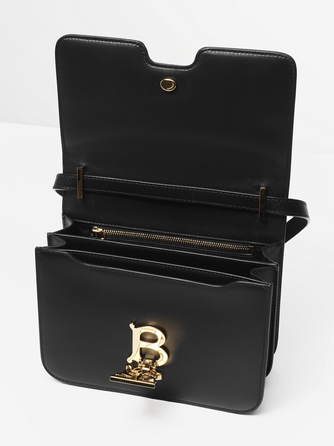The buckle adopts a double-layer structure, and the complete TB logo is fixed on the outside of the bag cover. After opening, the flap can be opened to reveal the magnetic buckle with the letter B on the inside.