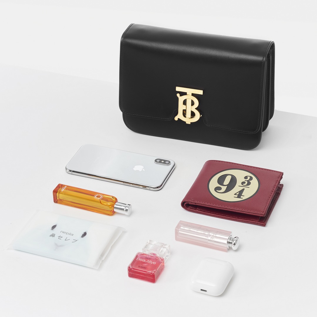The lining of the bag is soft lambskin, which not only reduces the weight of the bag, but also protects important items such as the mobile phone screen from scratches. The words BURBERRY MADE IN ITALY are hot-stamped below the zipper. The interior is designed with double compartments, with a zippered flat pocket on the back and a small compartment on the front for storing personal items such as cards and keys, or putting your phone in it for easy access. The actual capacity of the bag is much larger than it looks. We used it to carry a short wallet, an iPhone X, a bottle of perfume, a lip gloss, a pack of tissues, a bottle of eye drops and a pair of Airpods without affecting the appearance of the bag at all.