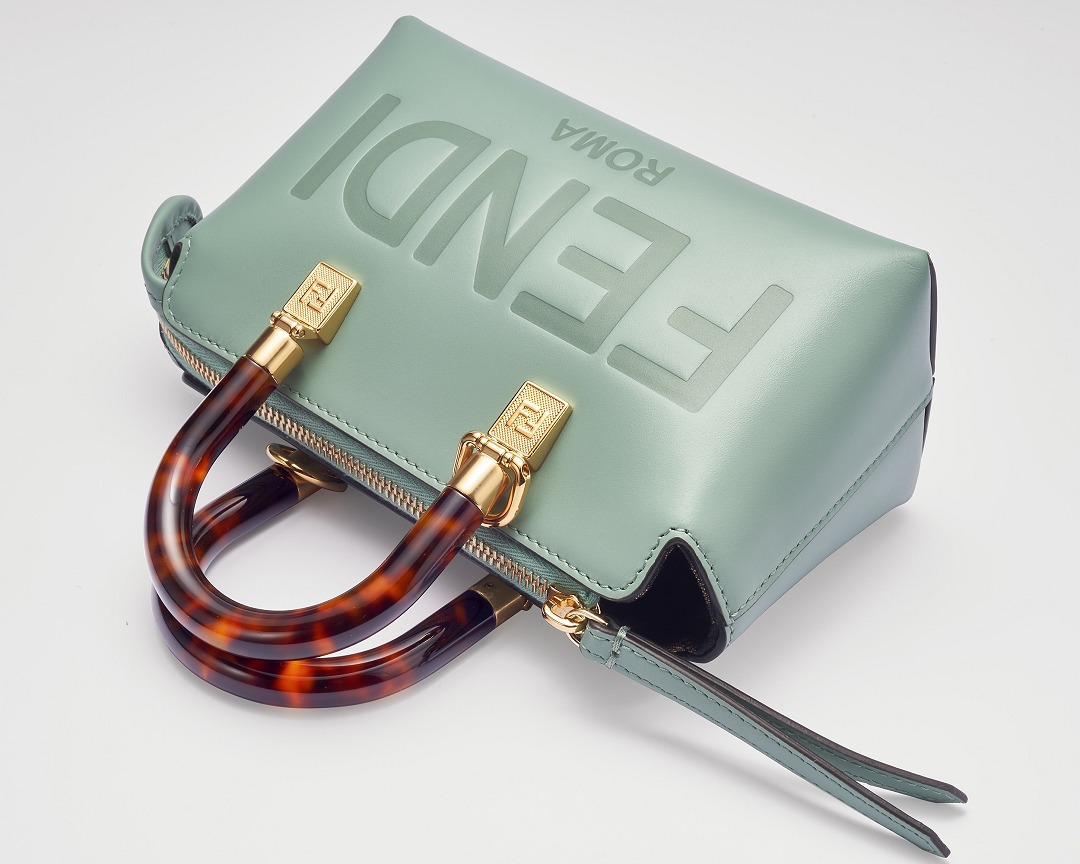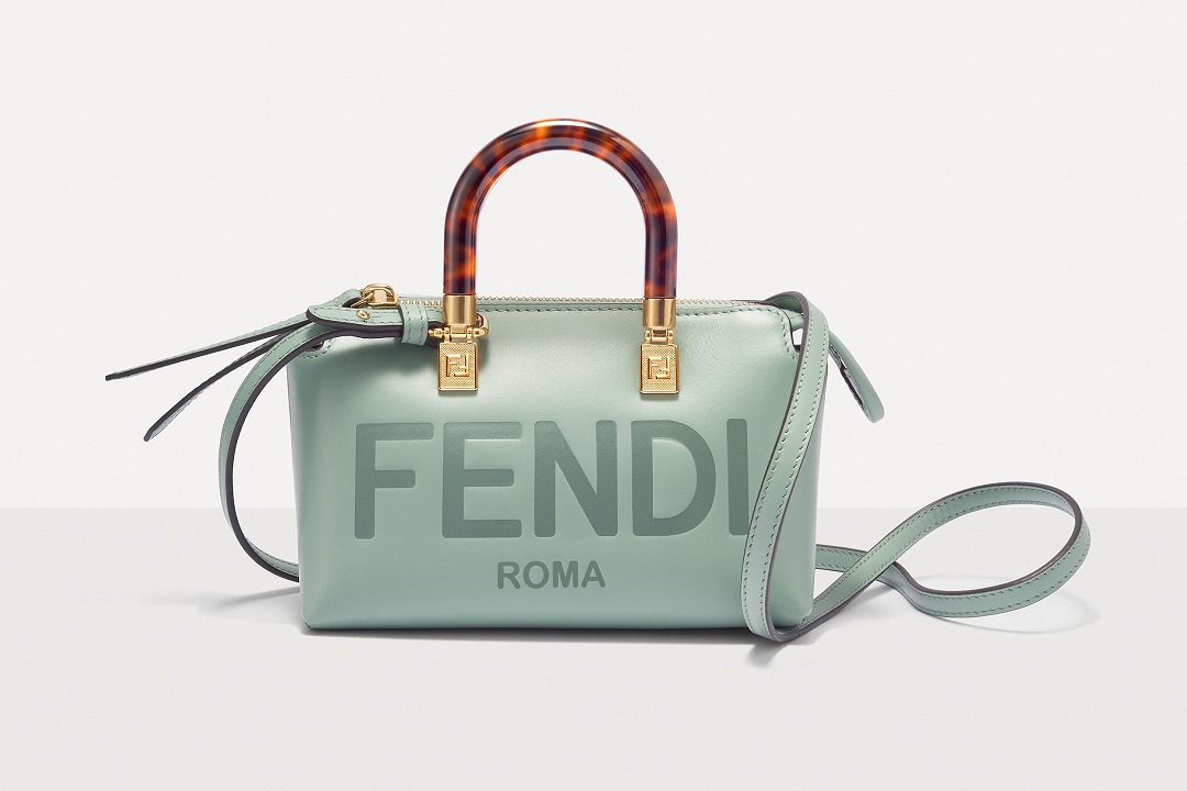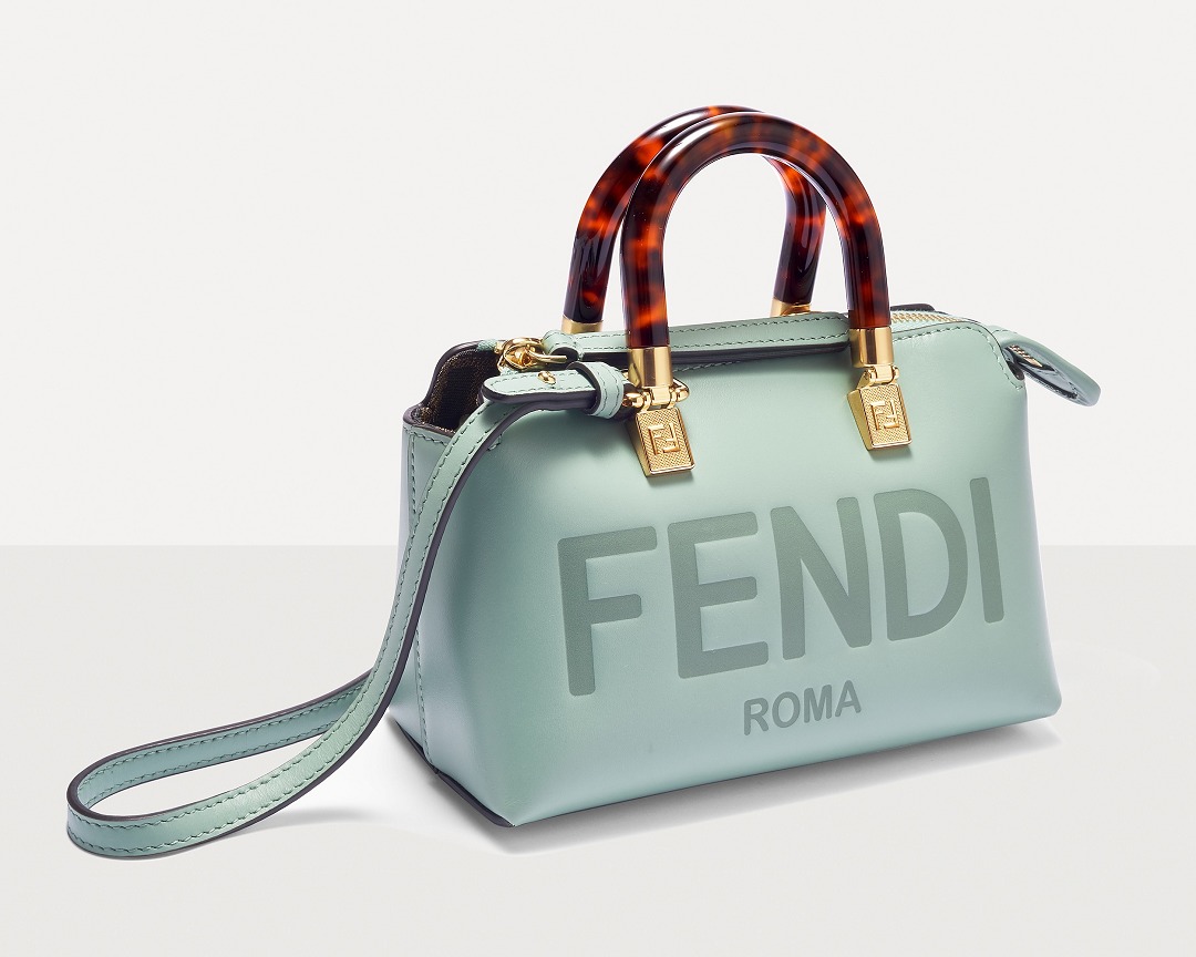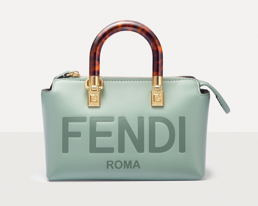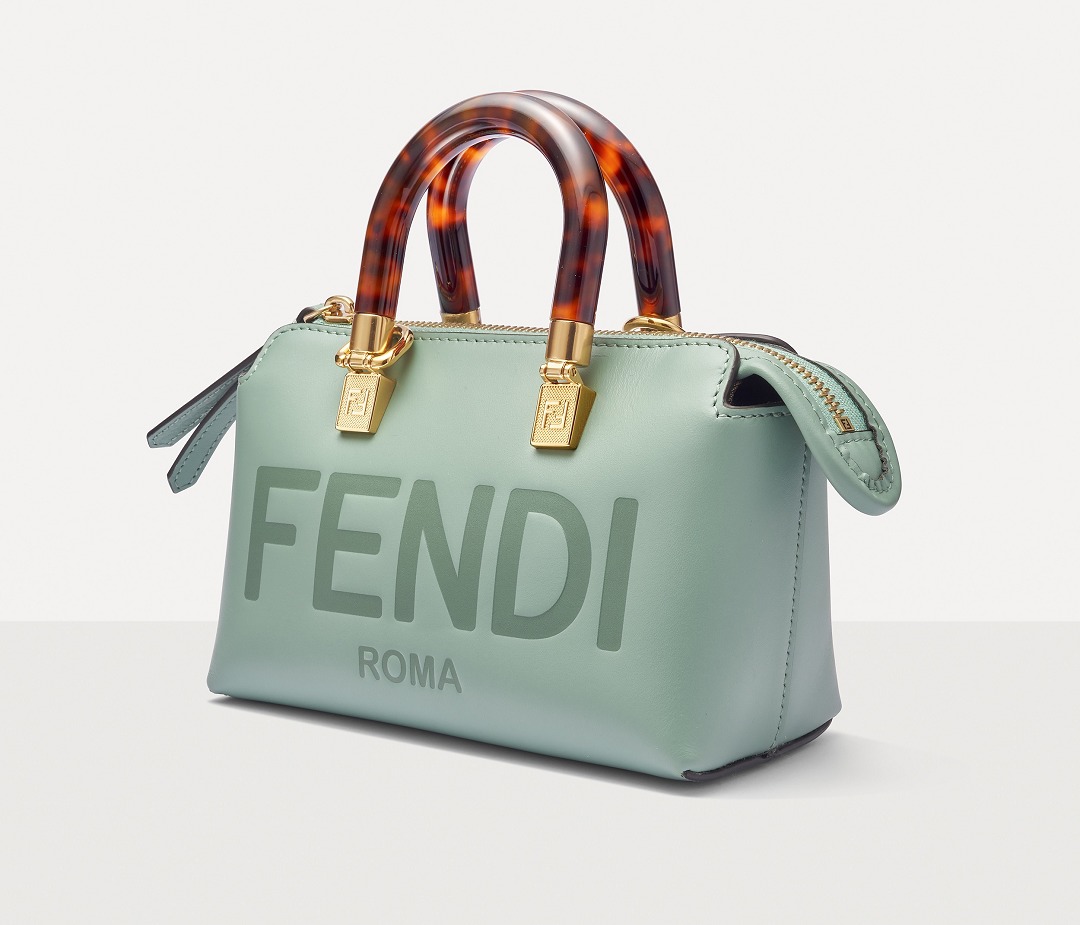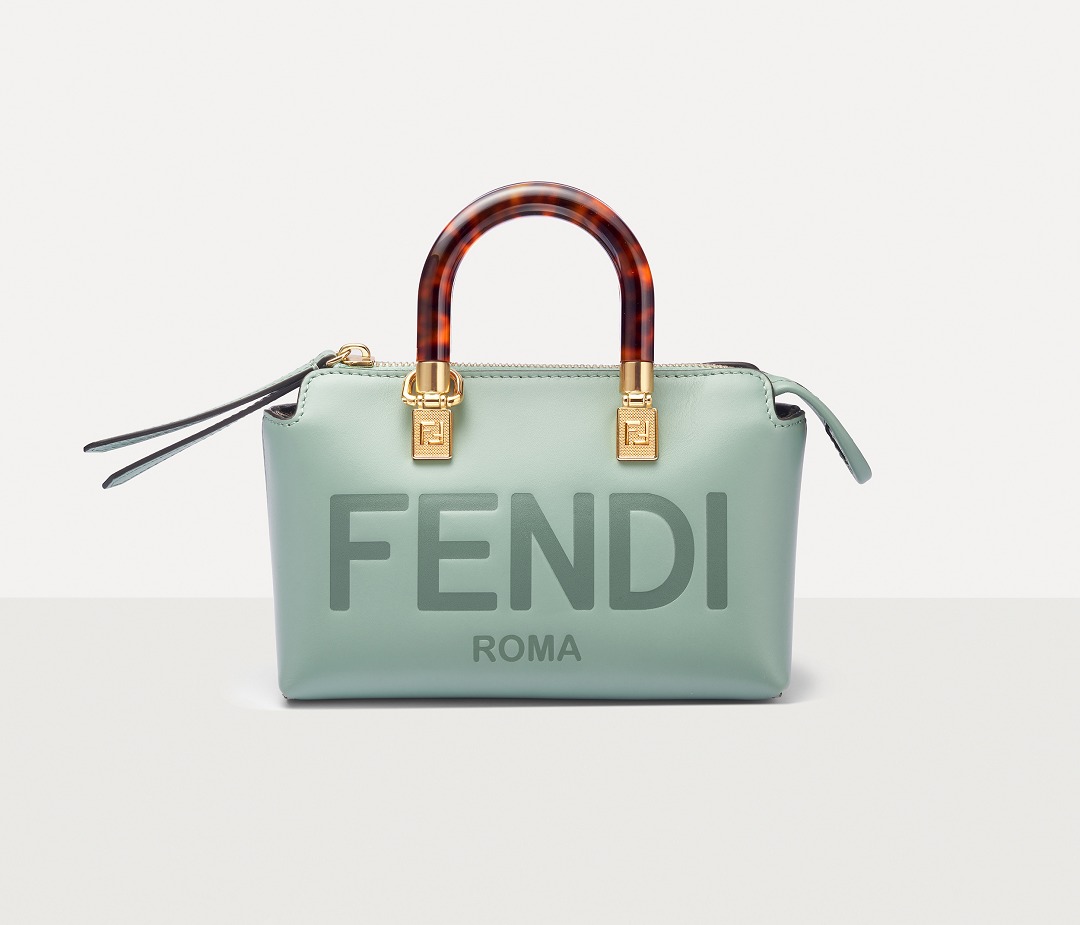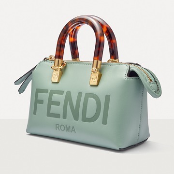 Following the trend of pocket bags, the FENDI By The Way Boston bag launches a new Mini size in the fall and winter of 2022. The small bag is paired with a tortoiseshell plexiglass handle , FF embossed metal decoration and the recognizable FENDI ROMA logo. The detachable shoulder strap allows for hand-held and cross-body styling. The mint green color is refreshing and playful.