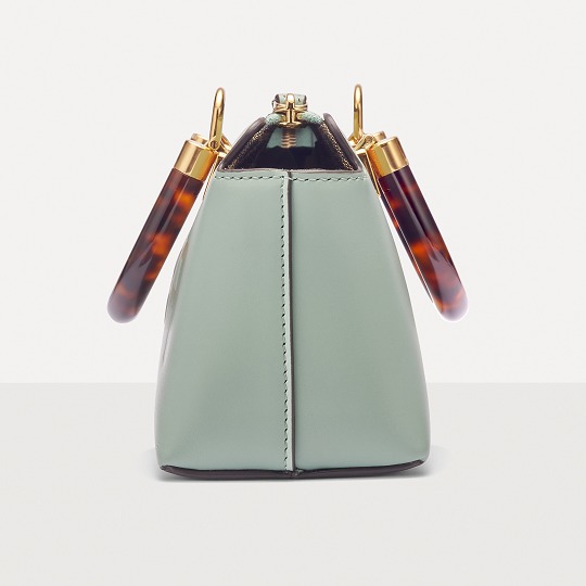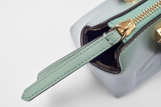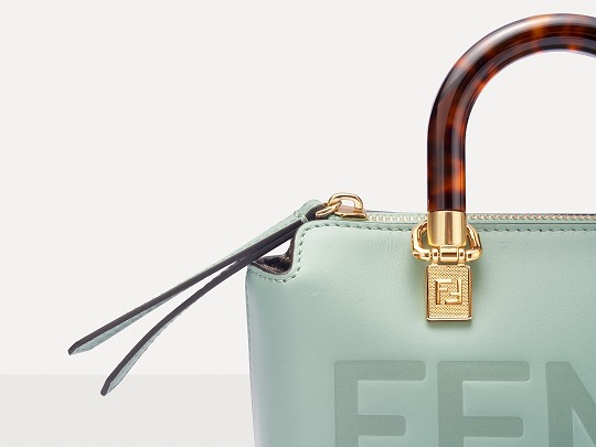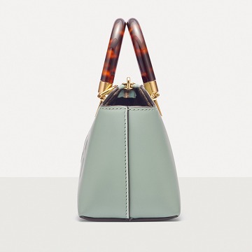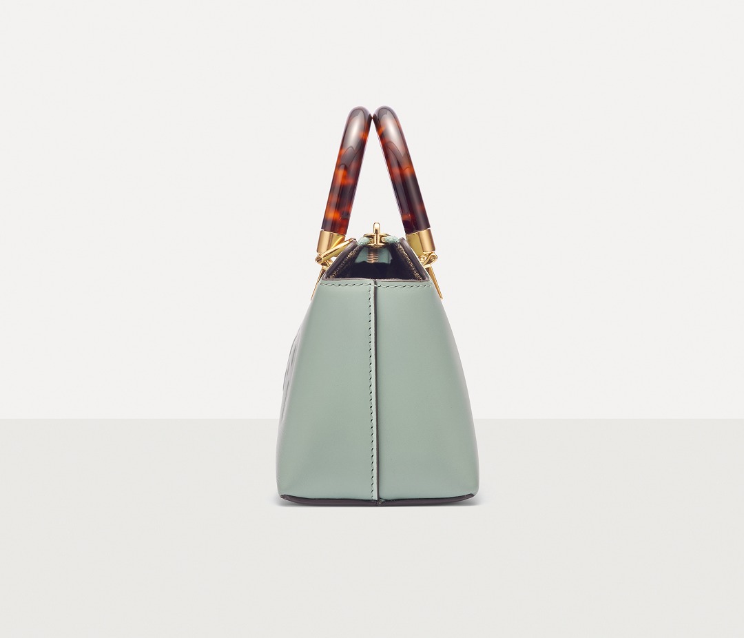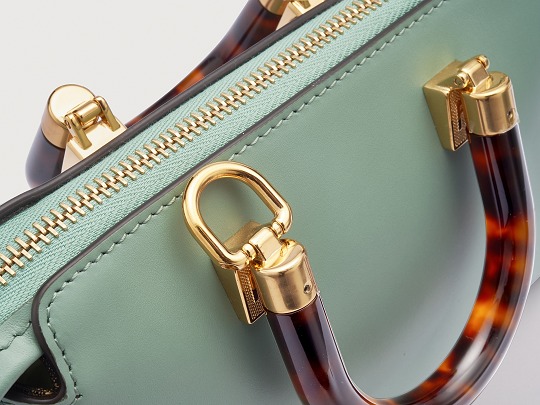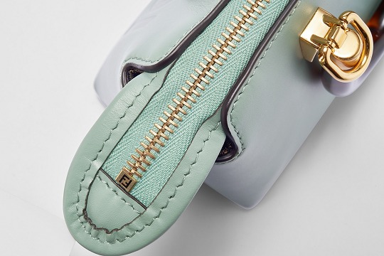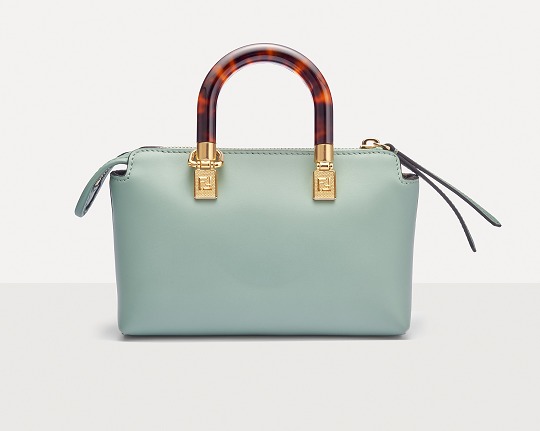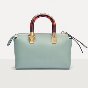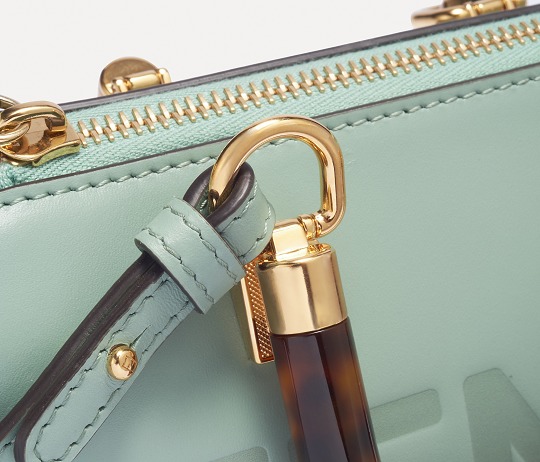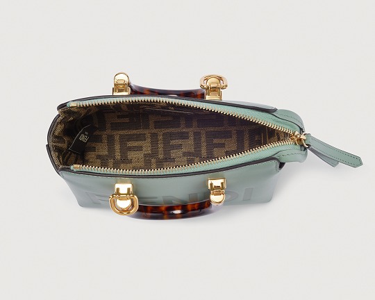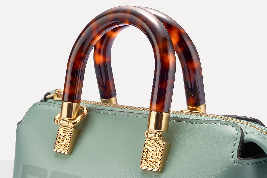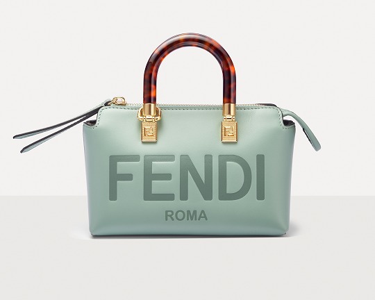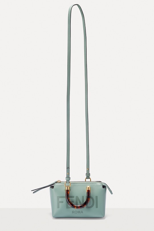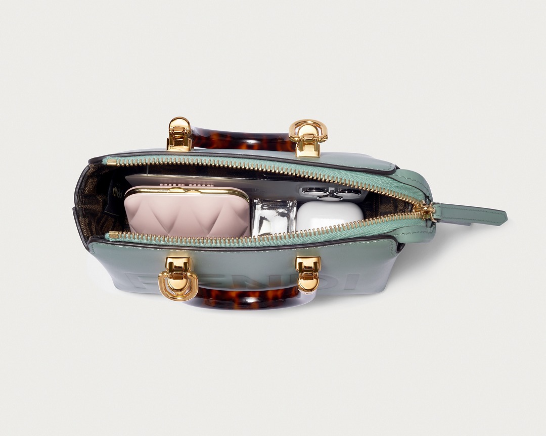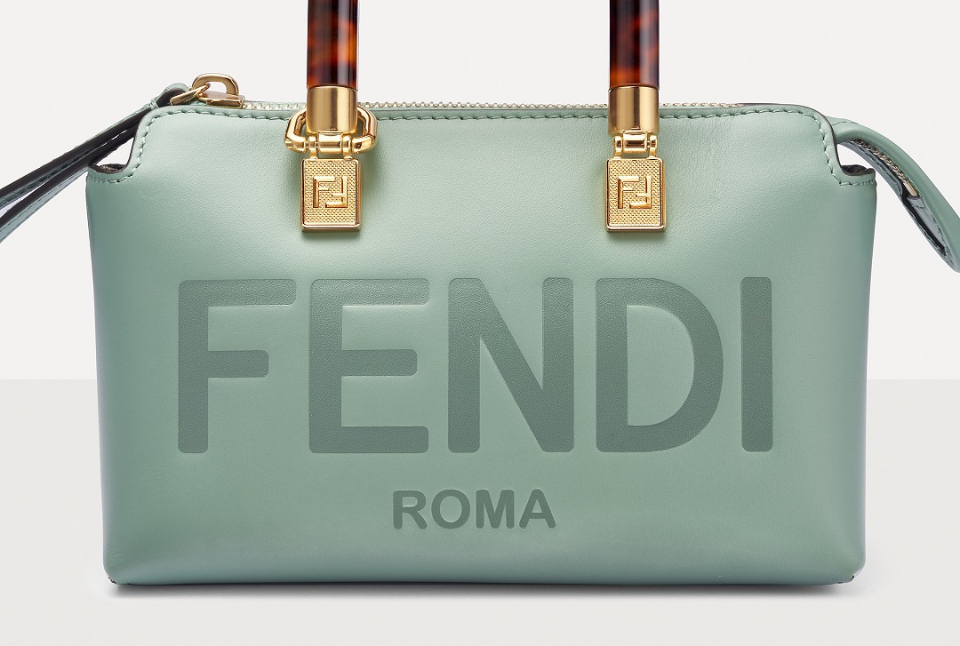 Following the trend of pocket bags, the FENDI By The Way Boston bag launches a new Mini size in the fall and winter of 2022. The small bag is paired with a tortoiseshell plexiglass handle , FF embossed metal decoration and the recognizable FENDI ROMA logo. The detachable shoulder strap allows for hand-held and cross-body styling. The mint green color is refreshing and playful.