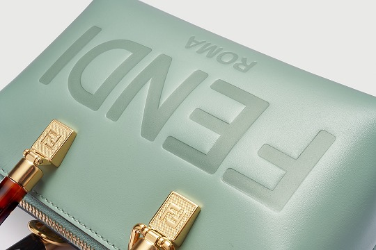 The bag is made of mint green satin calfskin , with the "FENDI ROMA" logo in the same color in the center through hot embossing technology , which has a slightly undulating touch and prominently marks the brand's DNA.