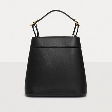 Made of glossy black calfskin , outlined with black stitching and oiled edges , the all-black bag sets off the shining gold VLOGO.