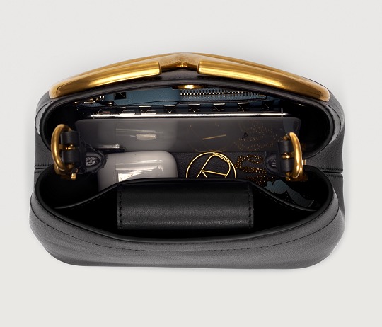 The first thing that comes into view when you open the bag is a Valentino Red leather label with the brand logo printed in gold, which contrasts with the black lambskin lining. The handbag has a crisp shape and a spacious interior with 3 card slots . We put a wallet, mobile phone, napkins, portable perfume, wireless headphones, lipstick and accessories in the bag, and it is still not full. It is more than enough to add makeup products such as powder.