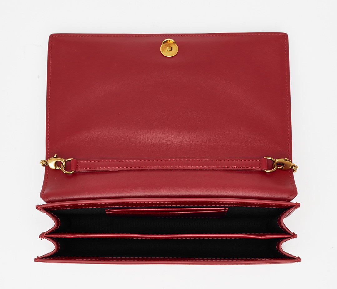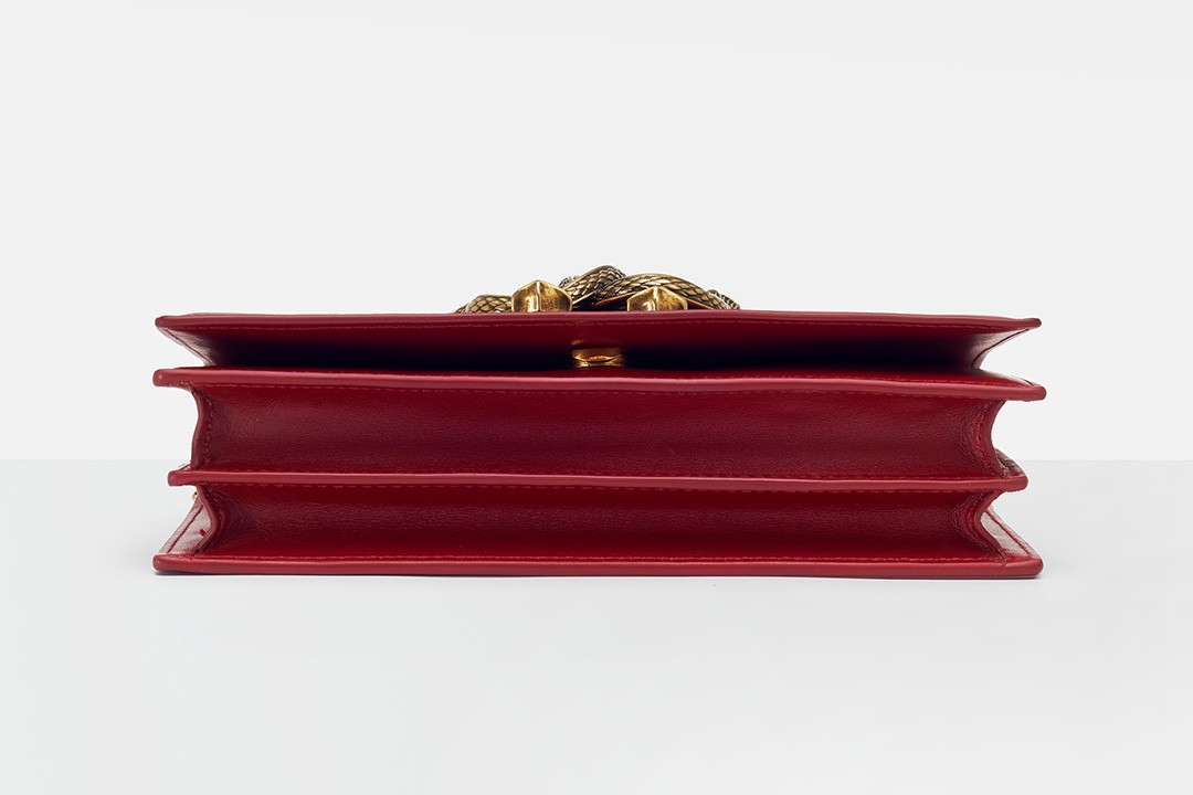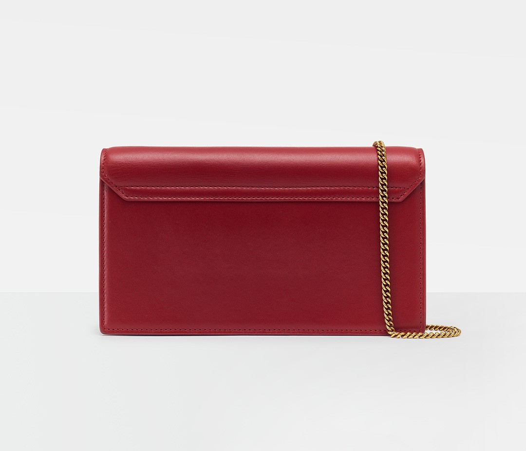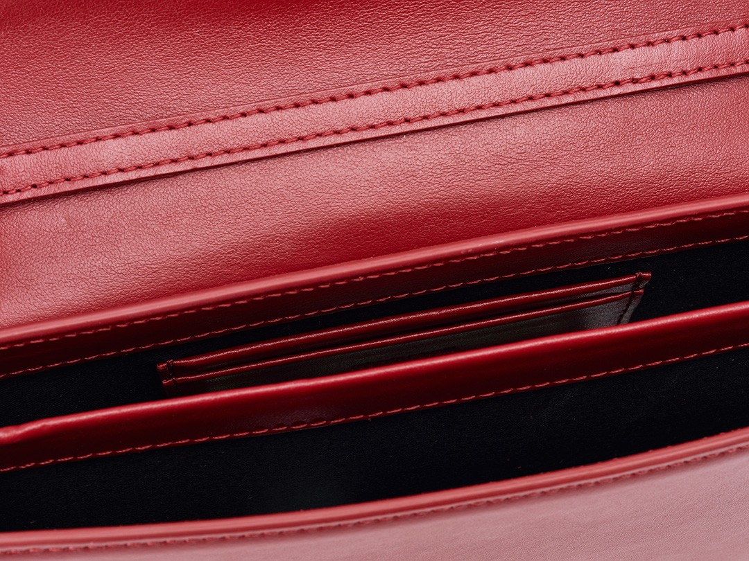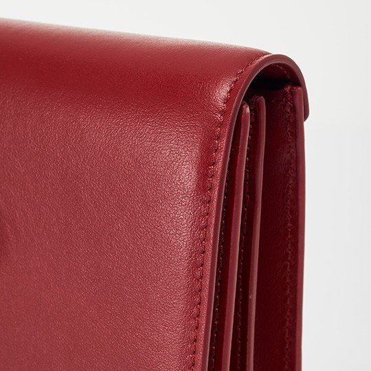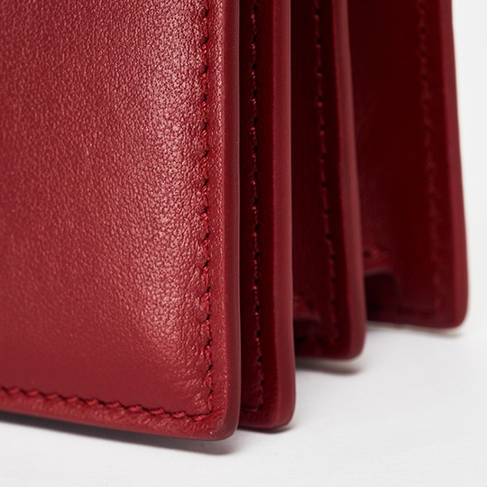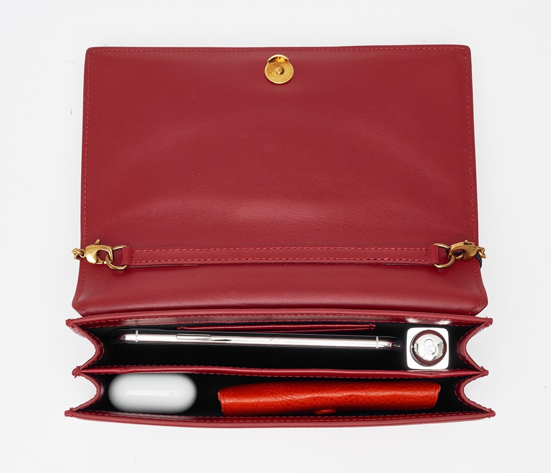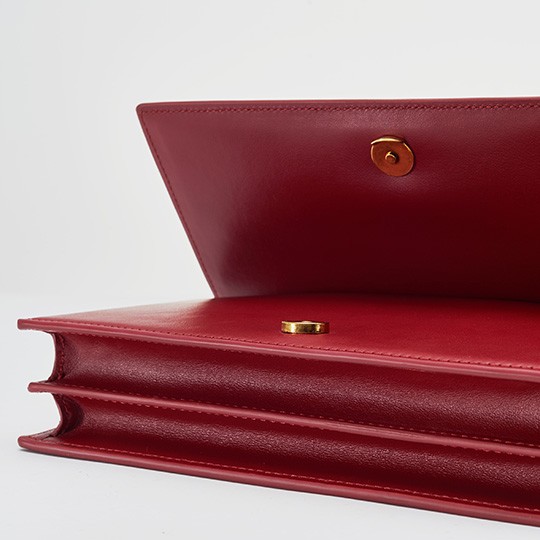The bag has an accordion pleat structure, the calfskin material is stiff and neat, and the red lacquered edges make it more refined. From the side, it looks like a book and is just the right thickness to hold in the hand.