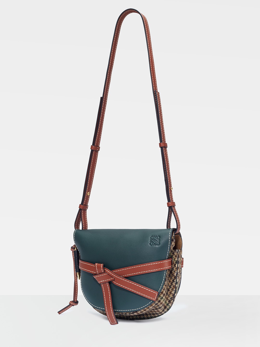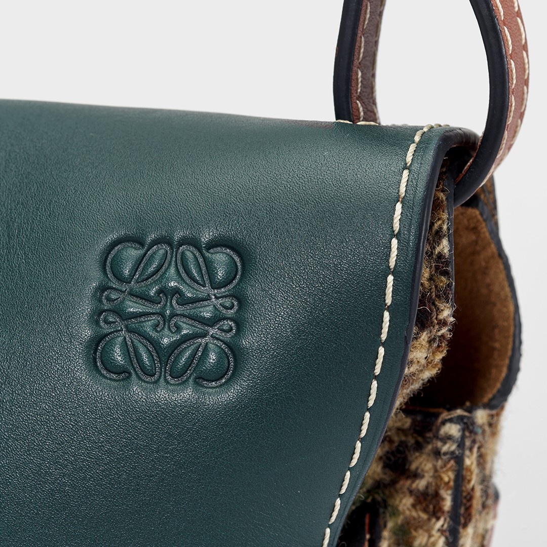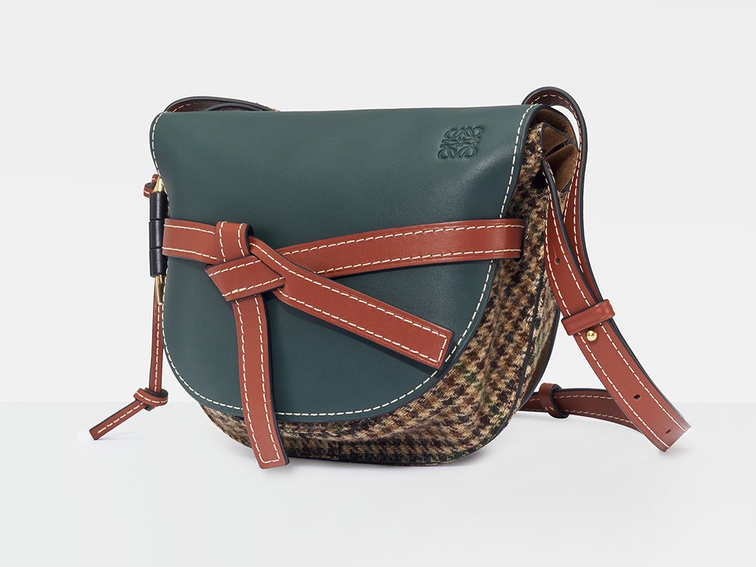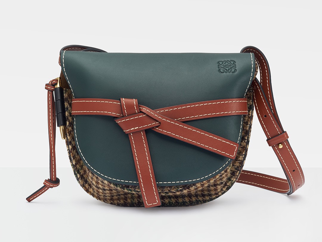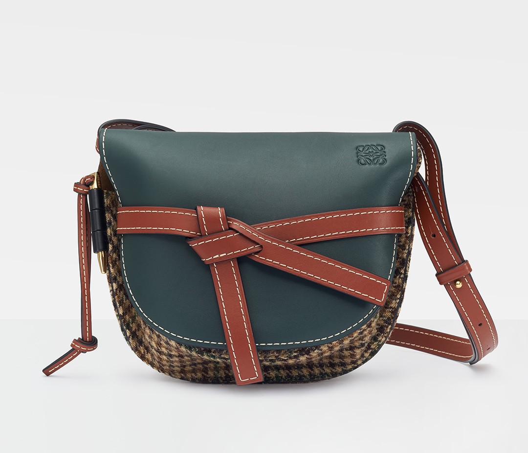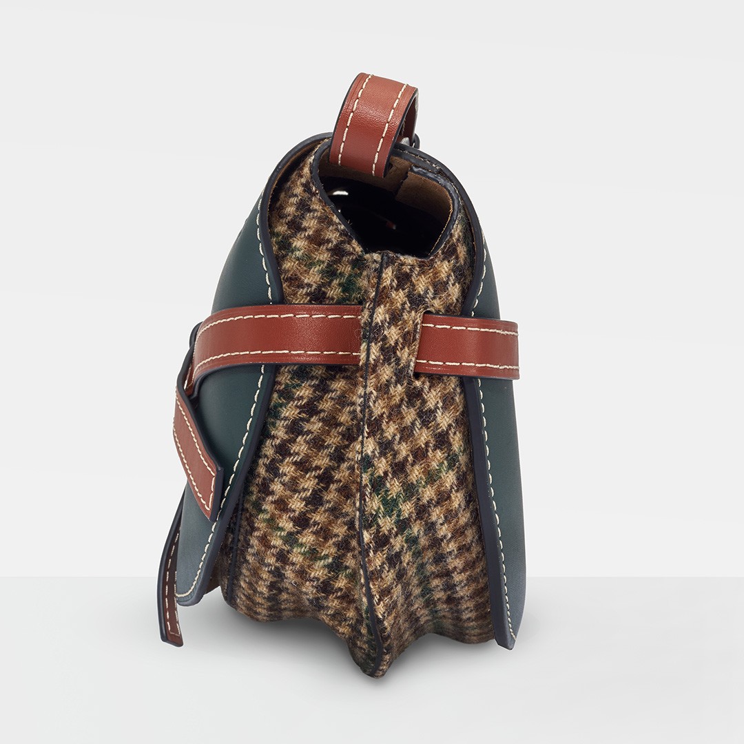This Gate Bag made of dark green calfskin and plaid wool is from Loewe's 2018 autumn and winter collection, full of classical academic style . The exquisite three-dimensional saddle shape is decorated with a bow buckle, and contrasting stitching and side metal latches add details. Creative director Jonathan Anderson took suspended architecture and classic literary works as inspiration, and modernized the plaid fabric full of classical temperament, making the bag have both an architectural three-dimensional silhouette and a retro academic style.