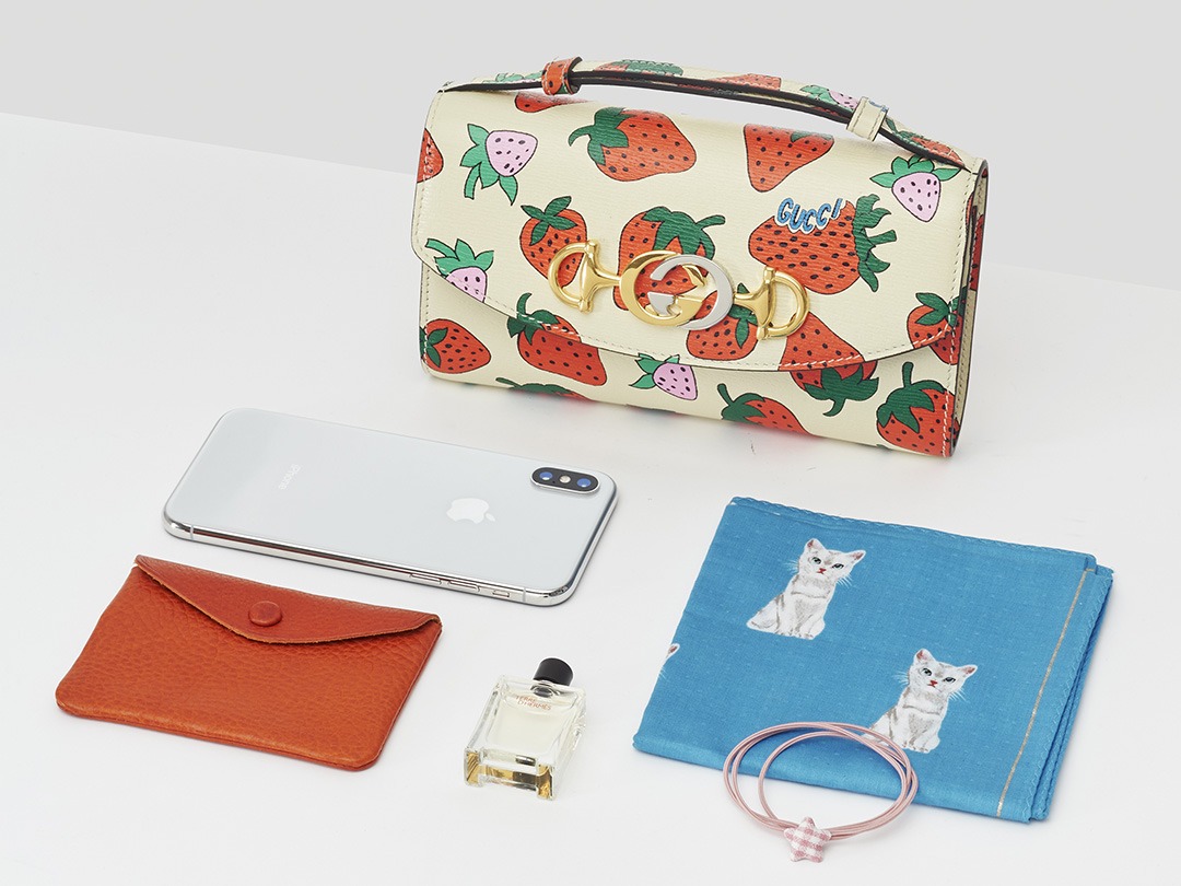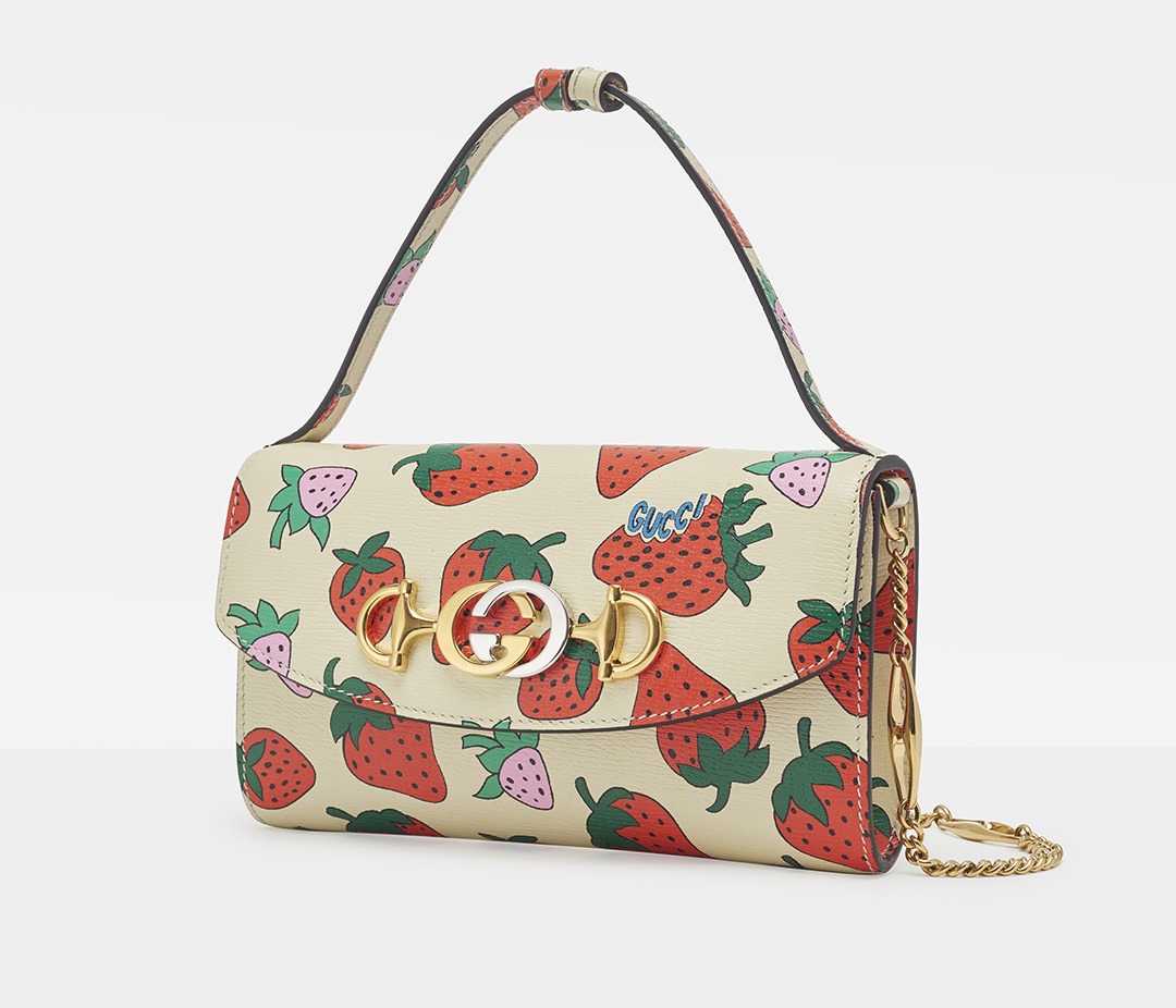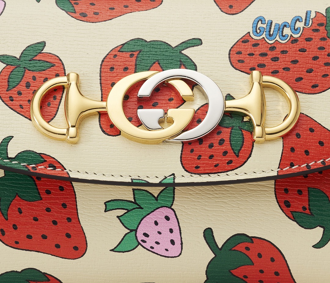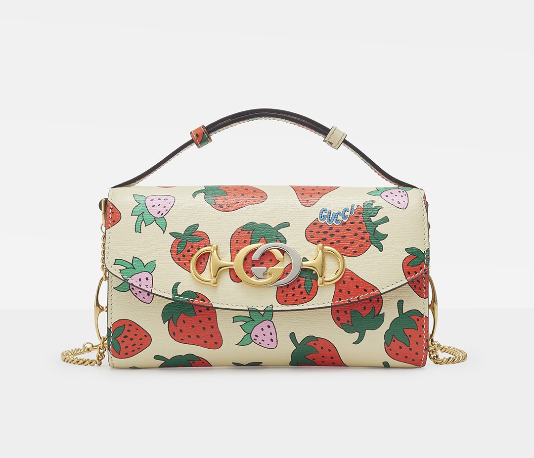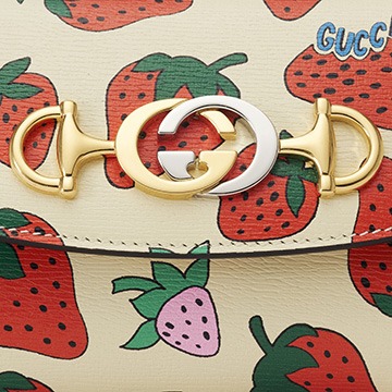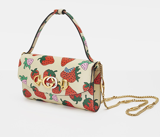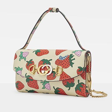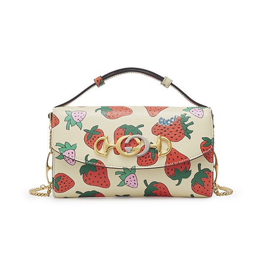 Gucci combines the Horsebit from the 1950s and the interlocking double G logo from the 1960s into one, presenting it in a mix of gold and silver tones, and decorating this small Zumi handbag . The pop-style strawberry print is full of retro girlishness. The Zumi handbag is a new work in Gucci's 2019 spring and summer series. It uses the interlocking double G horsebit as its iconic element and is paired with an elegant and simple bag shape. There are two styles of shoulder bags and handbags, which have both modern contours and practical designs.
