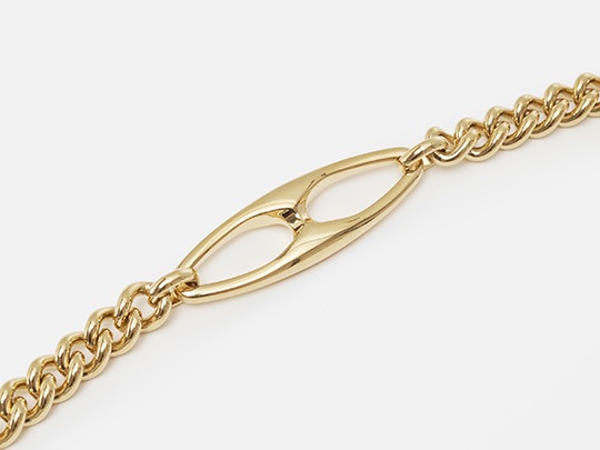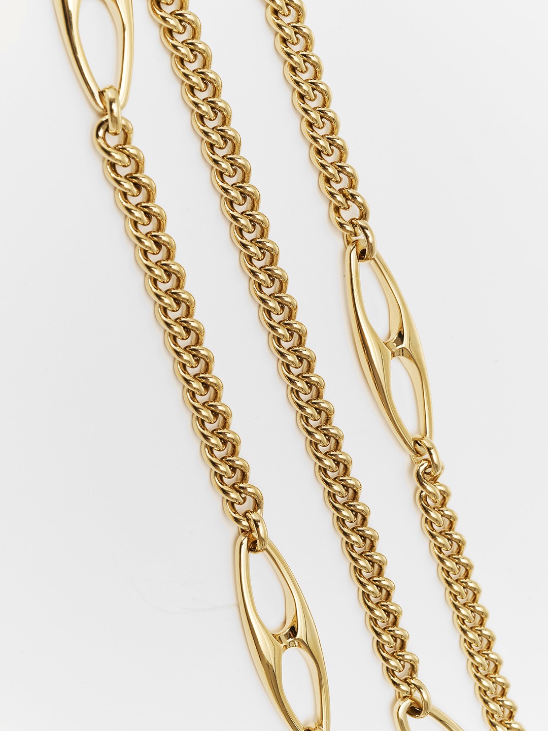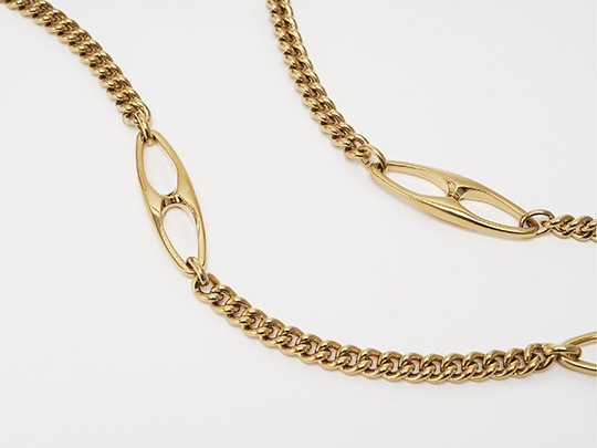 The shoulder chain is also very unique in design, inspired by a ship's anchor chain , and decorated with slender double-hole clasps at intervals.