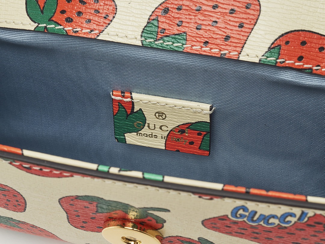 The lining of the bag is made of blue fiber material, which is light and not easy to scratch. There is a strawberry printed leather label on the back and the words GUCCI made in Italy are hot-stamped in gold.