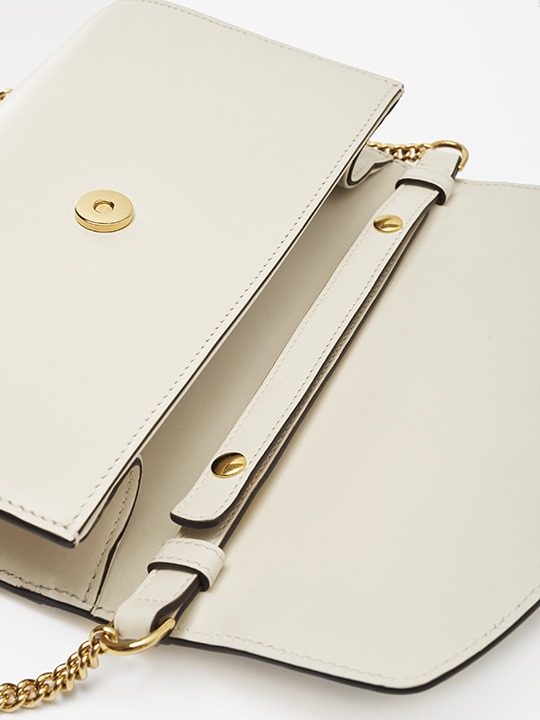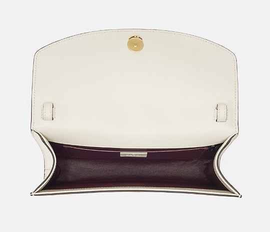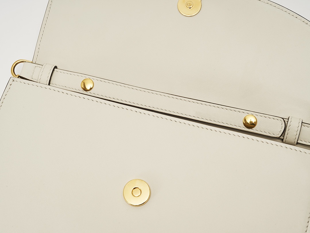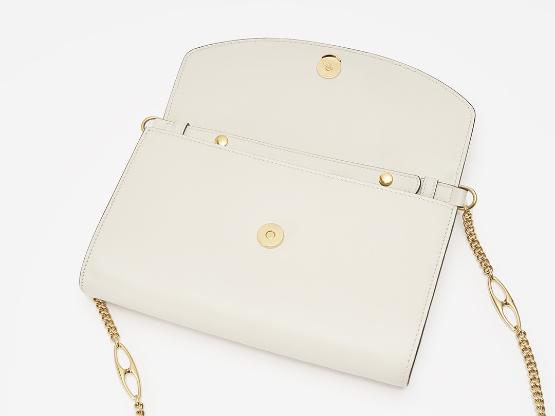 Slightly larger than the mini size, this small white Zumi shoulder bag is cut in glossy leather with a subtle sheen and has a slim silhouette with a curved flap for a classic feel.
