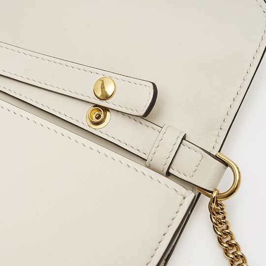 The bottom of the chain is connected to a leather buckle strap, which is fixed to the inside of the flap with a metal snap. When not in use, you can simply fold it up inside the bag to complete the switch, or you can directly remove the shoulder strap to reduce the weight.