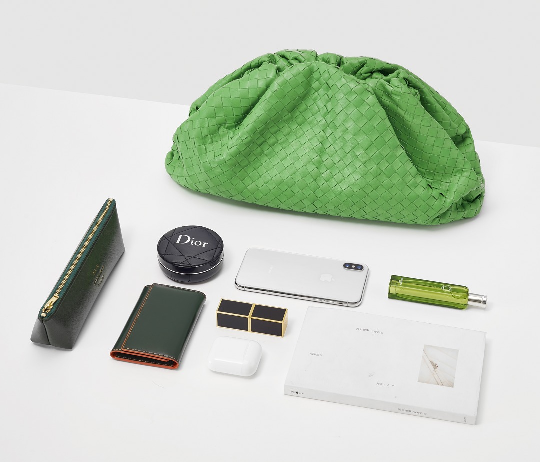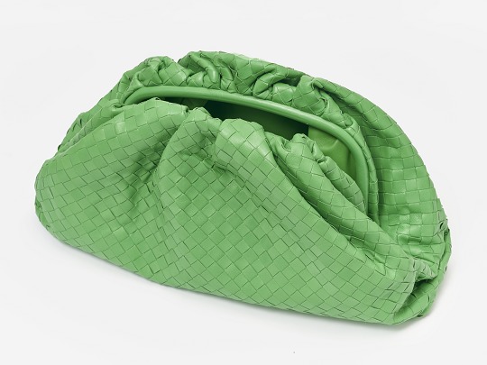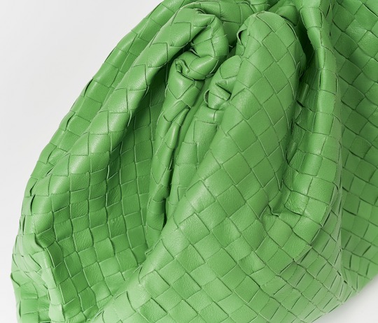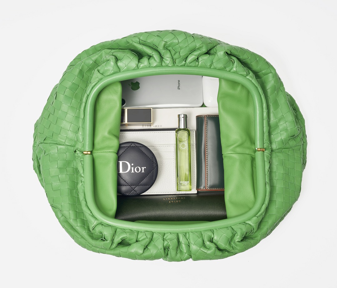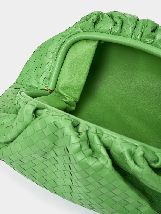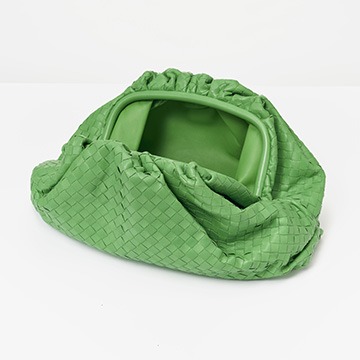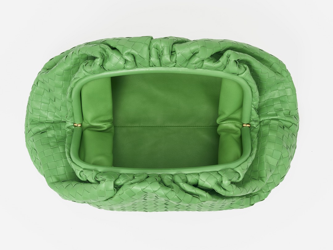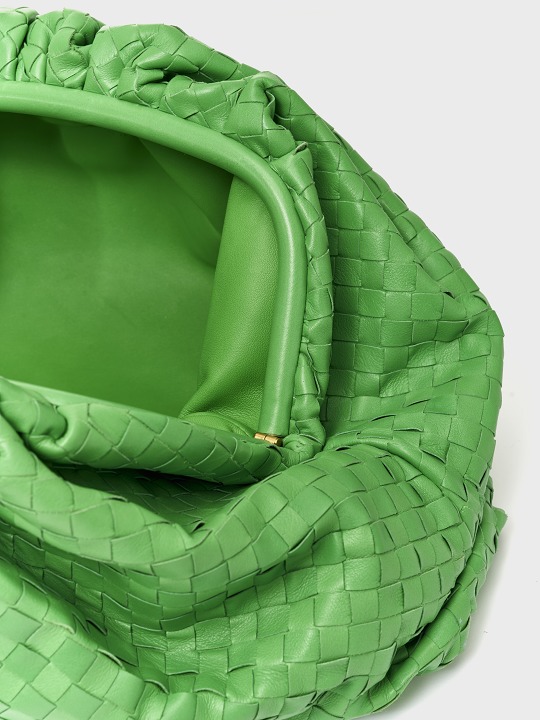 The metal frame of the bag is covered with calfskin of the same color, buried in the wrinkled outline of the top of the cloud. The lining is also grass green glossy calfskin , which feels delicate and soft.