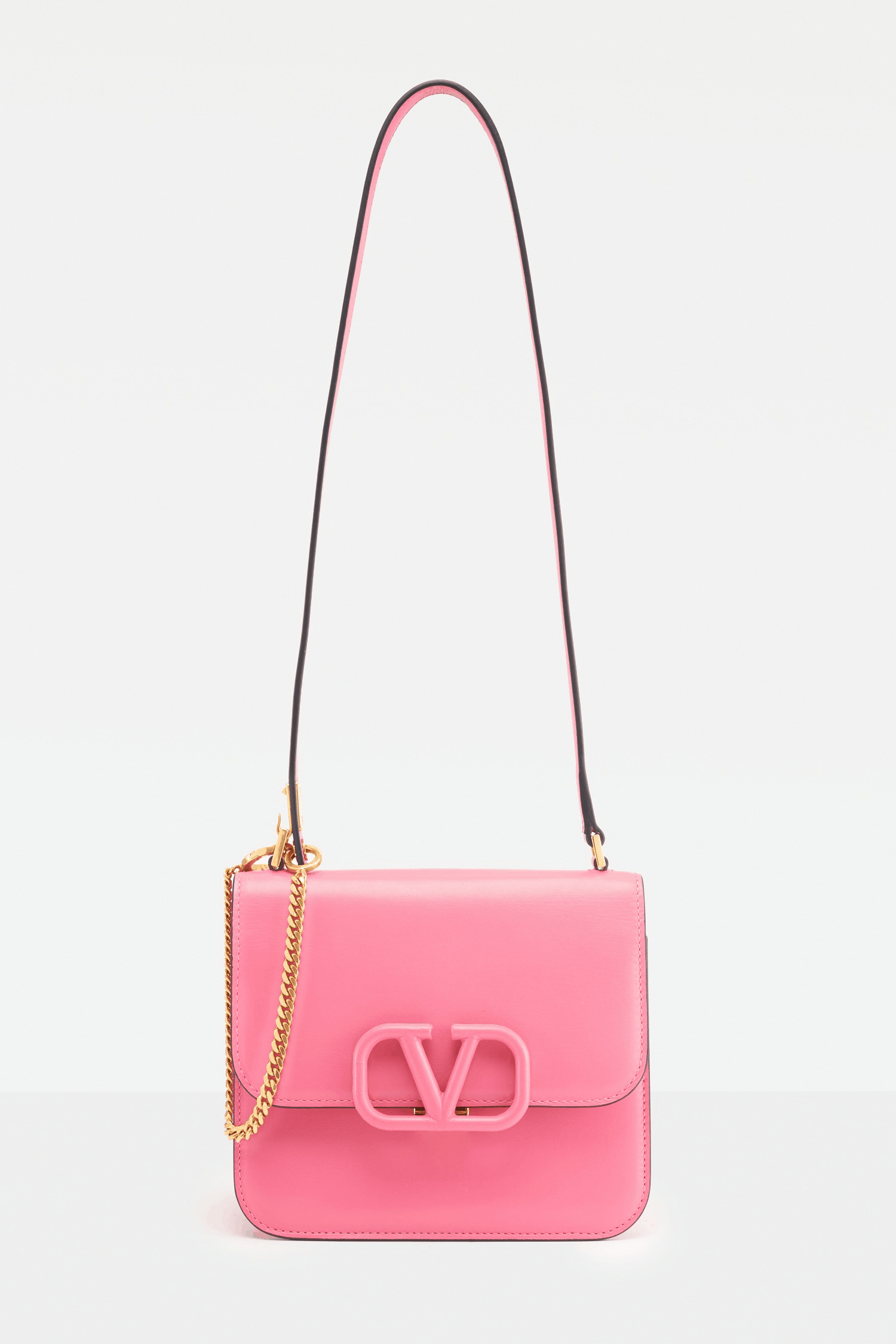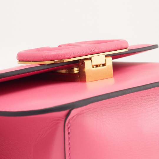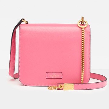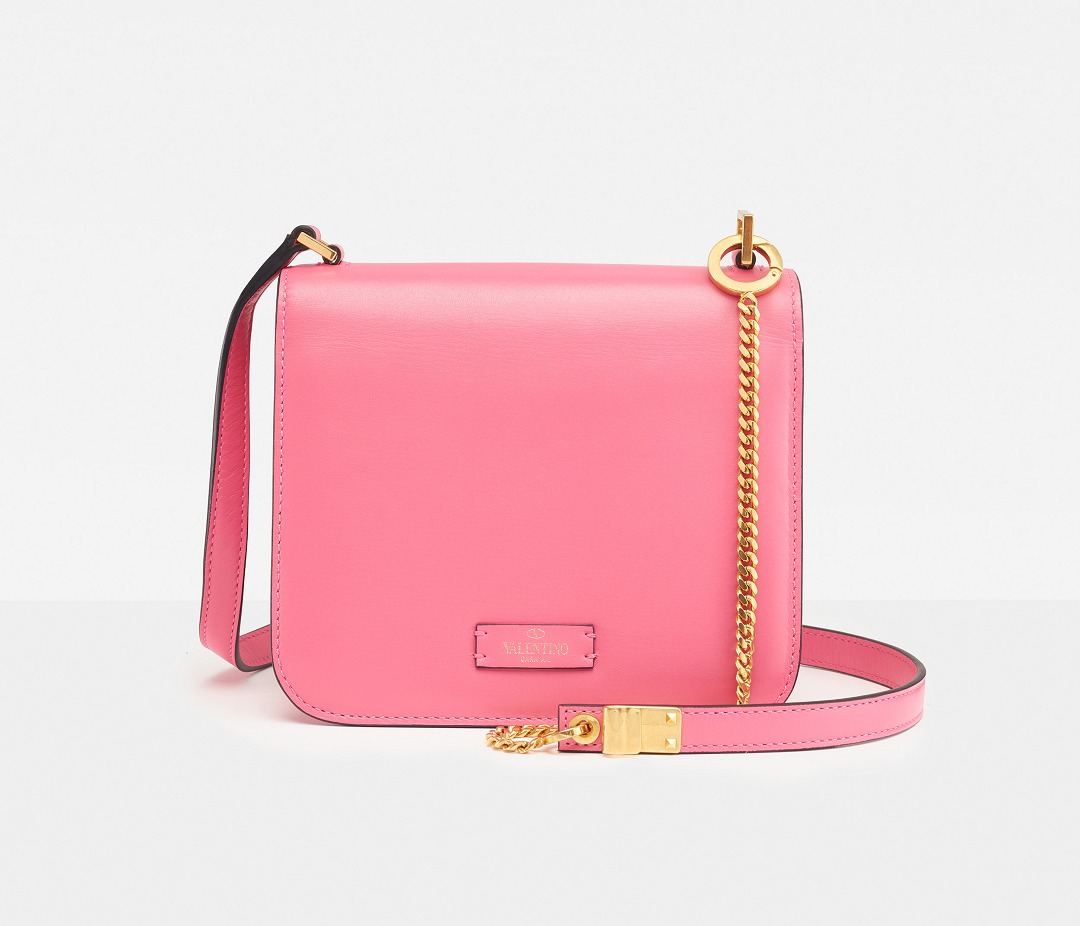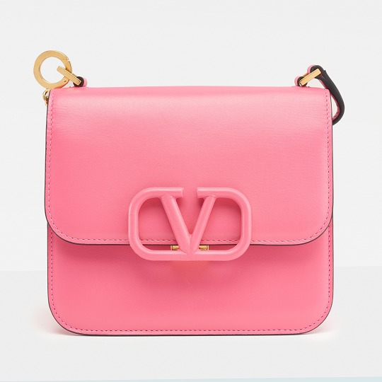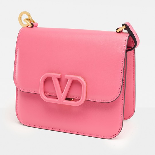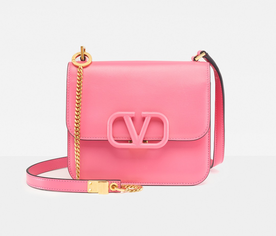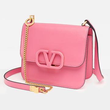 This macaron pink VSLING handbag is from Valentino's 2019 autumn and winter series. The sweet pink color and the cube-like box bag shape exude a playful temperament, and the iconic VLOGO buckle is still the most recognizable element on the bag. The name of the handbag comes from the Sling chain on one side of the shoulder strap , which can not only be used as a bag body pendant, but also as an extension chain to adjust the strap length and switch between multiple carrying methods.