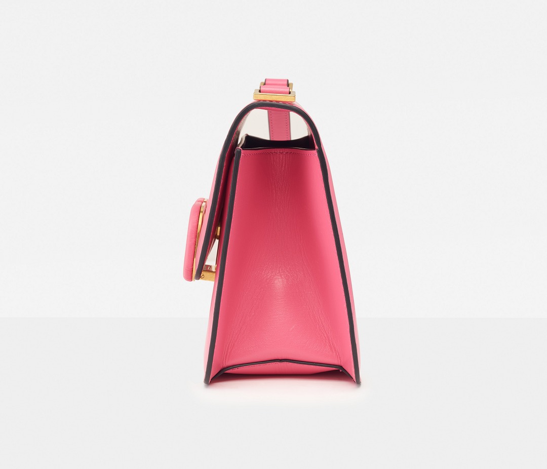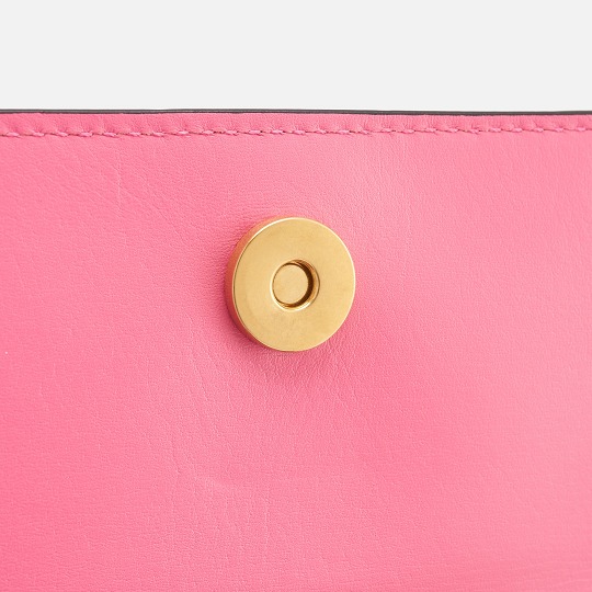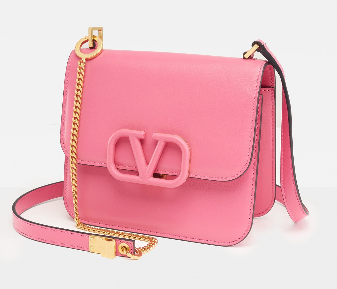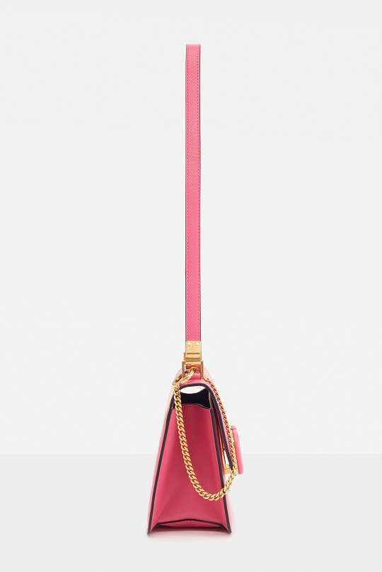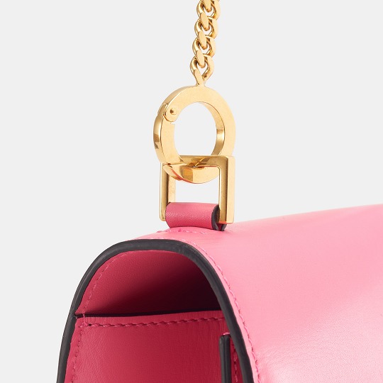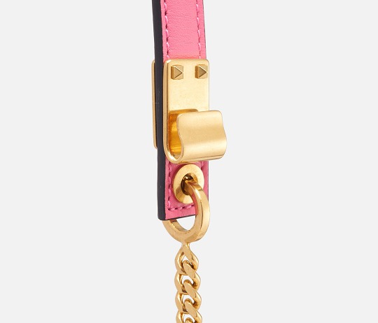 This macaron pink VSLING handbag is from Valentino's 2019 autumn and winter series. The sweet pink color and the cube-like box bag shape exude a playful temperament, and the iconic VLOGO buckle is still the most recognizable element on the bag. The name of the handbag comes from the Sling chain on one side of the shoulder strap , which can not only be used as a bag body pendant, but also as an extension chain to adjust the strap length and switch between multiple carrying methods.