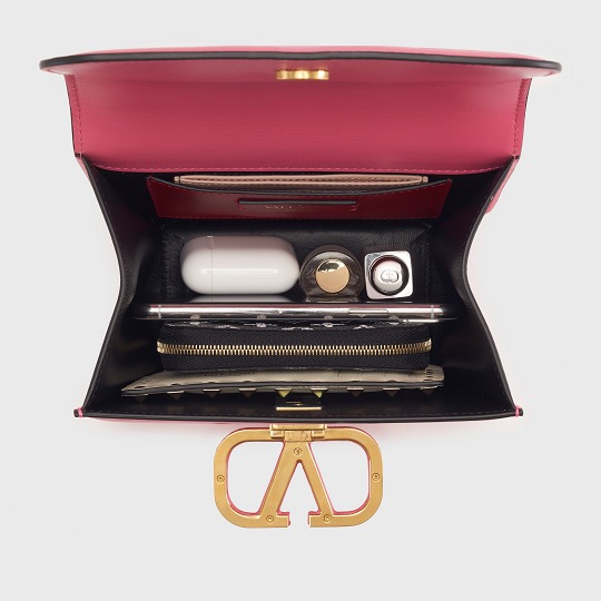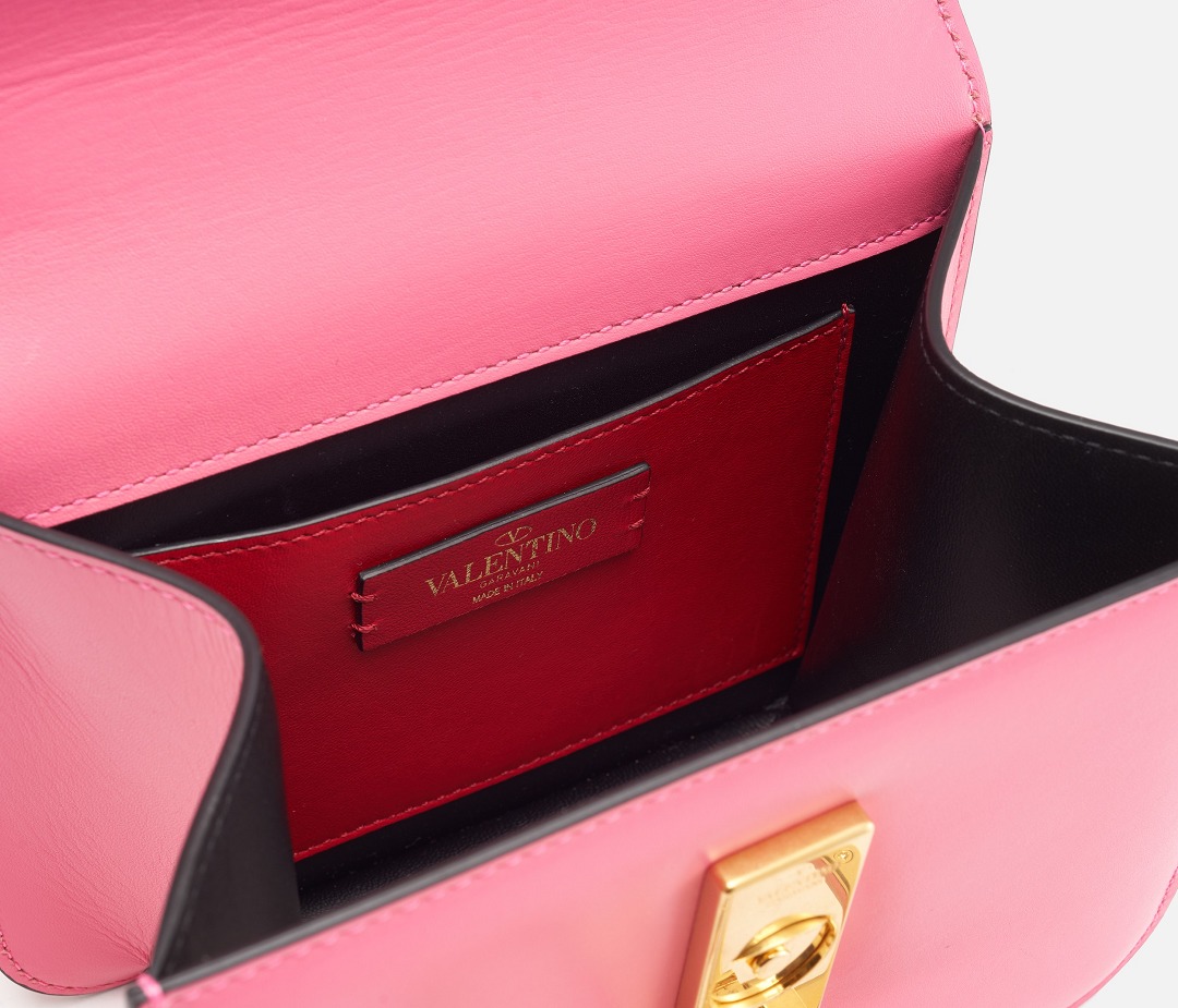 The bag is lined with black Nappa leather , which is soft and breathable, and has the brand's iconic Valentino Red logo and inner pocket on the back.