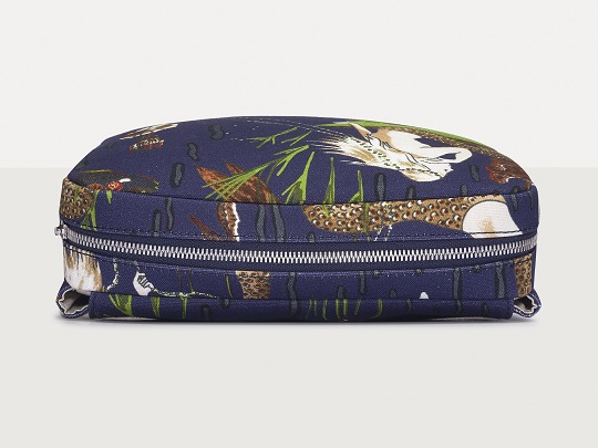 The bag is lined with cotton canvas and has an embossed leather interior with the Paula's X LOEWE logo. In addition to the front flap pocket, there is also a flat pocket inside to store small items.
