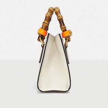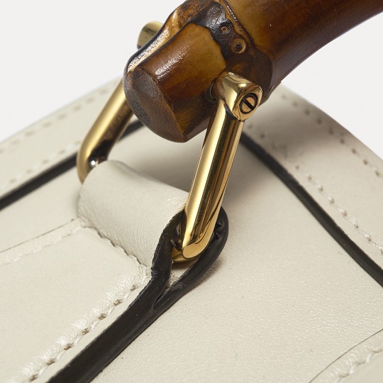 The bag is made of pure white calfskin , with black oiled edges that emphasize the contours. The spliced edges make the bag three-dimensional and stylish, forming a contrast between round and square, ancient and modern with the arched bamboo handles.