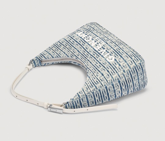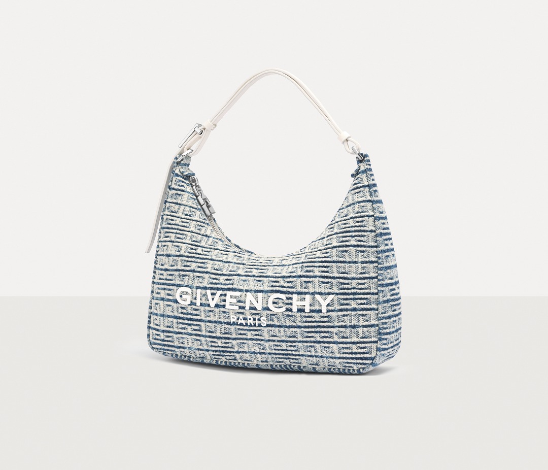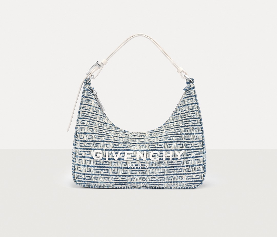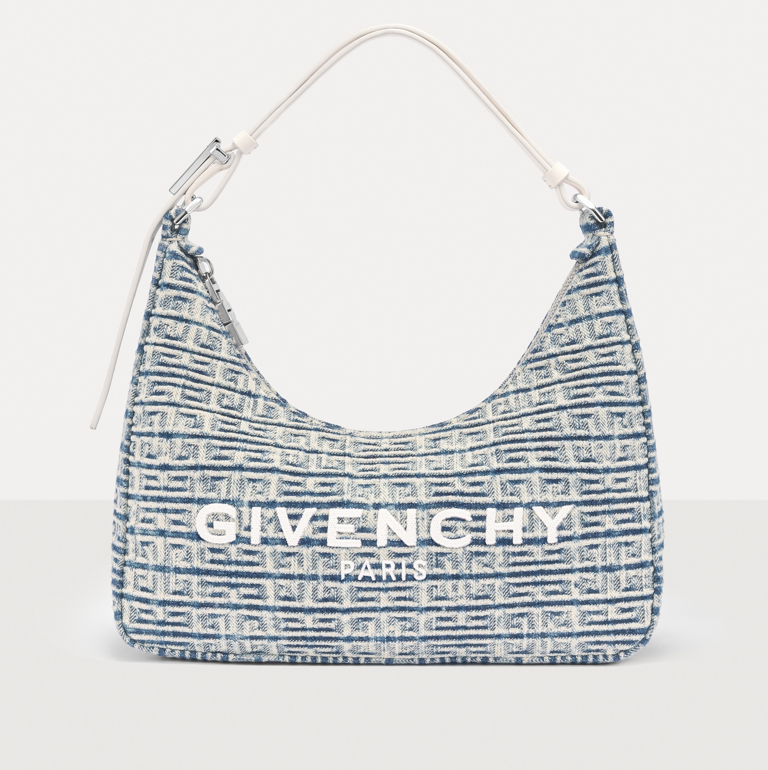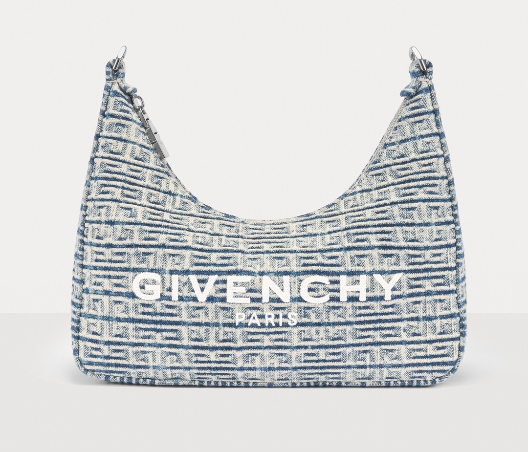 This Moon Cut-Out bag is from Givenchy's 2022 Early Fall collection . The bag's curved opening is cut like a crescent moon. The bag is made of vintage bleached denim , and the highlight is the 4G jacquard pattern with overprinted white logo letters . The overall style is casual and chic.
