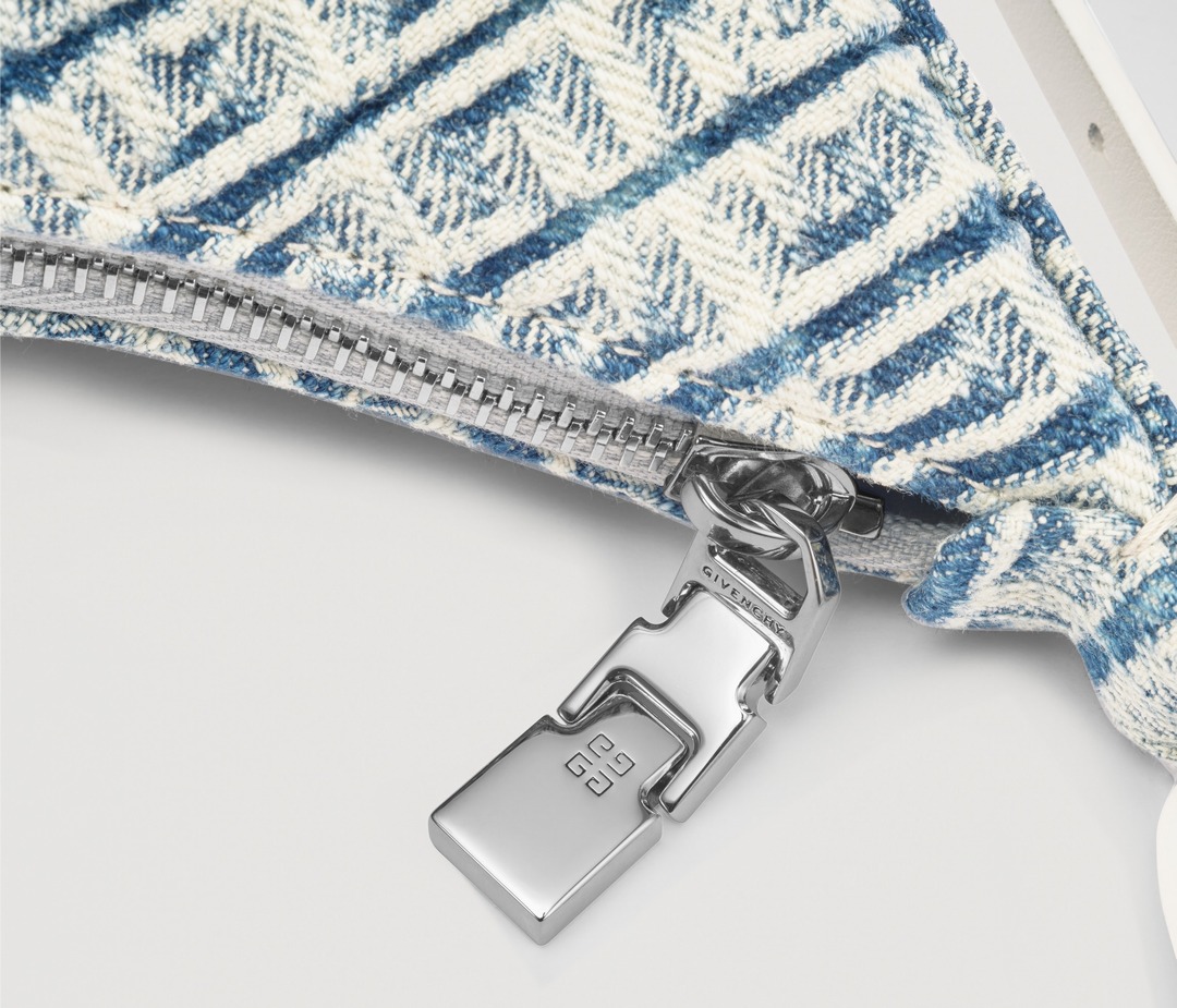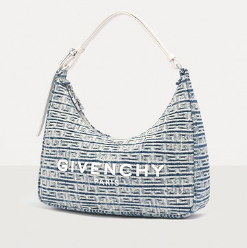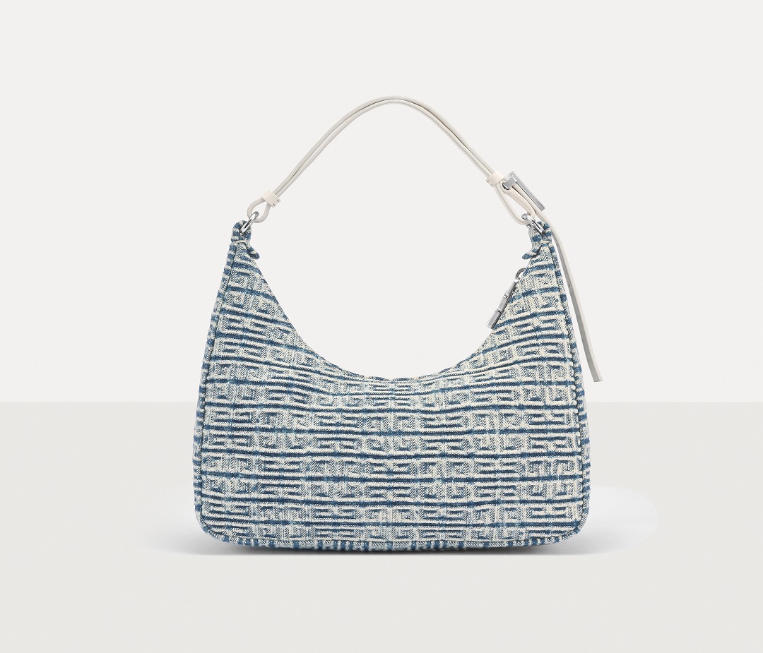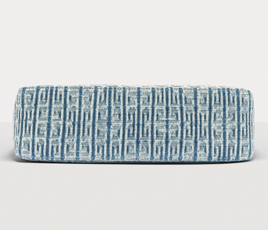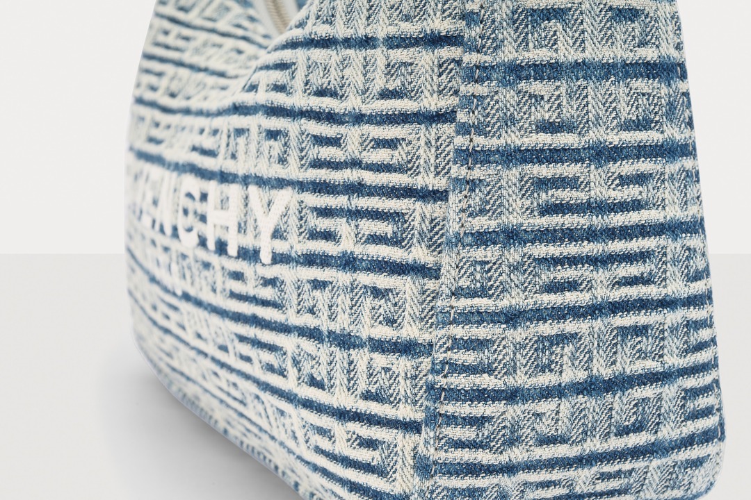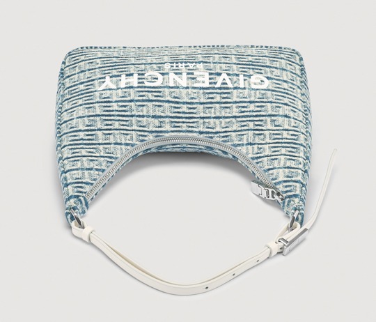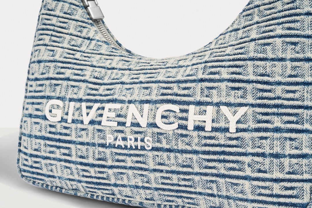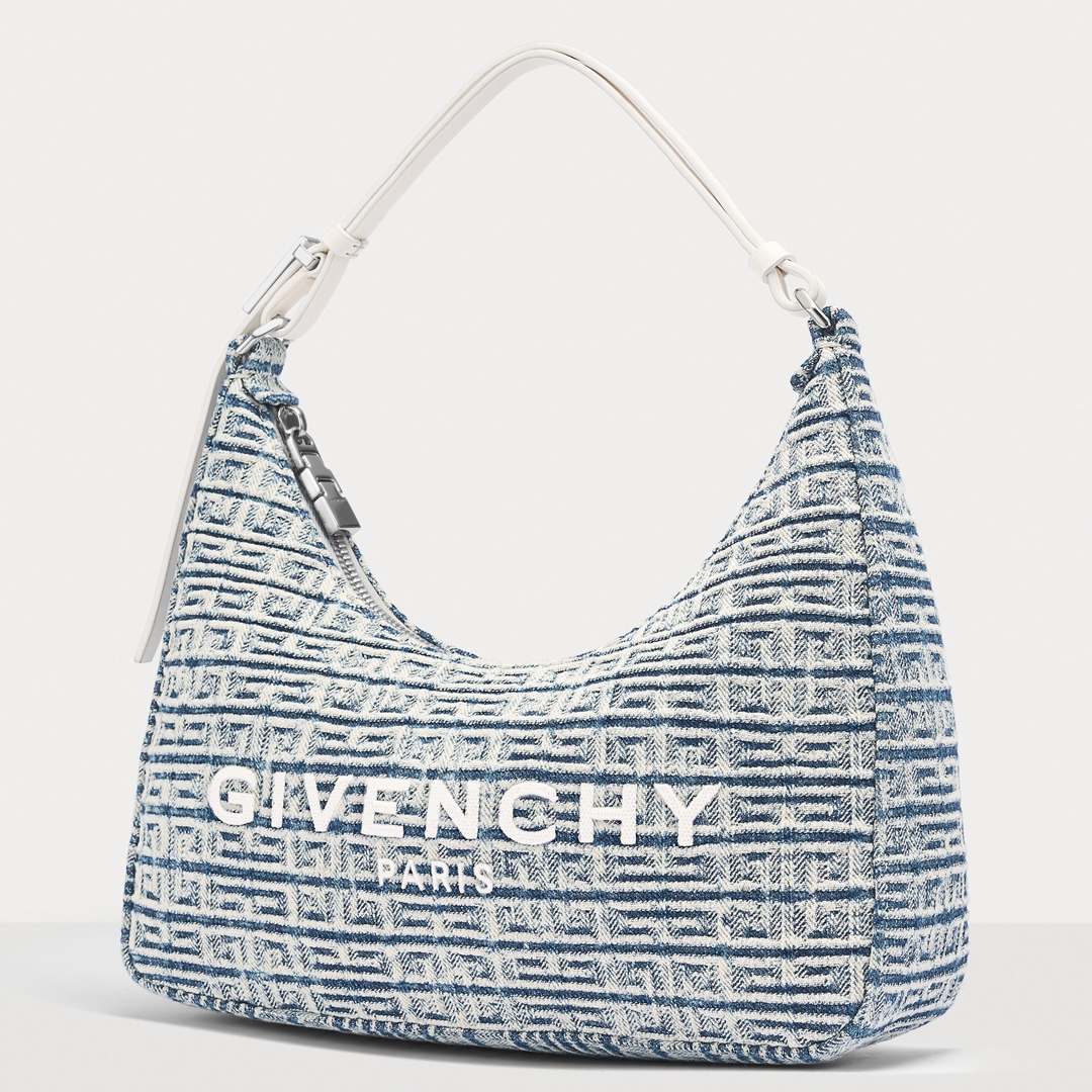This Moon Cut-Out bag is from Givenchy's 2022 Early Fall collection . The bag's curved opening is cut like a crescent moon. The bag is made of vintage bleached denim , and the highlight is the 4G jacquard pattern with overprinted white logo letters . The overall style is casual and chic.