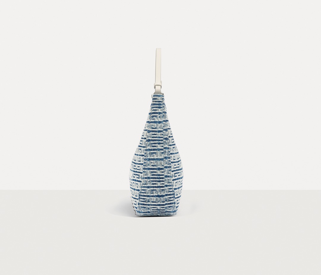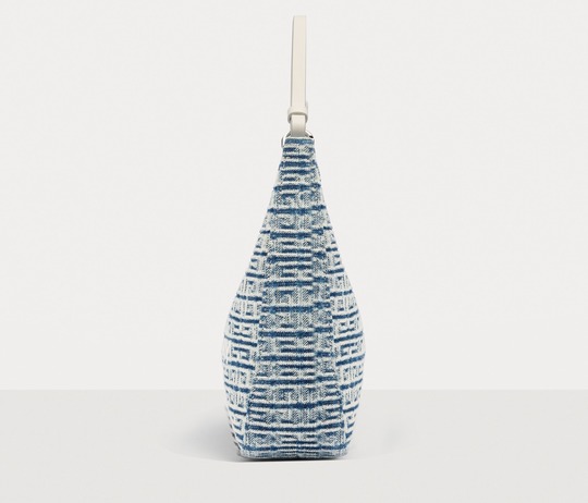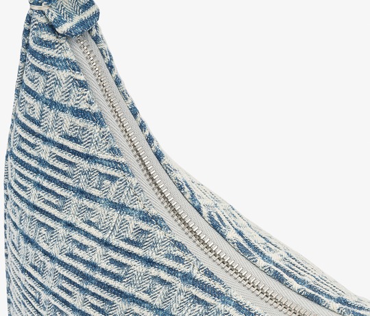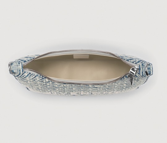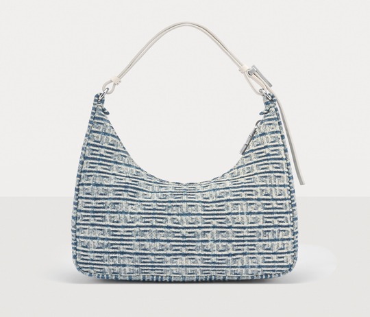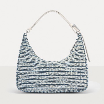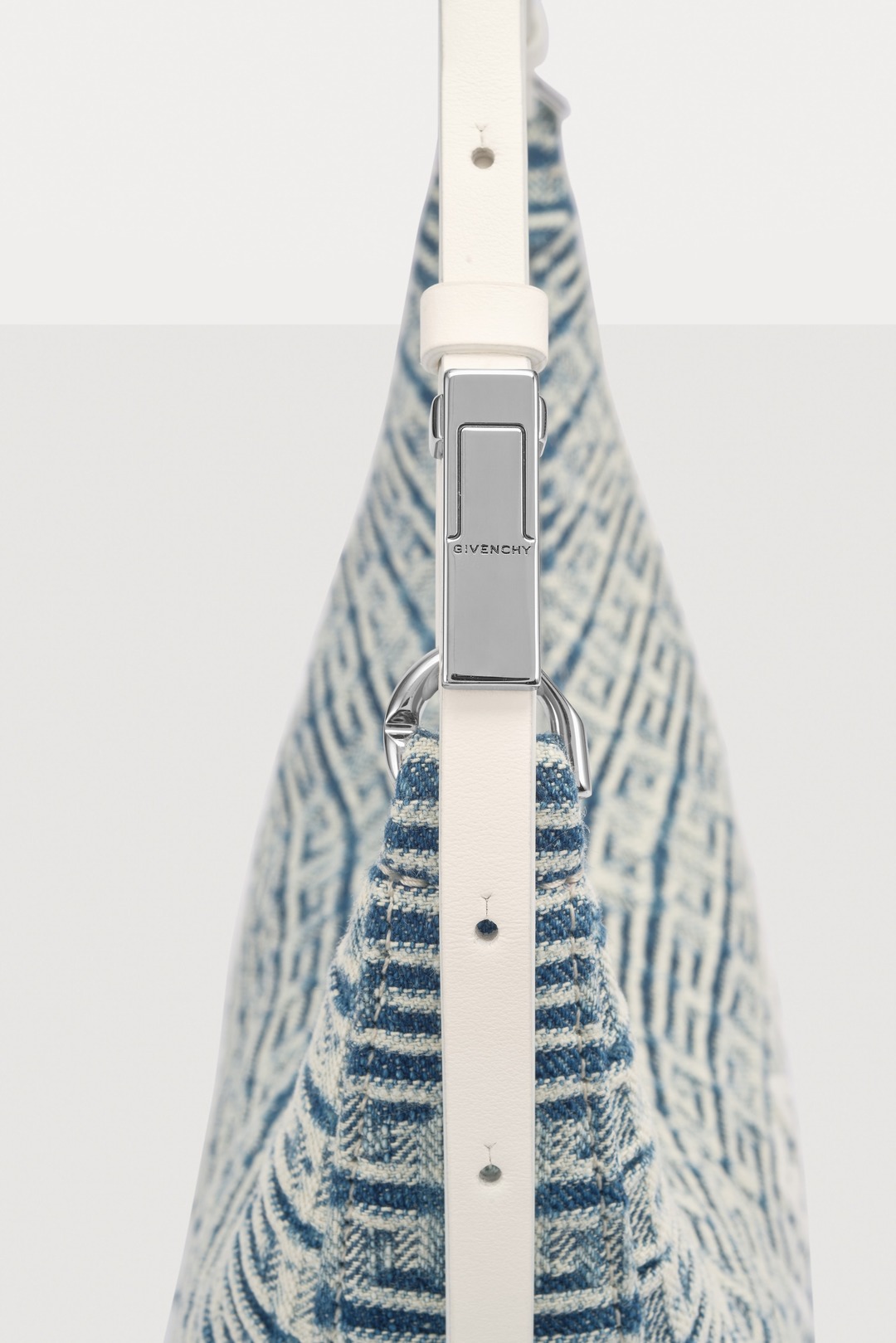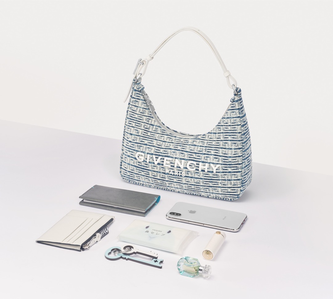 This Moon Cut-Out bag is from Givenchy's 2022 Early Fall collection . The bag's curved opening is cut like a crescent moon. The bag is made of vintage bleached denim , and the highlight is the 4G jacquard pattern with overprinted white logo letters . The overall style is casual and chic.