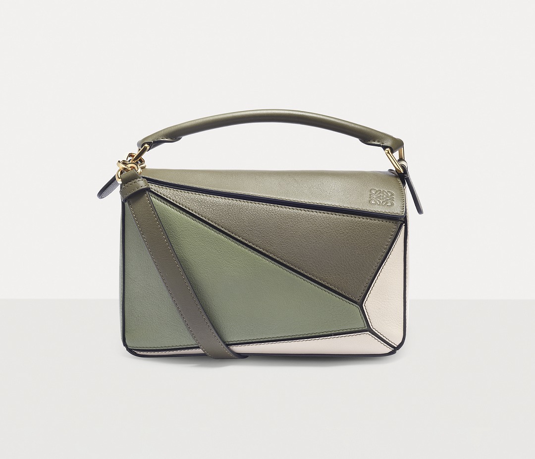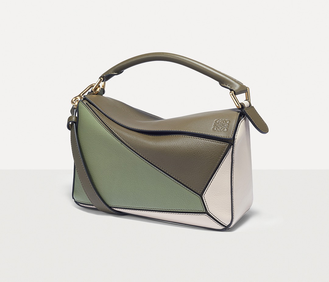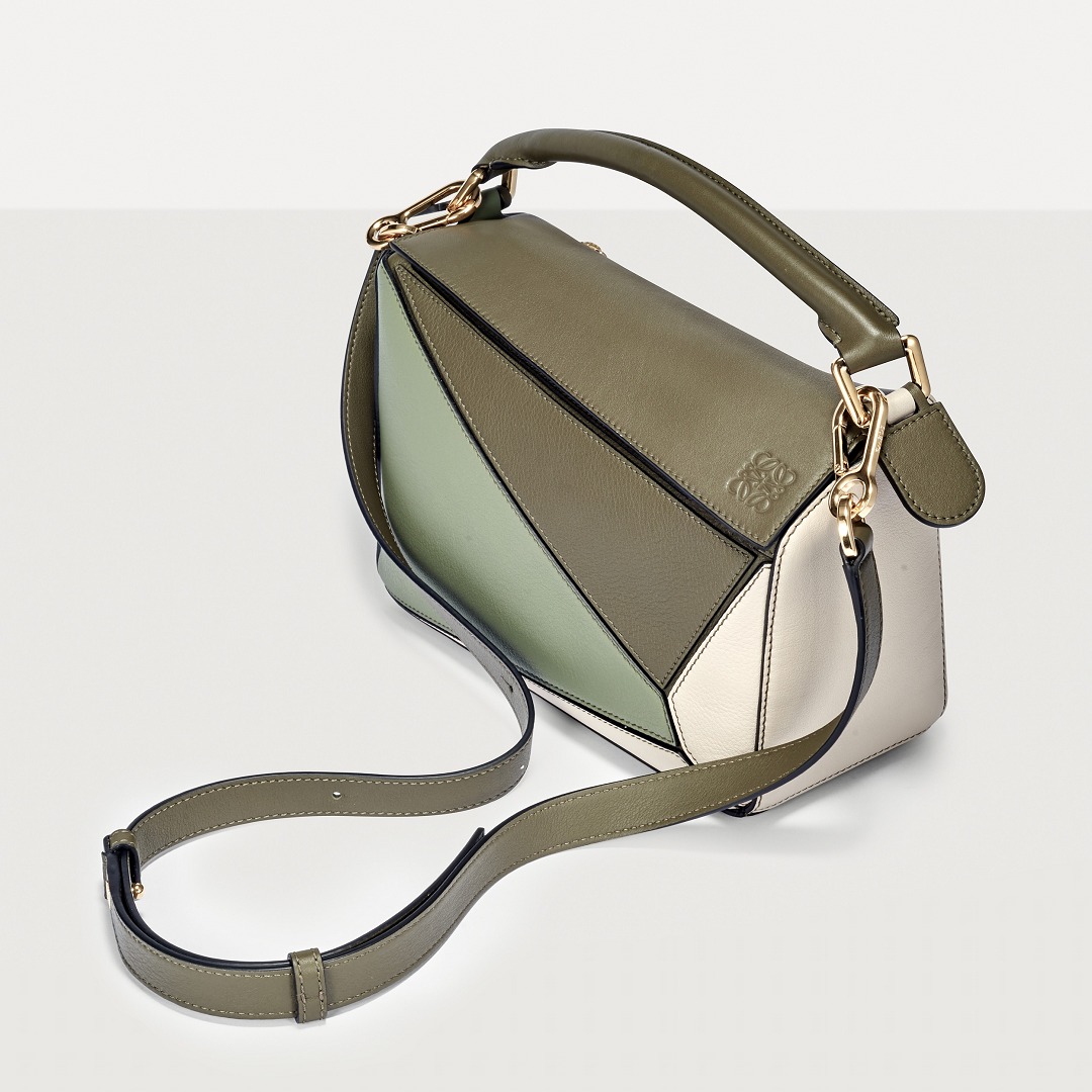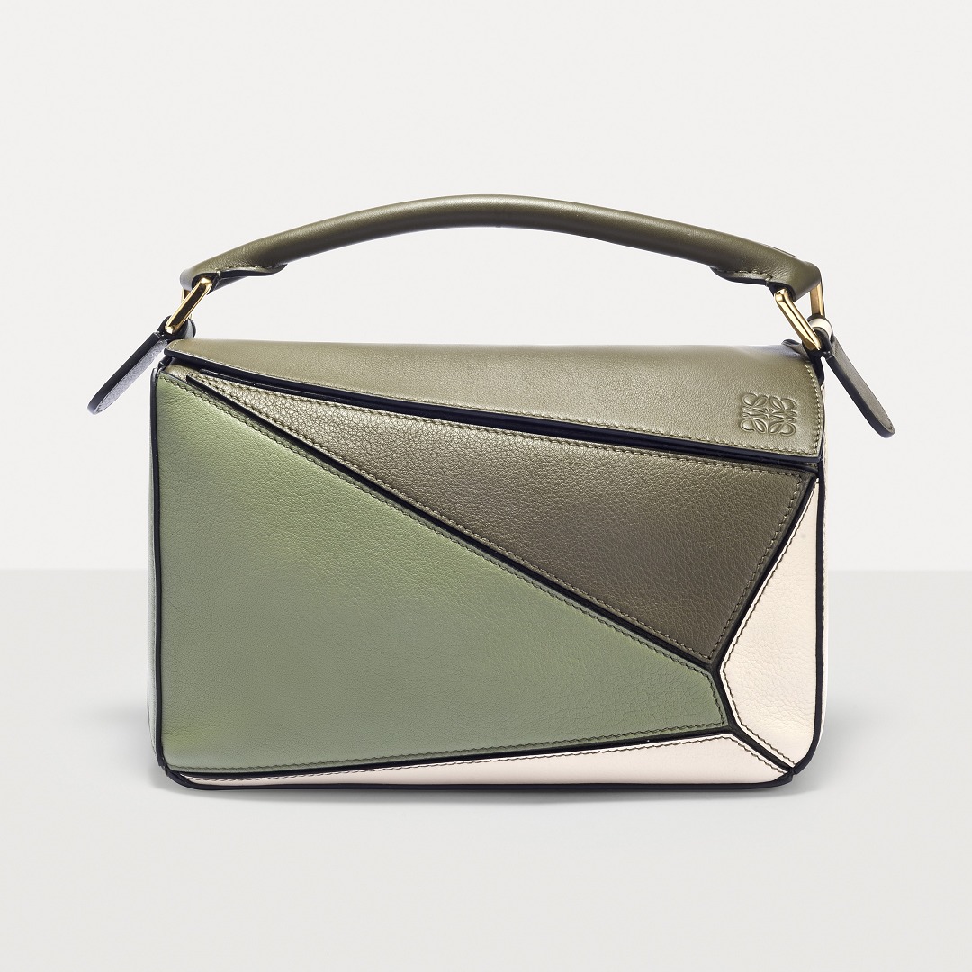 LOEWE's classic Puzzle handbag launches new color schemes in the fall and winter of 2022, using marble green and light oatmeal satin calfskin to interpret the bag body. The color contrast highlights the unique geometric lines of the bag , and the low-saturation neutral tones are restrained and durable.