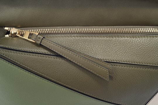 Although it is a small size of 24×16.5×10.5cm , the capacity of this Puzzle handbag is already practical enough. There is a zippered outer pocket on the back of the bag , set on the stitching line of different color blocks, which is used to store handy items. The lining is herringbone cotton canvas , and a leather label is sewn on the back.