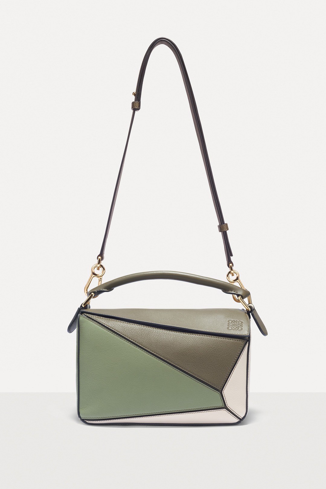 The bag's flap and hardware details are embossed with LOEWE's iconic Anagram logo , which was designed by Spanish artist Vicente Vela in 1970. Four cursive L letters are arranged in a square mirror pattern. The logo has been updated many times over the past 40 years. The current pattern was born in 2014 and was designed by current creative director Jonathan Anderson and French design company M/M Paris. The font is simple and modern.