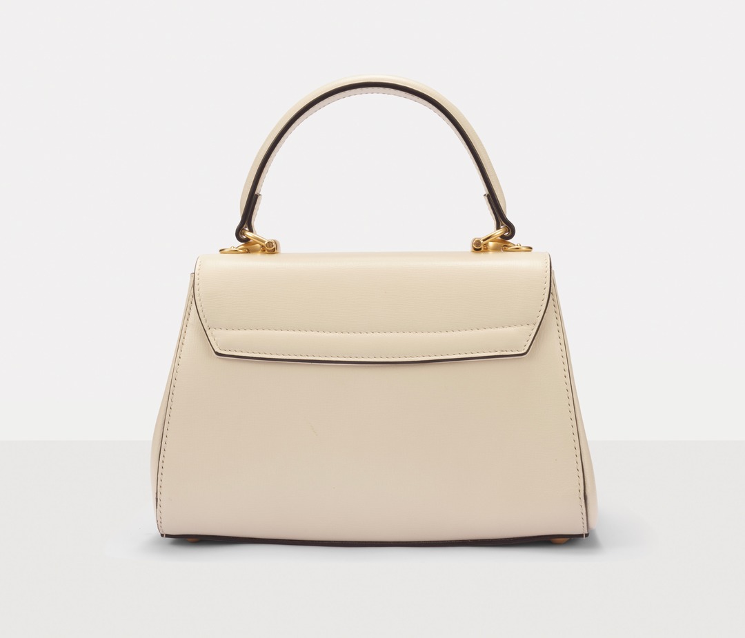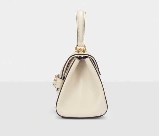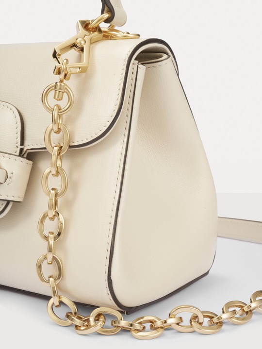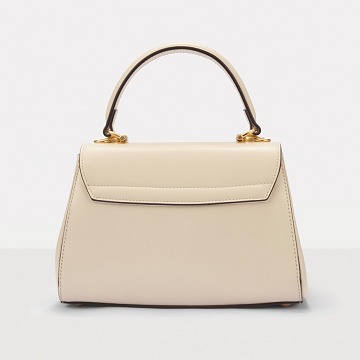 In addition to the conventional hand-carrying method, this bag is thoughtfully equipped with 2 replaceable shoulder straps - one shoulder strap is made of oval metal links and is matched with a pliers-type hook; the other is made of ivory white leather and decorated with gold round rivet snaps, presenting an adjustable design.