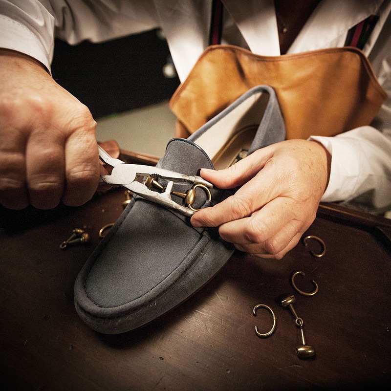 Gucci first used the "horsebit" as a decorative element on a loafer in 1953. The design was inspired by the horse bit and stirrup in equestrian sports. Metal was used to create a bit chain and D-shaped double rings on both sides , showing a shining golden luster.