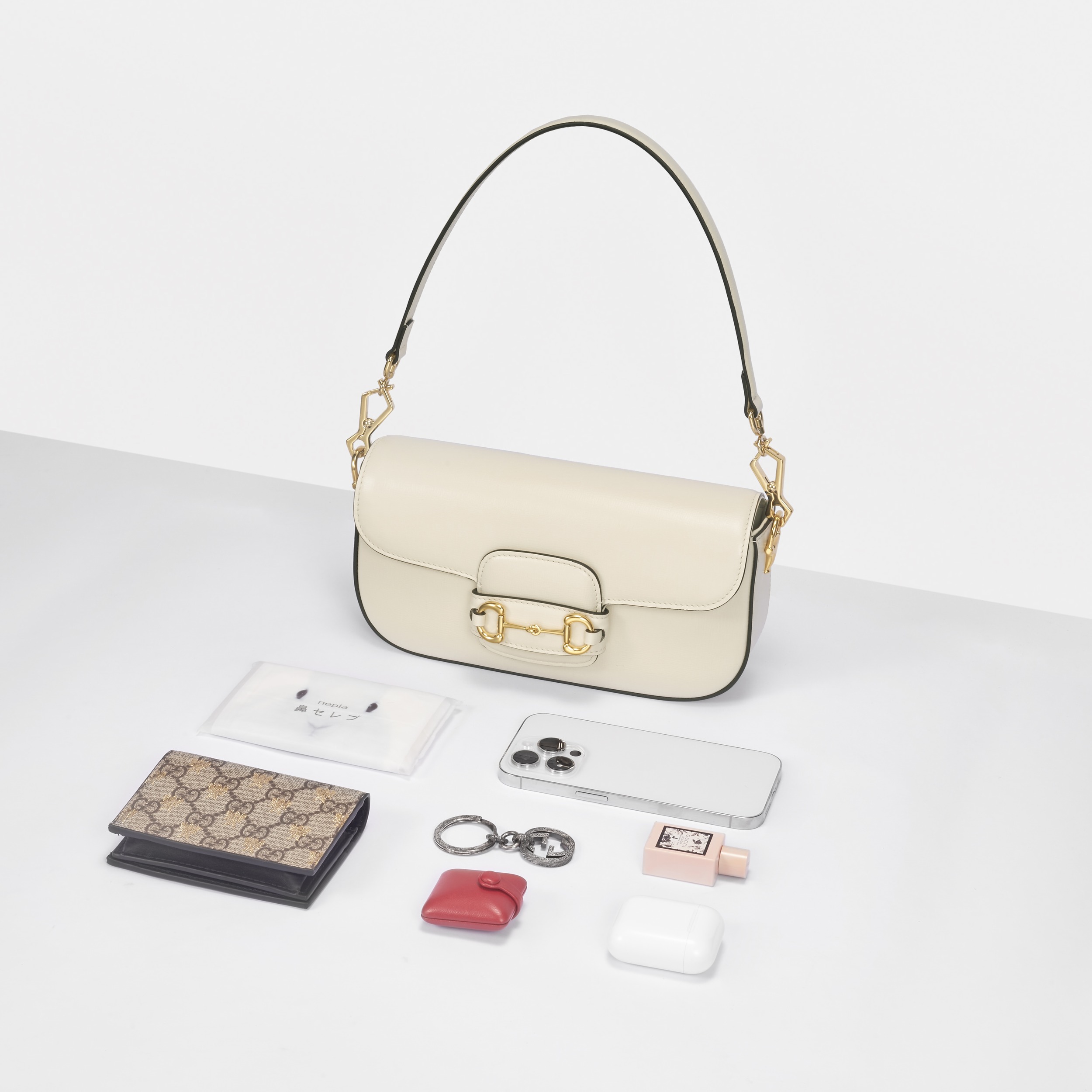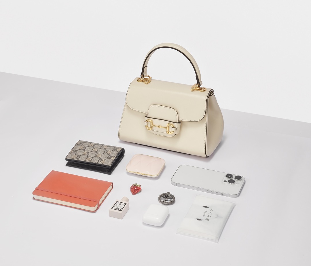 This Horsebit handbag is 22x16x10.5cm in size. We put a wallet, notebook, mobile phone, wireless headphones, portable mirror, perfume and other small items in it. Although the bag is mini in size, the actual capacity is surprising.