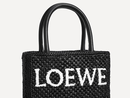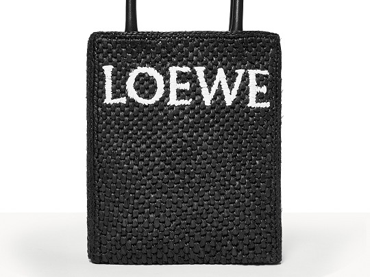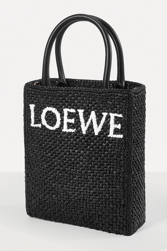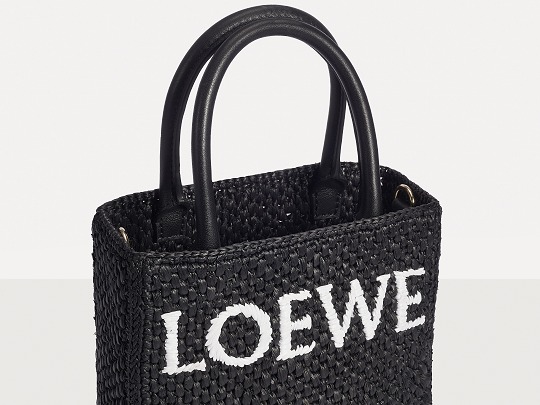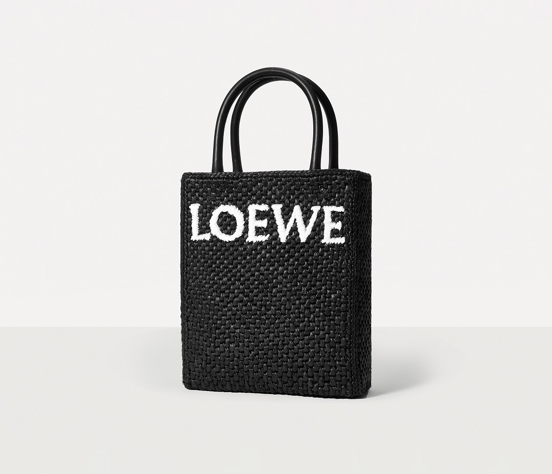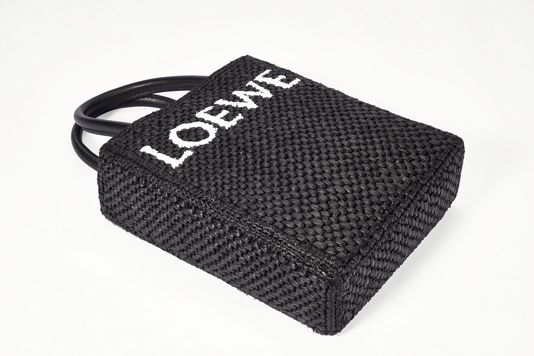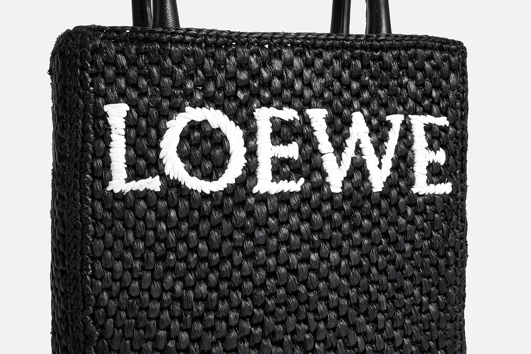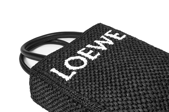 The black bag is decorated with white raffia fiber LOEWE letter logo through embroidery , which is straightforward and visually impactful.
