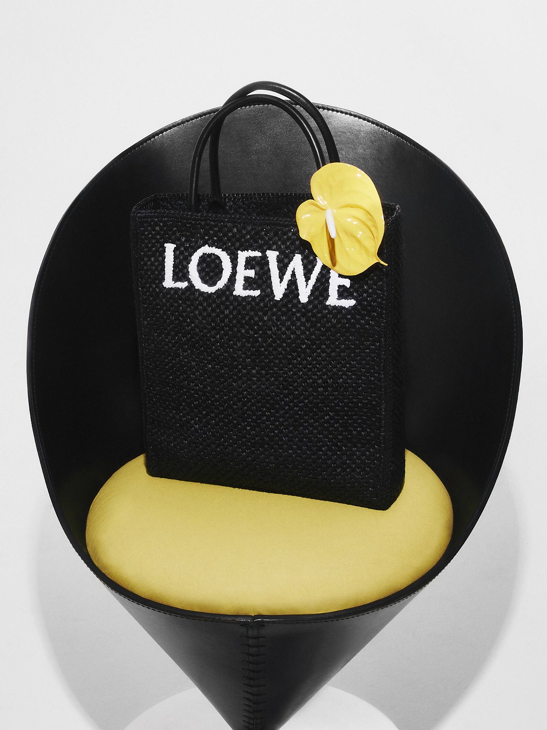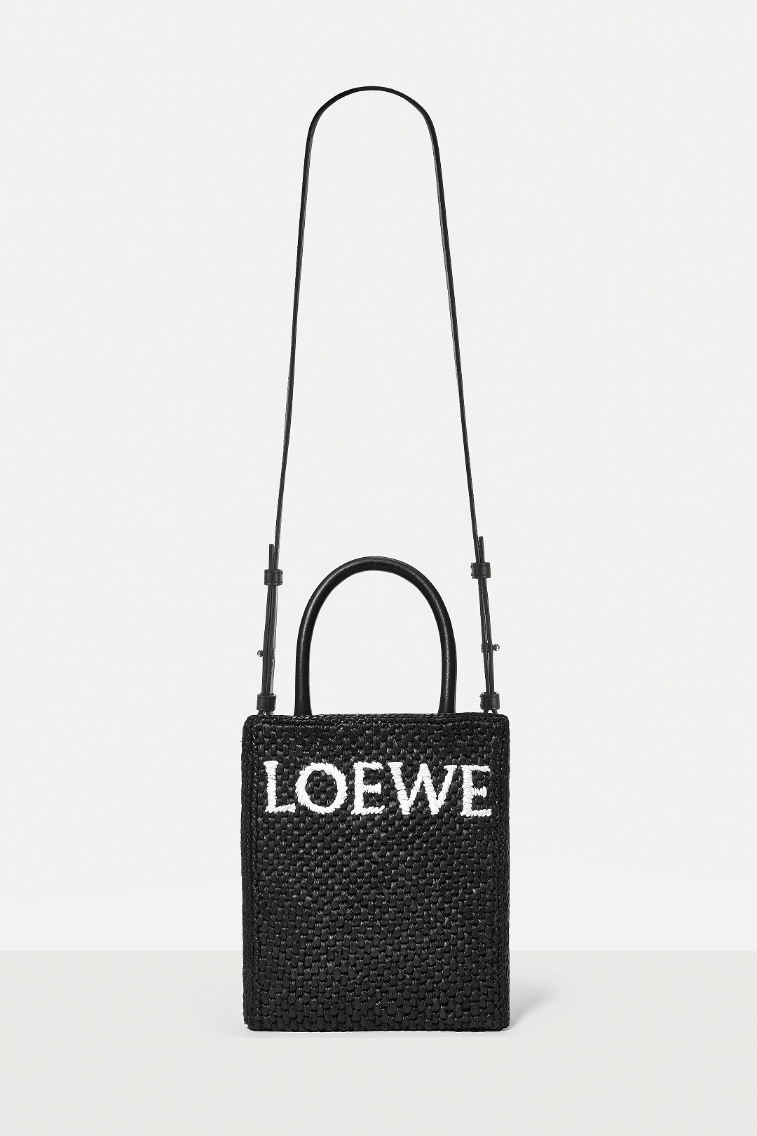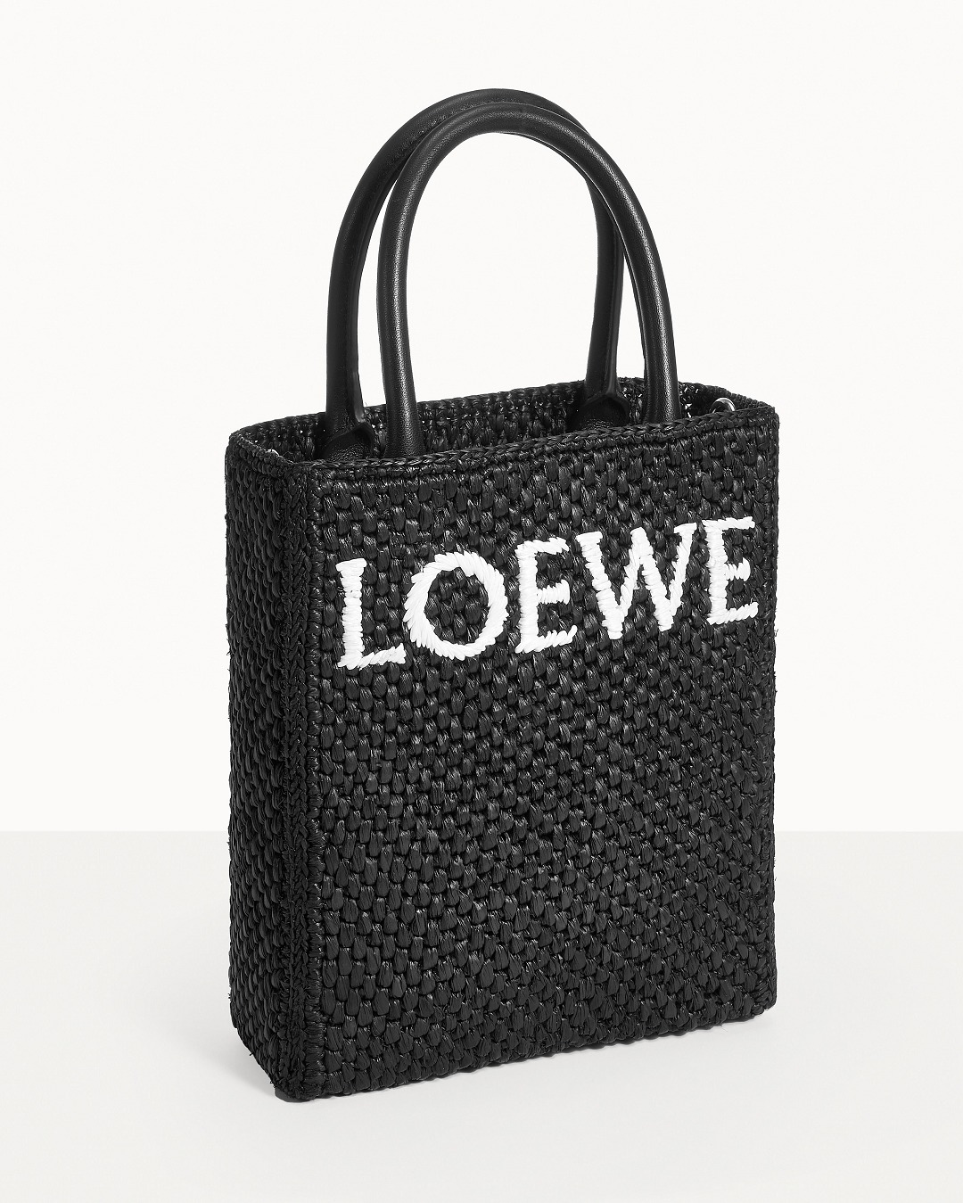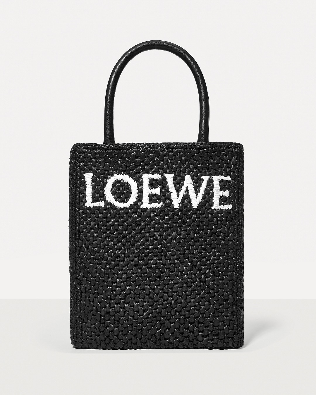 The black bag is decorated with white raffia fiber LOEWE letter logo through embroidery , which is straightforward and visually impactful.