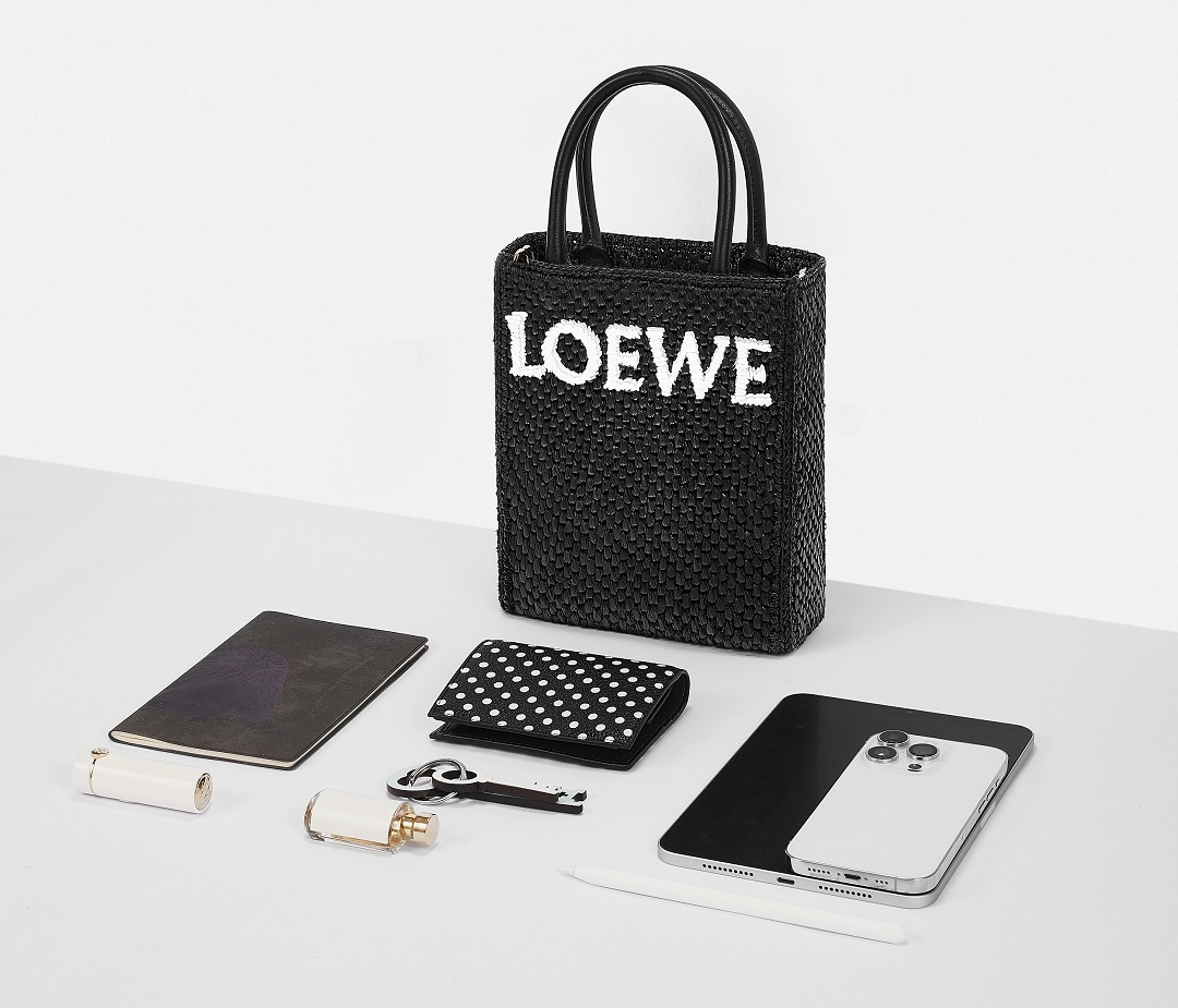 The A5 Tote handbag is a new bag model launched by LOEWE in the spring and summer of 2023. It adopts the most popular vertical tote bag shape . The A5 size is light and compact. This special summer model is woven from black raffia fiber . The minimalist bag is decorated with eye-catching white letter logos . The light texture adds a leisurely mood to summer travel.