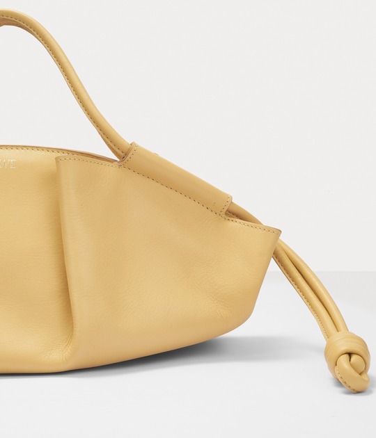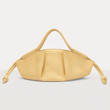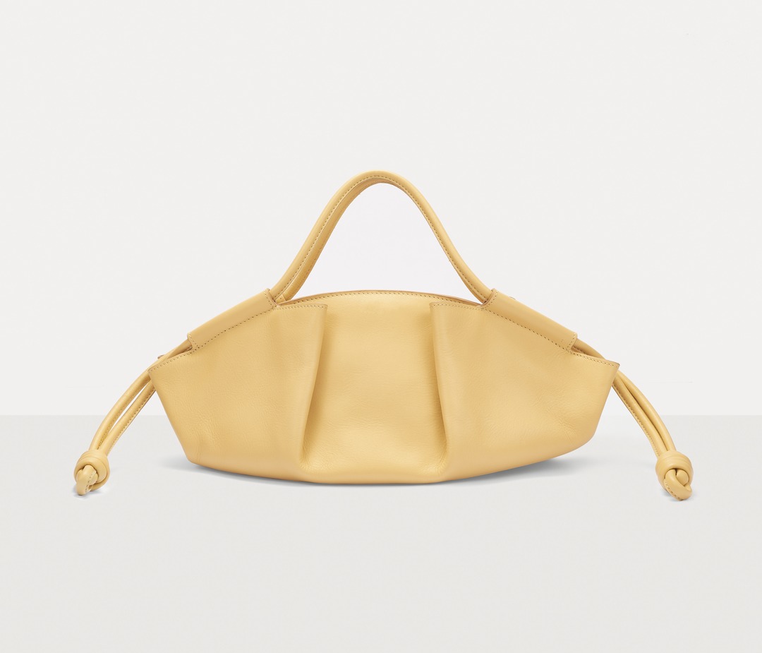 The bag is made of fine and shiny calfskin , creating a unique double-pleated shape that is soft and ultra-light, reminiscent of a flower bud about to bloom.