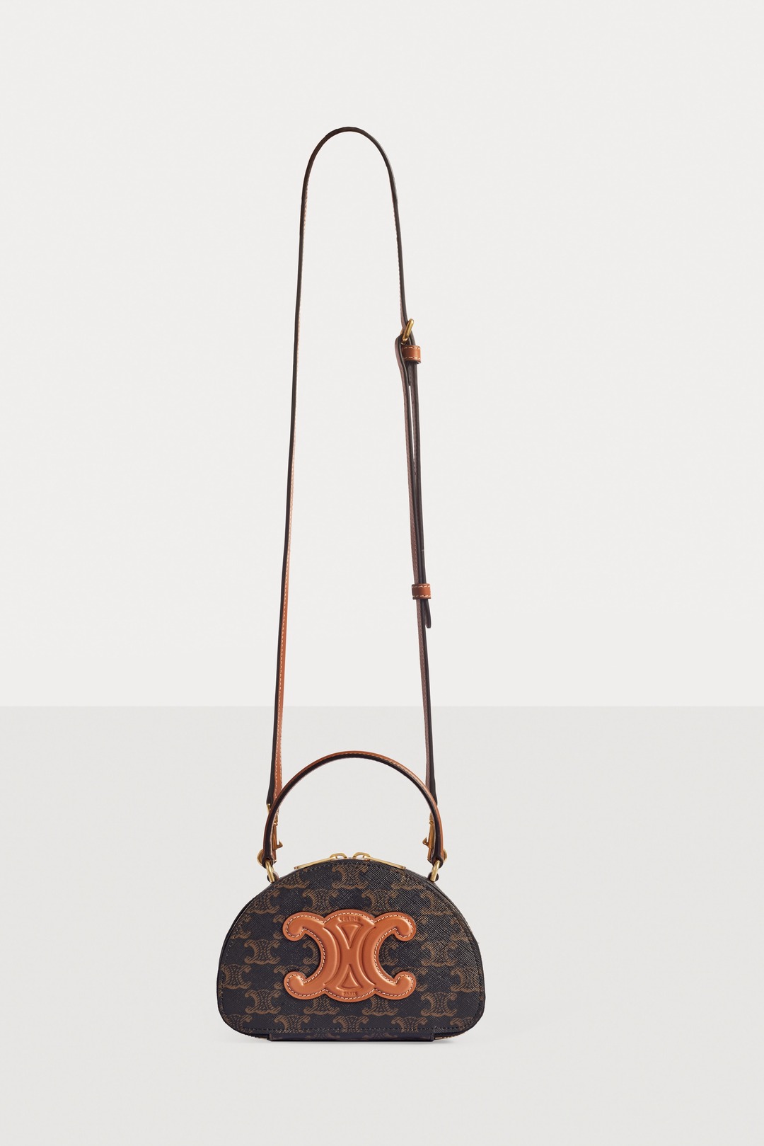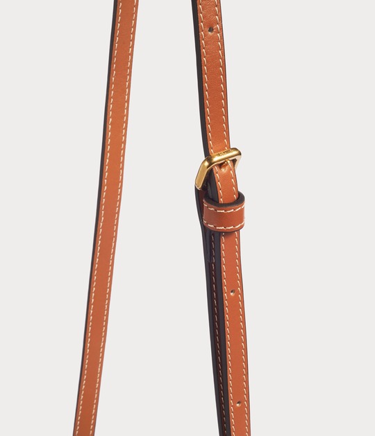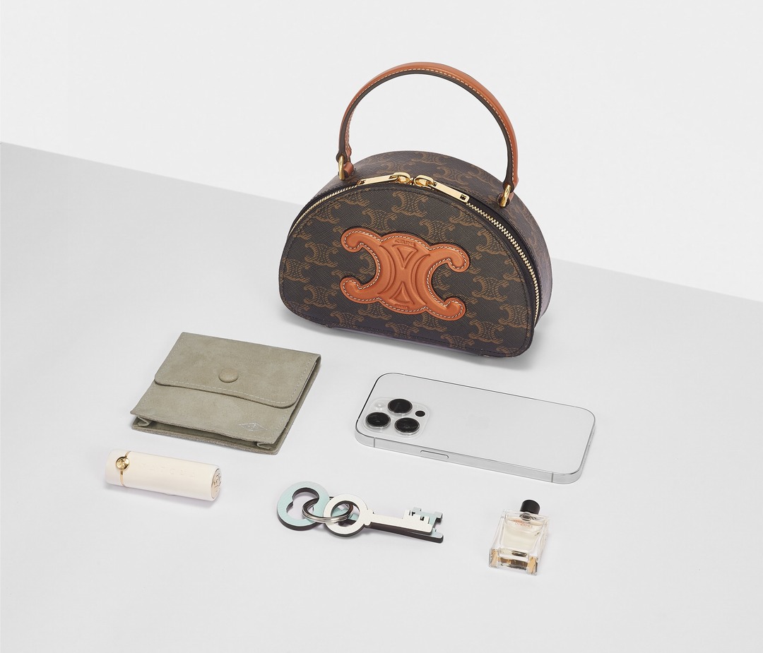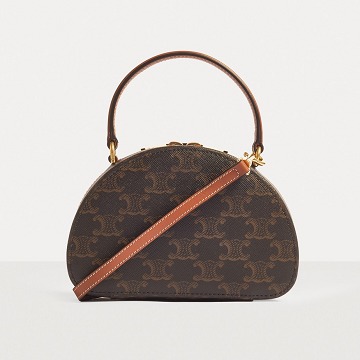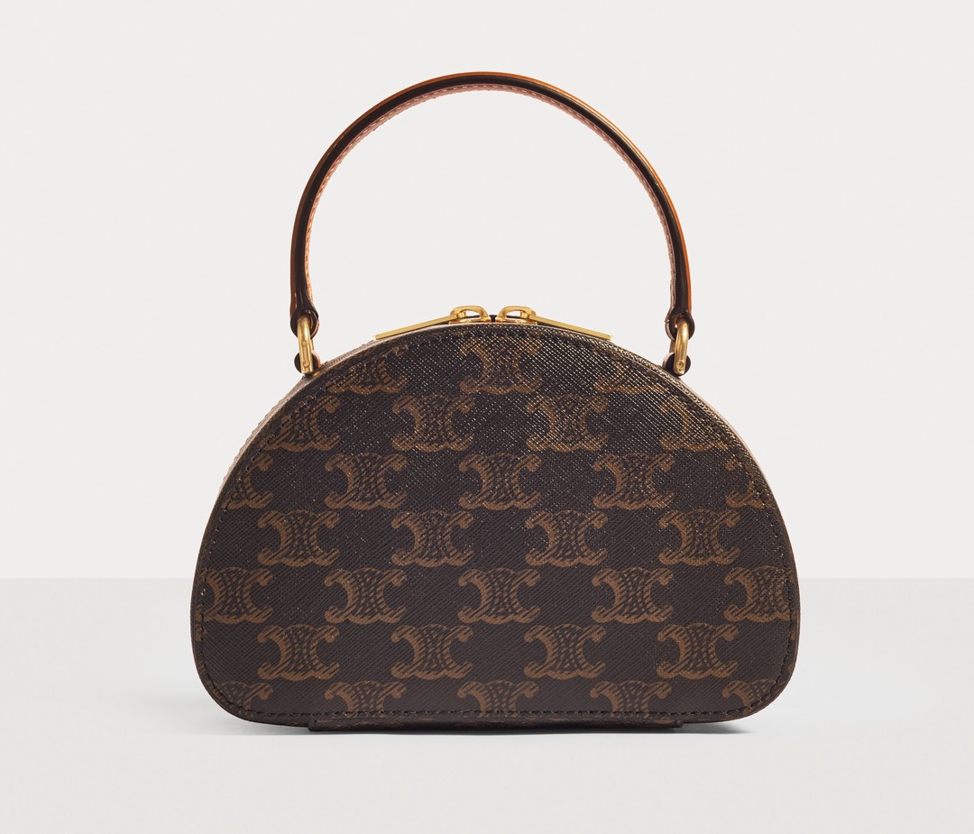 The rounded top of the bag is decorated with an arched handle , and the stiff outline is made of saddle brown calfskin, which makes the whole bag feel round and particularly cute. It is equipped with a detachable and adjustable slim leather shoulder strap for easy shoulder or crossbody carrying.