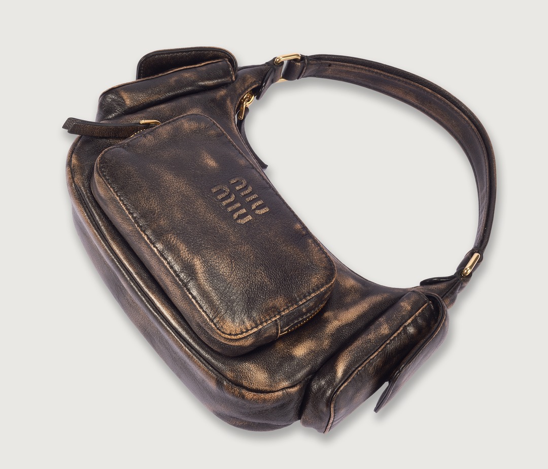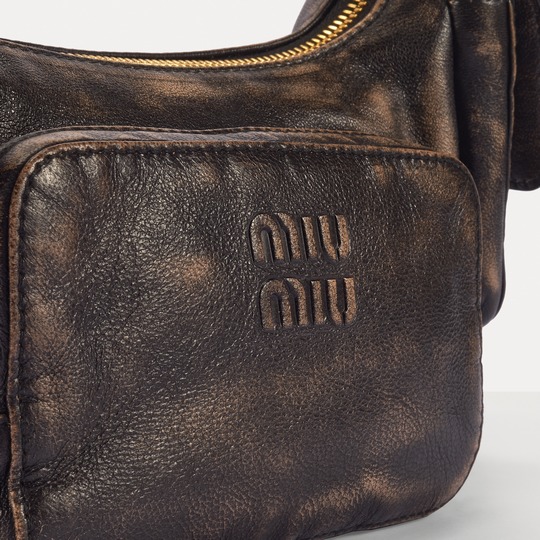 This Pocket shoulder bag adopts the popular Hobo bag shape, with a crescent-shaped opening and a smooth curved cut that fits the shoulder line comfortably. The Multipocket design injects a handsome workwear style into the bag and makes storage orderly. The MIU MIU logo is embossed on the front of the bag, and the flap pockets on both sides are opened and closed with magnetic buckles, making it easy to take out small items such as AirPods and tissues.