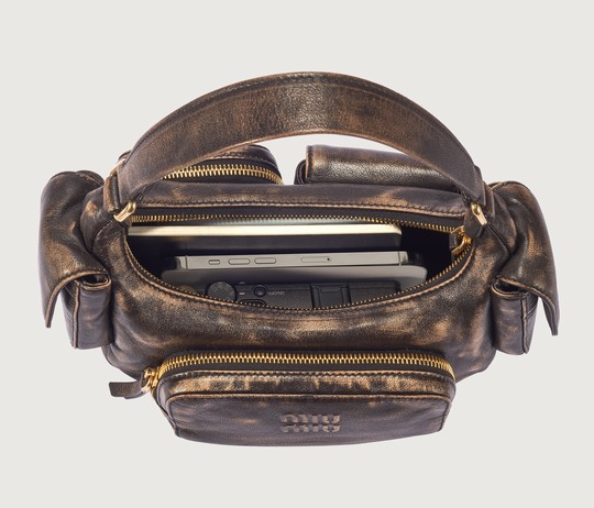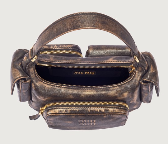 The lining of the bag is made of black cotton satin with a Miu Miu metal logo patch. The 5 pockets plus the main compartment make the total storage space 6 , making the small shoulder bag super large and can be sorted. We put a camera, glasses, mobile phone, notebook, makeup items and keys in the bag. If you make good use of the 5 small pockets, the functionality will be up~