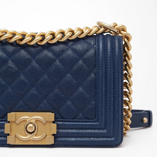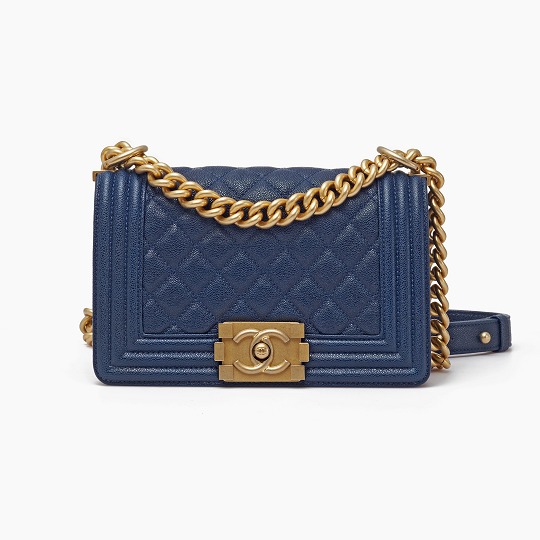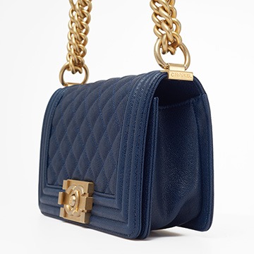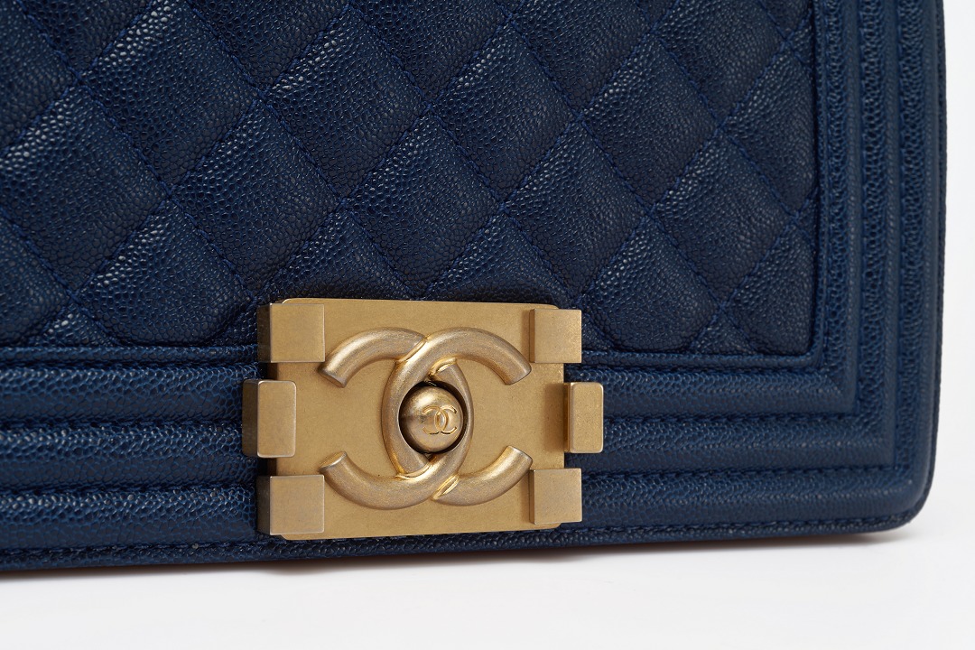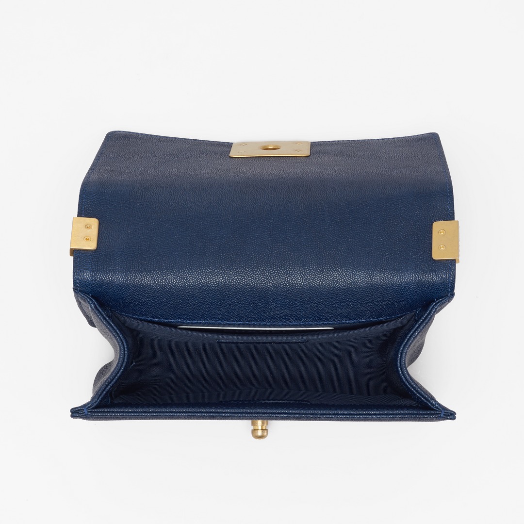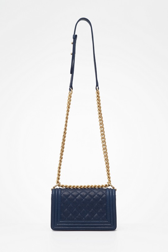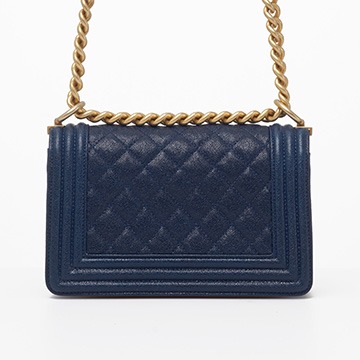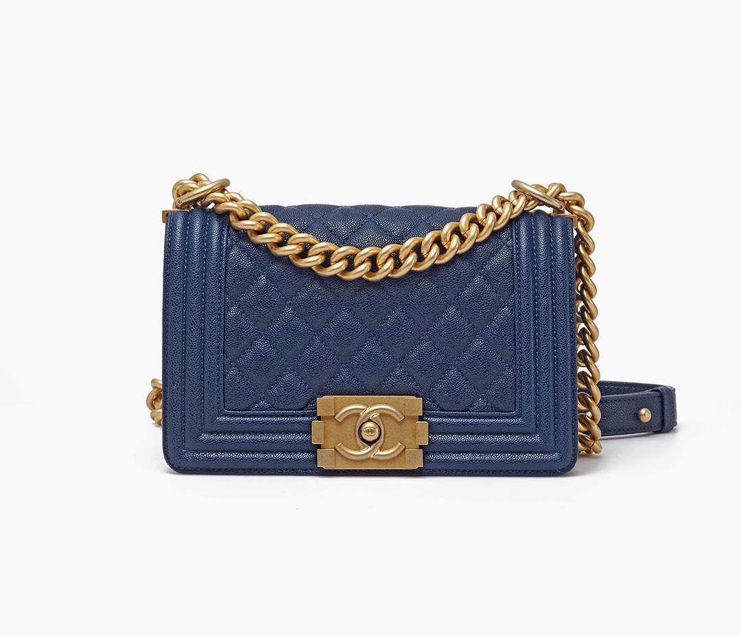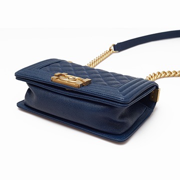 Le Boy is the most boyish of Chanel's classic bags . It is inspired by the hunting bullet clip of founder Coco Chanel . The tough silhouette is matched with a rugged chain shoulder strap, and the flap is embellished with a square retro lock . The navy blue grained calfskin highlights the high-end texture and exudes a faint luster.