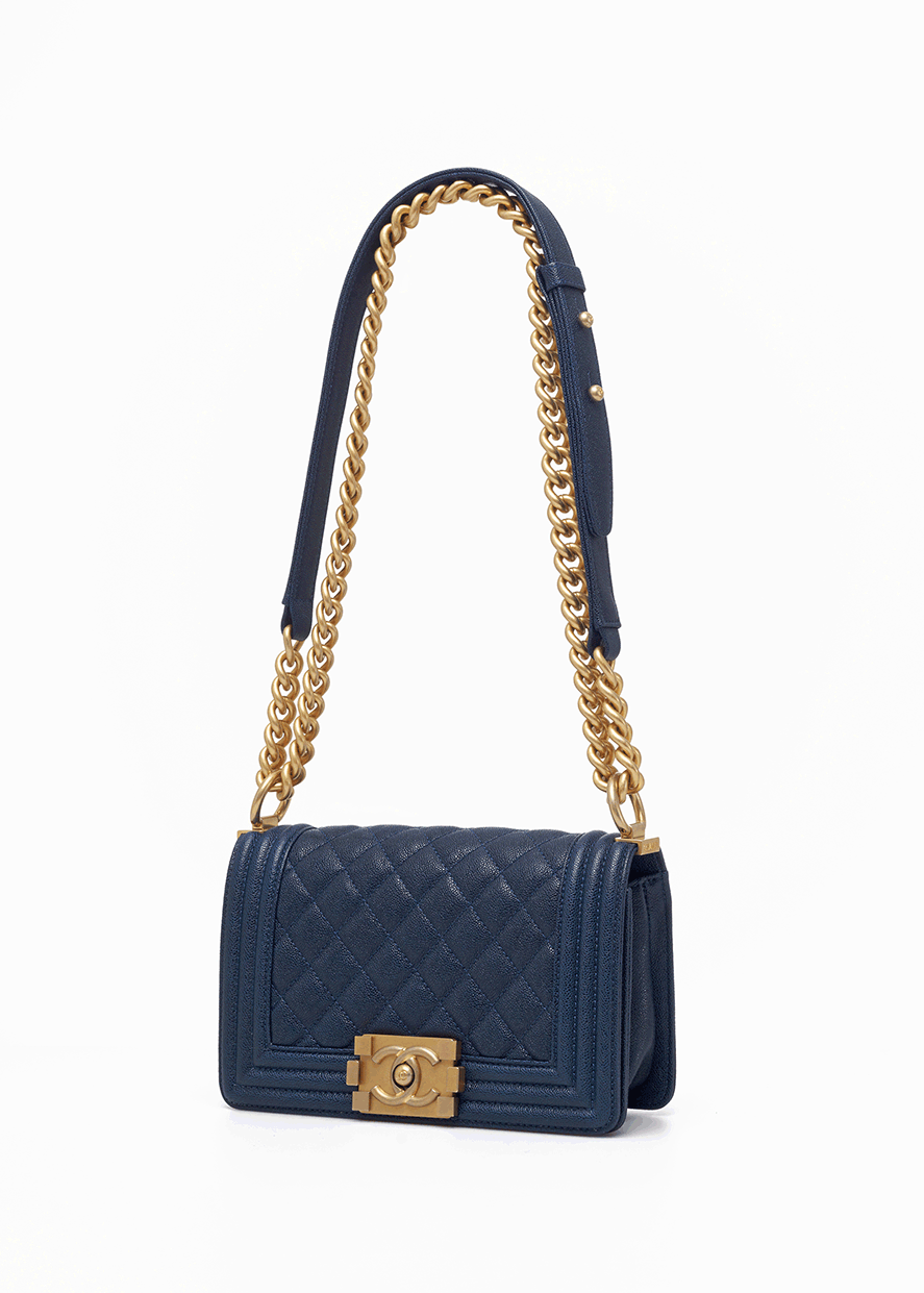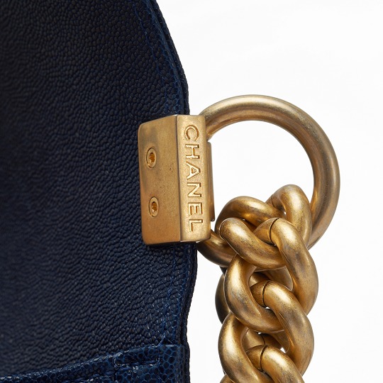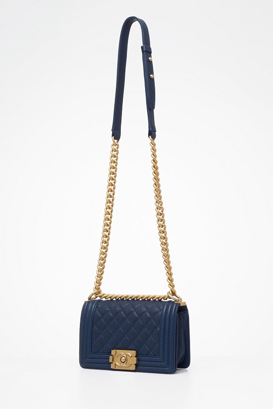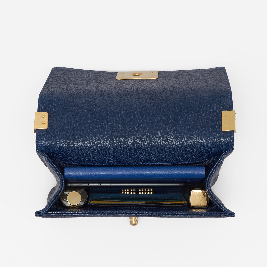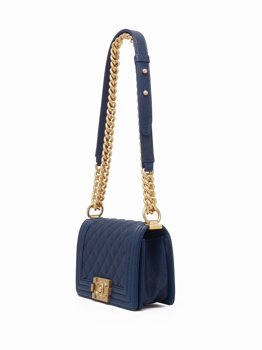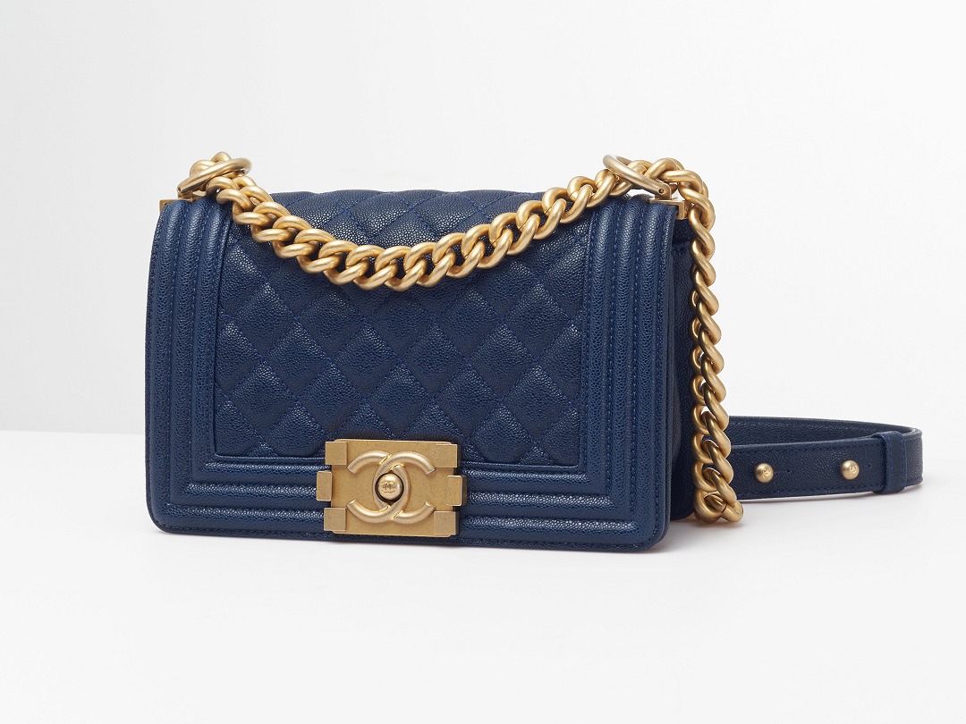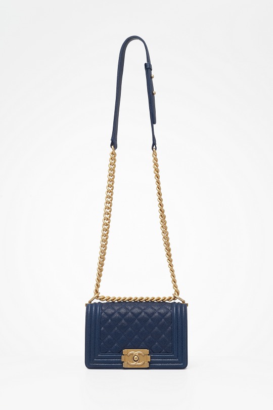 Le Boy is the most boyish of Chanel's classic bags . It is inspired by the hunting bullet clip of founder Coco Chanel . The tough silhouette is matched with a rugged chain shoulder strap, and the flap is embellished with a square retro lock . The navy blue grained calfskin highlights the high-end texture and exudes a faint luster.