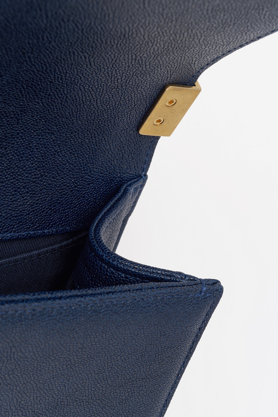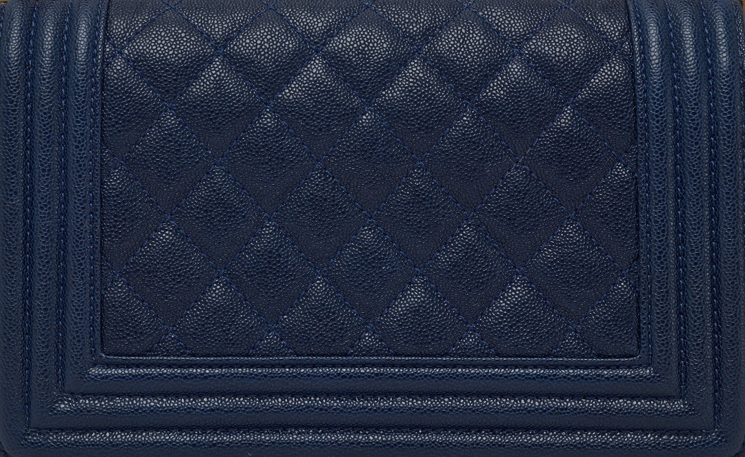 The bag is made of navy blue grained calfskin . The raised grain texture reflects the night sky under the light and has excellent gloss.