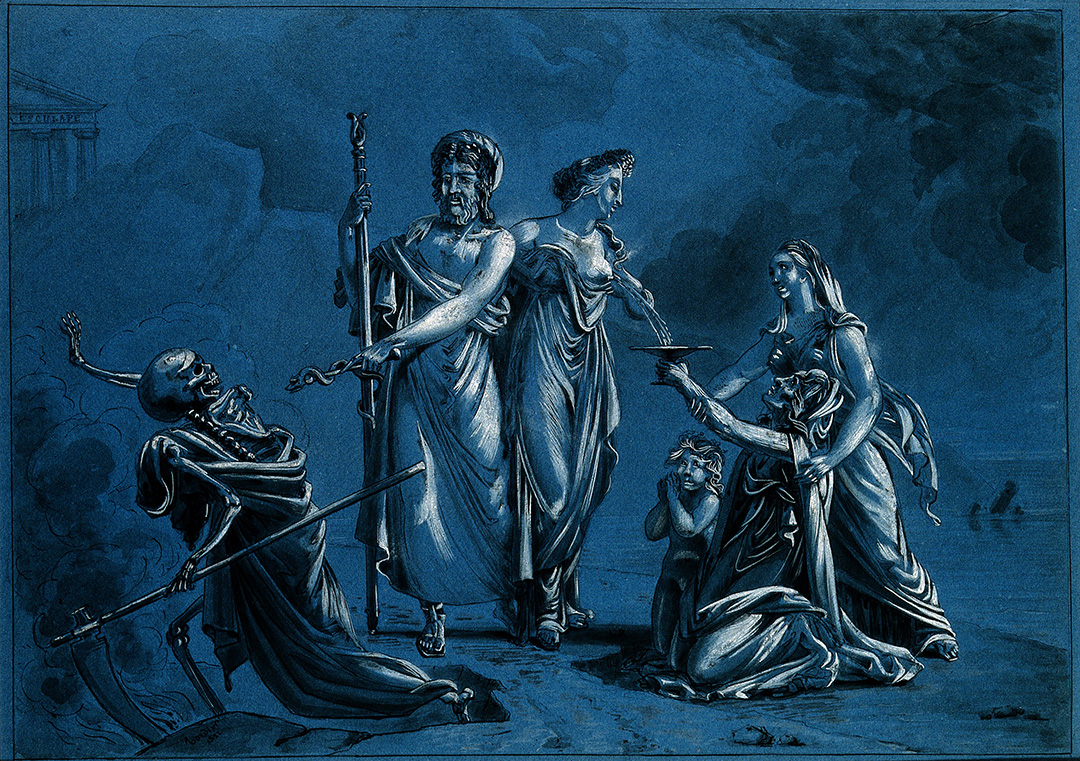 In ancient Egyptian mythology, a serpent was coiled around the scepter of Aesculapius, the god of medicine and healing . Serpent elements made of gems or gold can also be found on the crowns of Egyptian pharaohs and headdresses of queens.