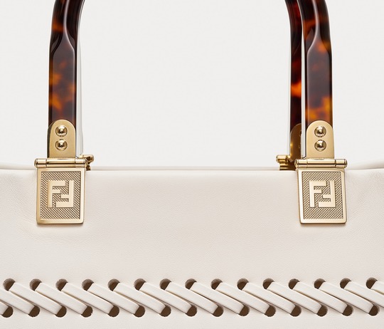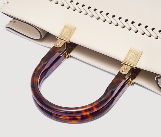 Detailed design is still the focus - the "U"-shaped double handles are made of tortoise-effect plexiglass , and the mottled dark brown translucent texture gives people a deep and classic feeling; the connection between the handles and the bag body is made of rectangular metal , embellished with FF Logo carvings. The hinge design allows the double handles to hang naturally at 180 degrees.