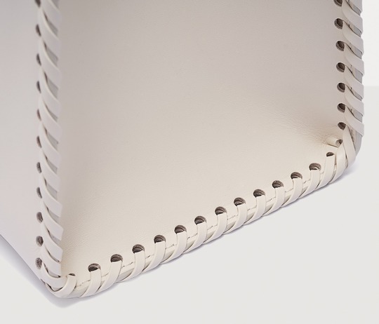 The designer first perforated the edges and details of the bag , and then threaded calfskin trims through the holes in an orderly manner like embroidery , which not only highlights the outline of the bag, but also injects a bit of western cowboy style into the minimalist bag.