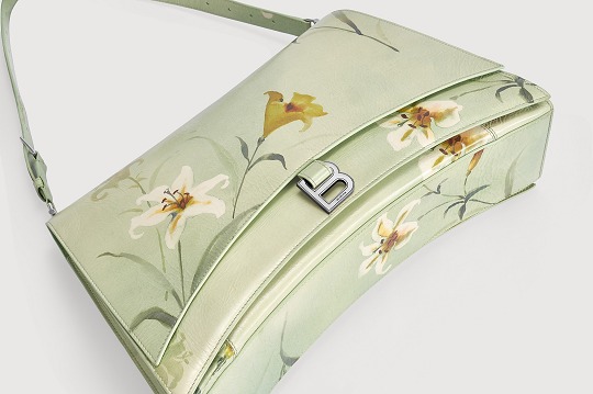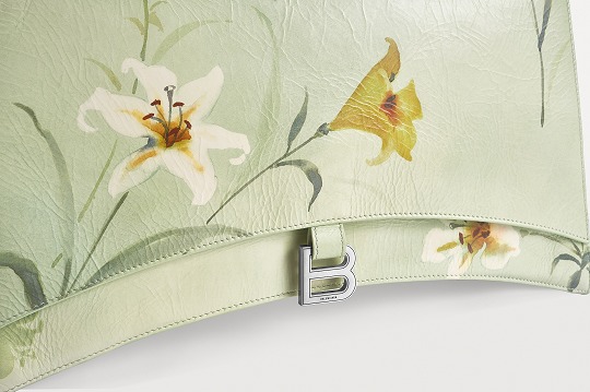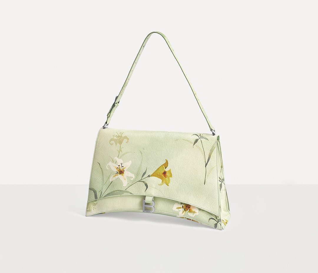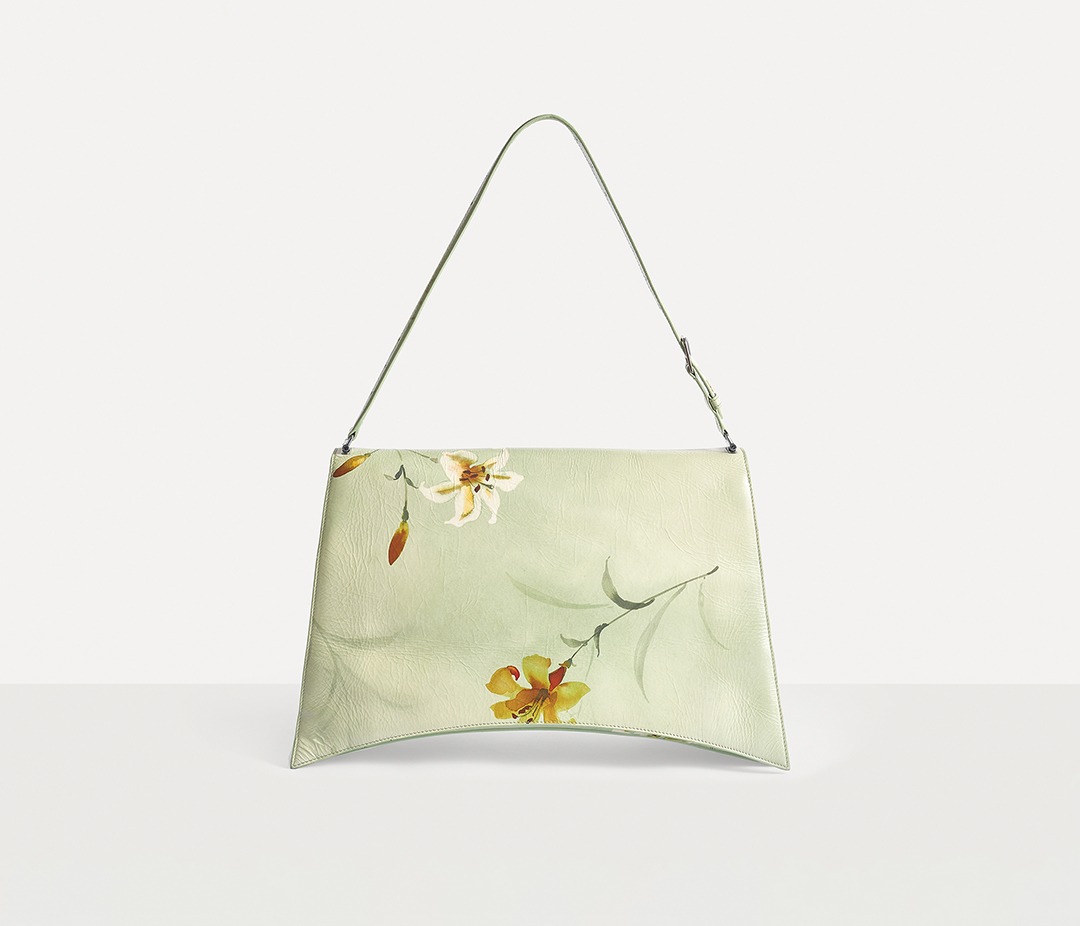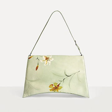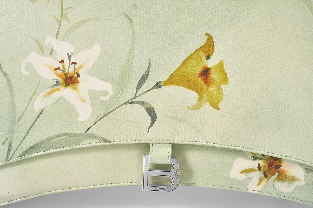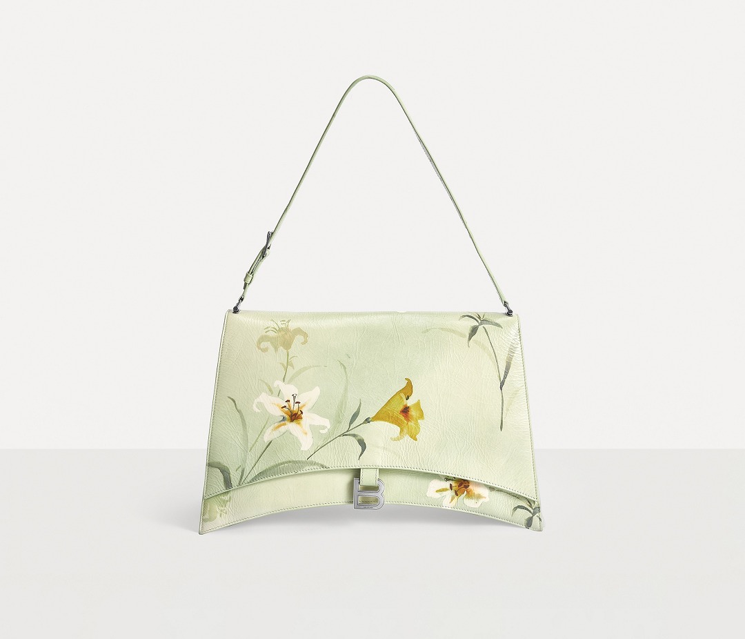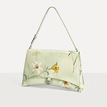 Balenciaga's winter 23 series brings this Crush Lilies large shoulder bag with lily print , continuing the iconic design such as the classic hourglass silhouette and the metal buckle of the letter B. The bag is made of paper-like calfskin with a wrinkled texture. The fresh and tranquil lily print forms a subtle balance with the strong aura of the large bag.