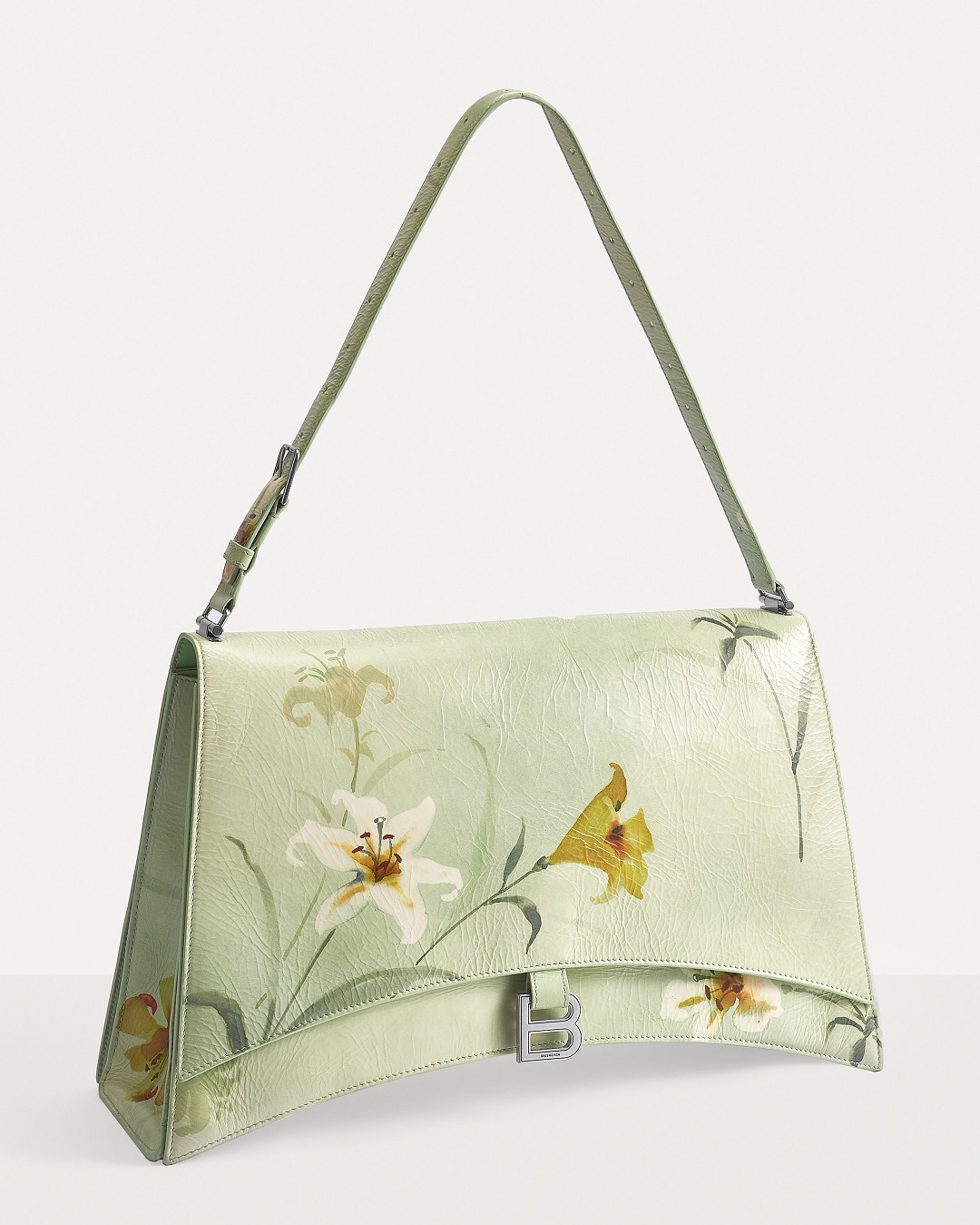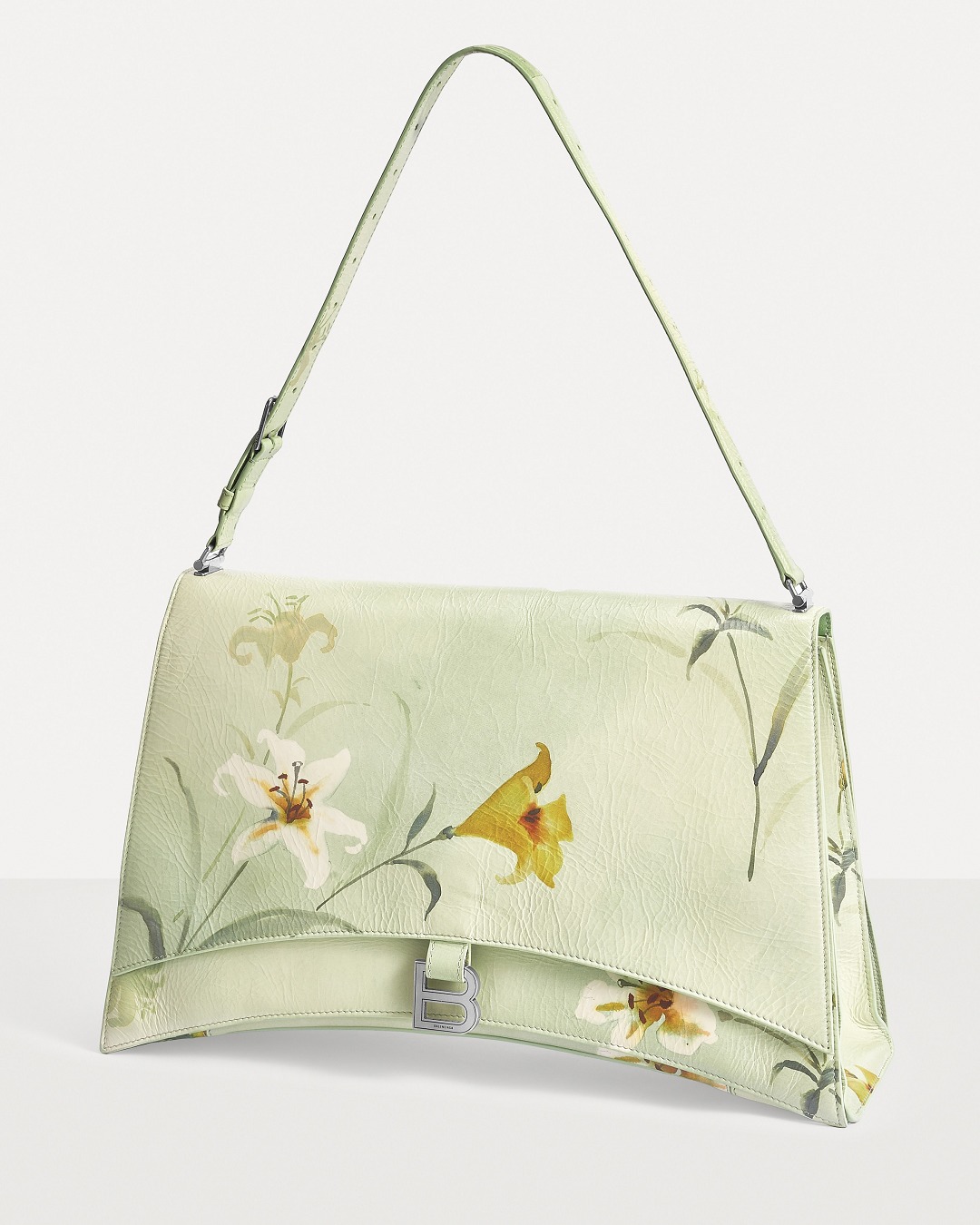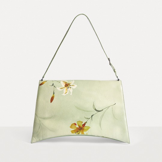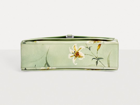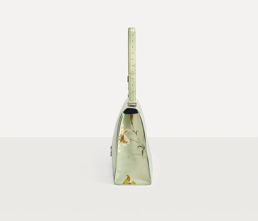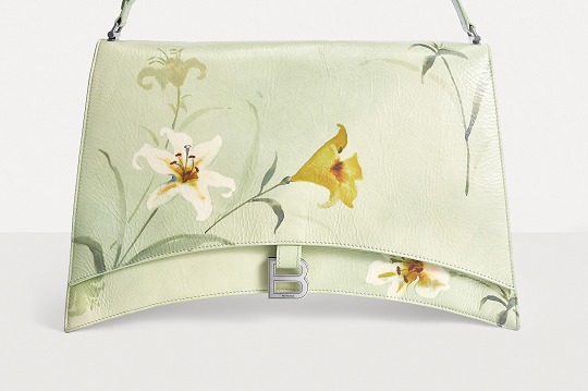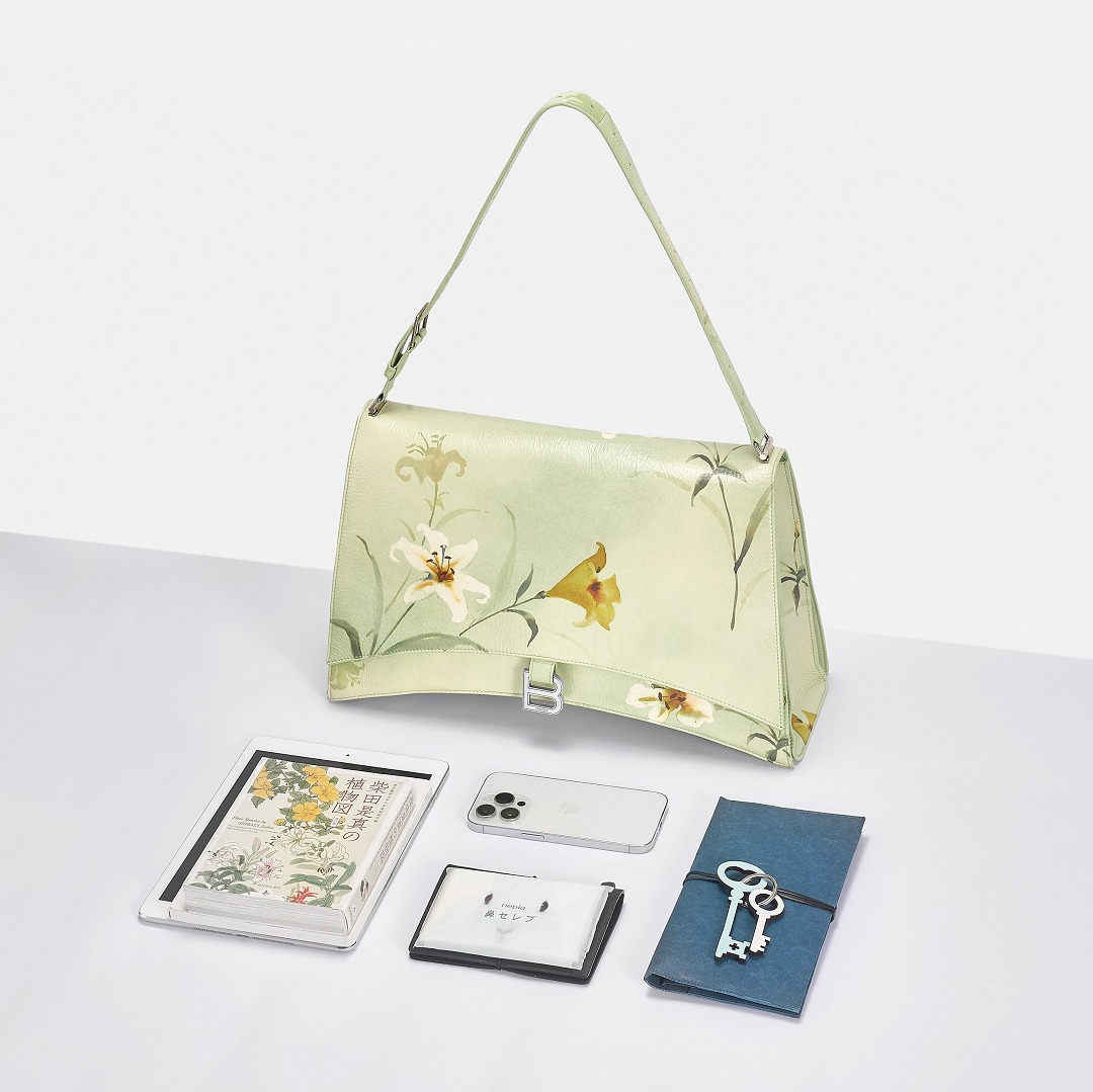 Balenciaga's winter 23 series brings this Crush Lilies large shoulder bag with lily print , continuing the iconic design such as the classic hourglass silhouette and the metal buckle of the letter B. The bag is made of paper-like calfskin with a wrinkled texture. The fresh and tranquil lily print forms a subtle balance with the strong aura of the large bag.